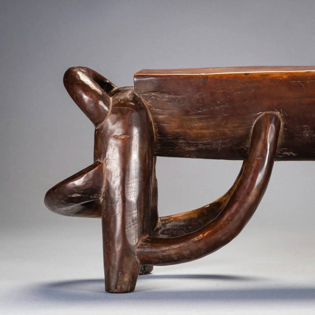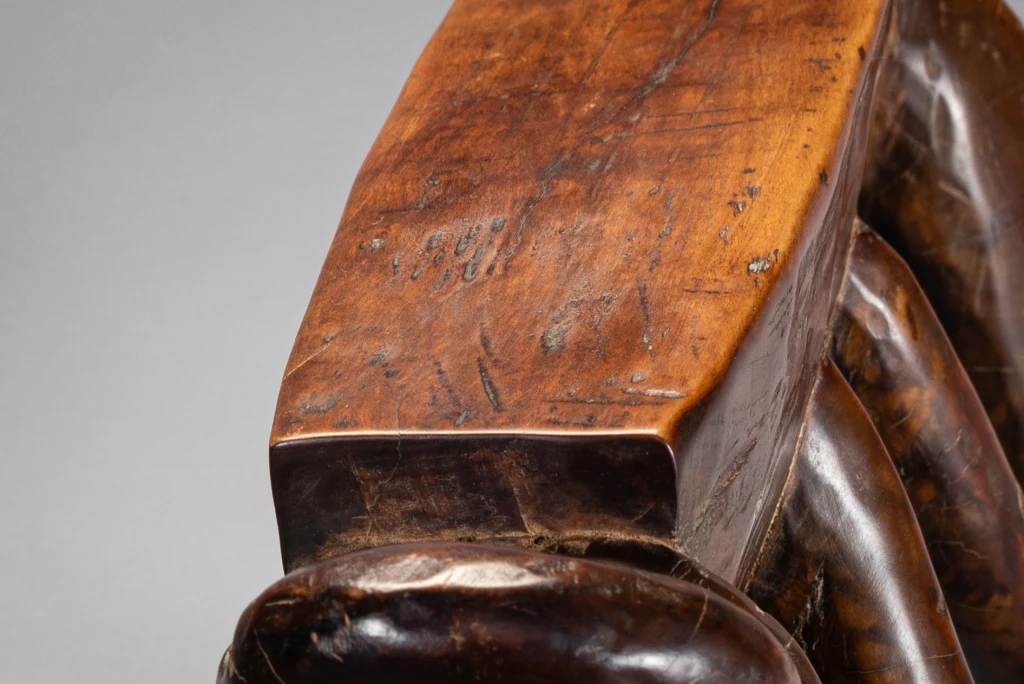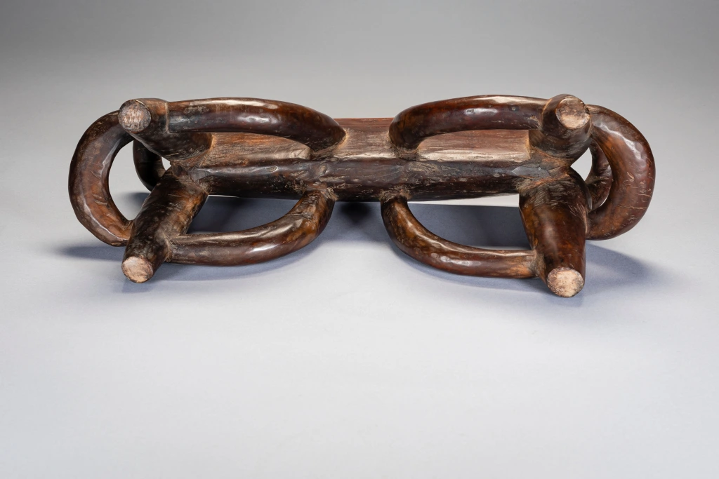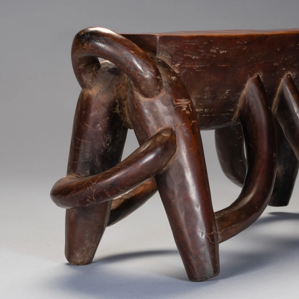 Les anses multiples de cet appui-tête disposées selon une savante symétrie transcendent la figure animale sous-jacente et deviennent prétexte à exprimer une certaine virtuosité. Cet appui-tête repose sur quatre pieds arqués avec des projections en boucle aux deux extrémités. Il a clairement été produit par un sculpteur hautement qualifié qui travaillait probablement pour des clients fortunés. Selon Sandra Klopper, seulement une dizaine d’exemplaires de ce style a survécu, dont cinq se trouvent dans des collections publiques aux États-Unis, au Royaume-Uni, aux Pays-Bas et en Afrique du Sud. La collection Zimer compte trois pièces de ce type.