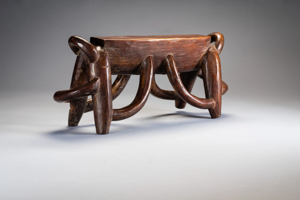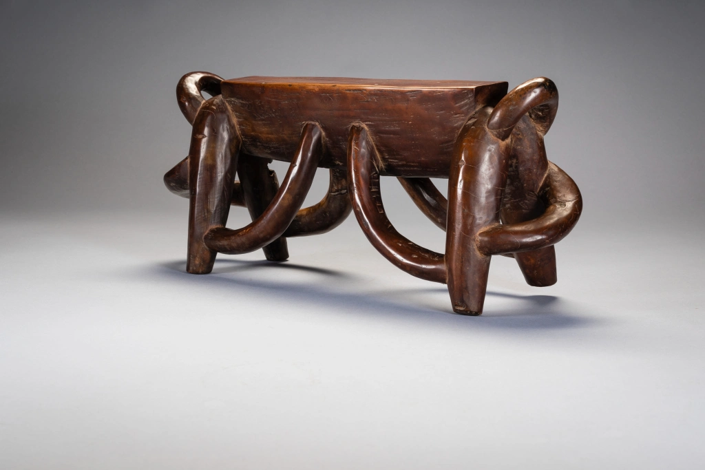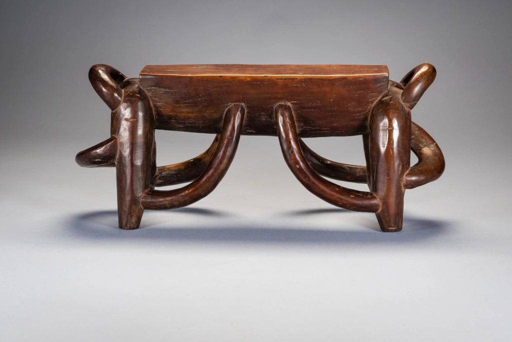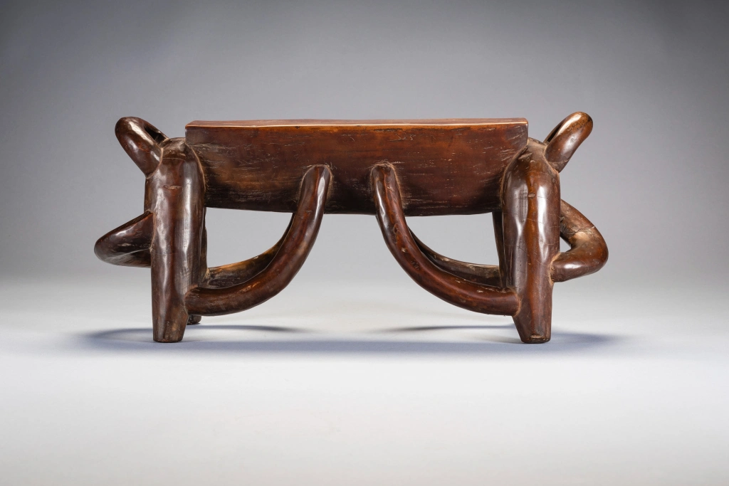 Les anses multiples de cet appui-tête disposées selon une savante symétrie transcendent la figure animale sous-jacente et deviennent prétexte à exprimer une certaine virtuosité. Cet appui-tête repose sur quatre pieds arqués avec des projections en boucle aux deux extrémités. Il a clairement été produit par un sculpteur hautement qualifié qui travaillait probablement pour des clients fortunés. Selon Sandra Klopper, seulement une dizaine d’exemplaires de ce style a survécu, dont cinq se trouvent dans des collections publiques aux États-Unis, au Royaume-Uni, aux Pays-Bas et en Afrique du Sud. La collection Zimer compte trois pièces de ce type.