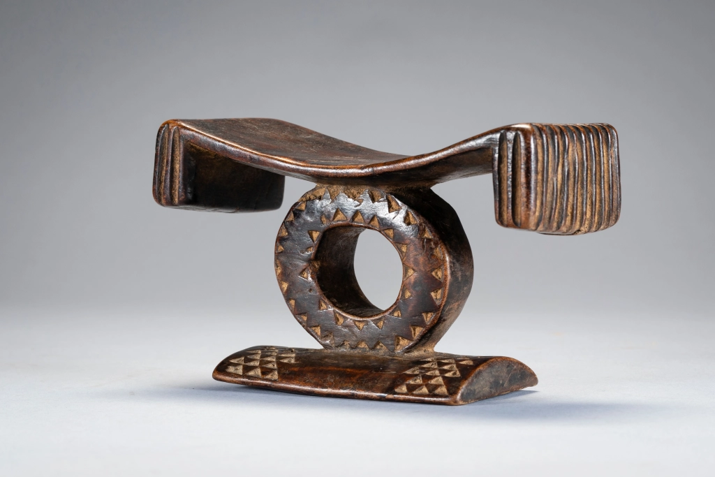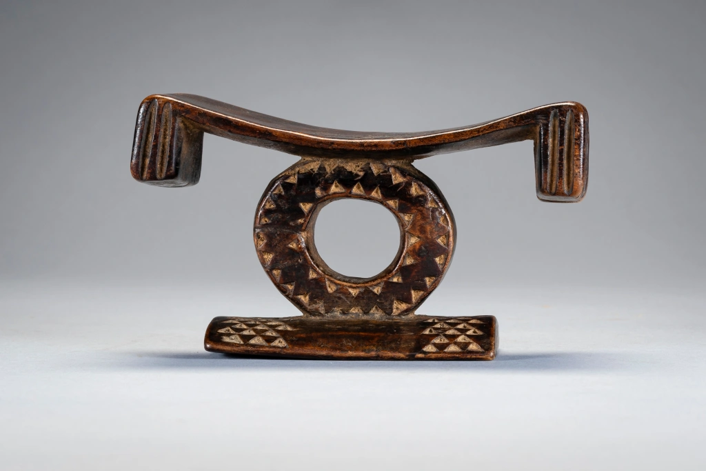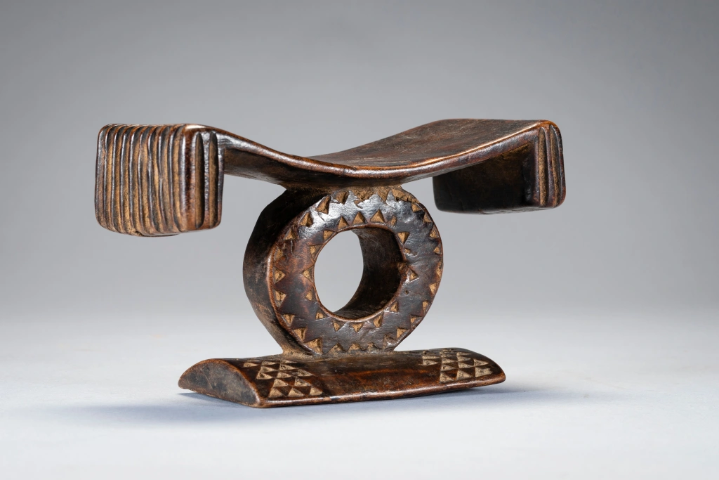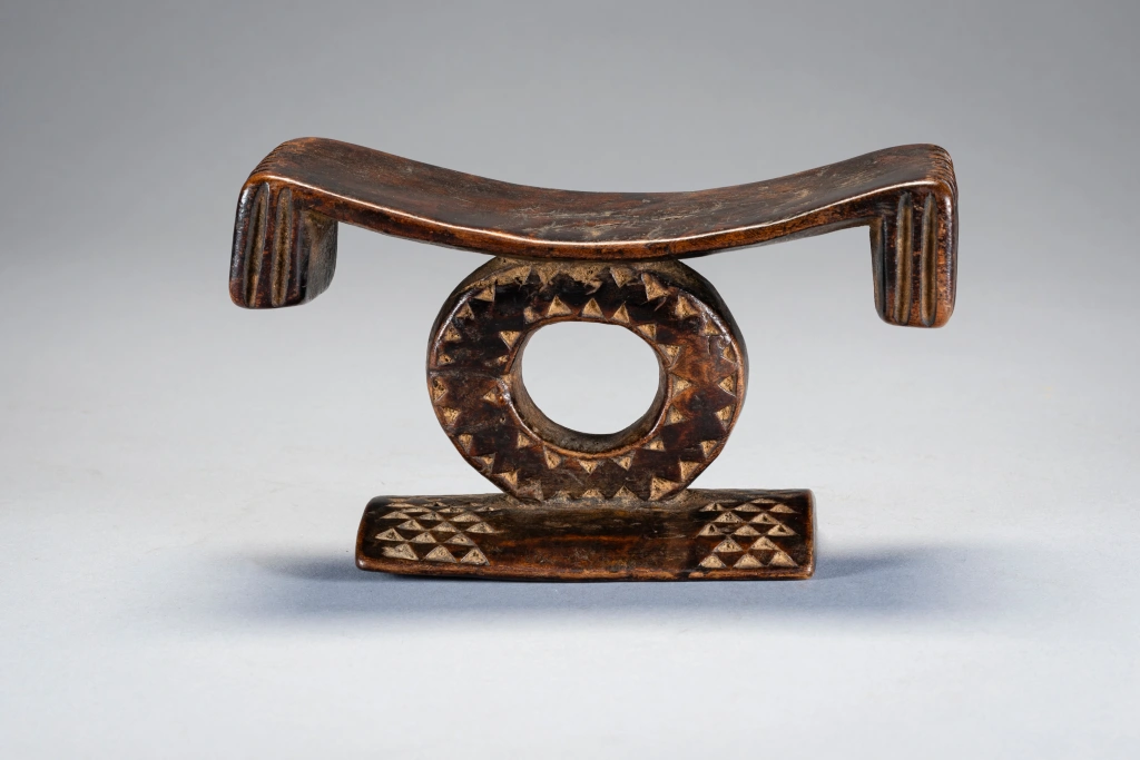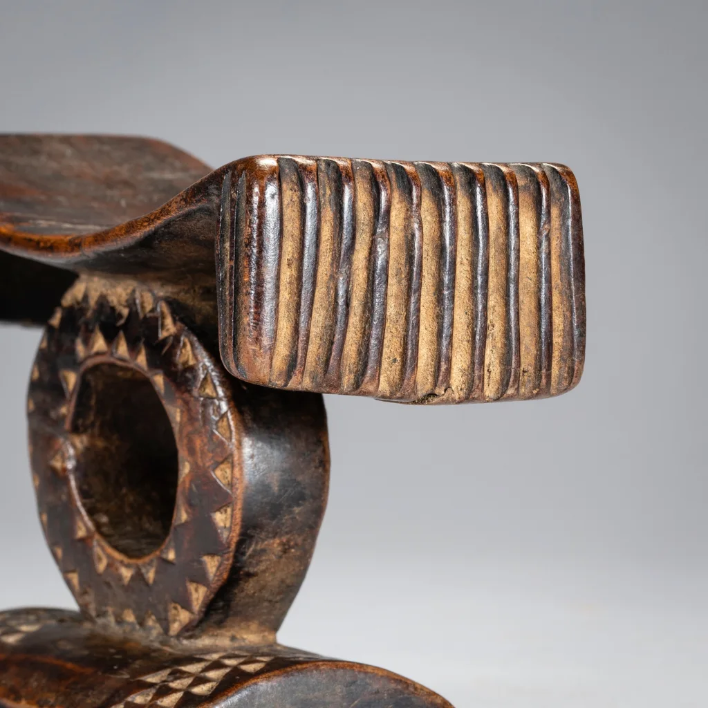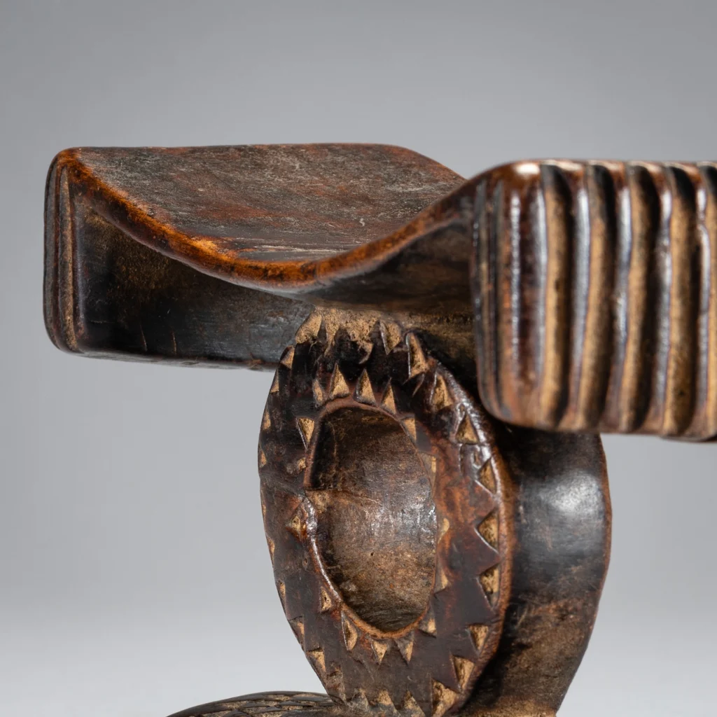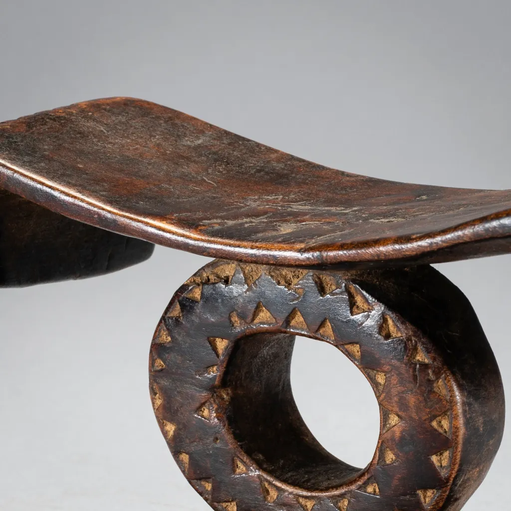 Comme dans beaucoup d’appuis-tête en forme de cercle on ressent l’influence Tsonga. Ici car la plateforme se termine par des extrémités retombantes, ce qui permet de situer l’origine de cette pièce (plutôt dans le Nord Est du Kwazulu). La forme circulaire est due à l’apparition du chemin de fer dans cette région ce qui permet de dater approximativement la pièce. L’originalité de cette dernière provient de la toute petite taille du cercle central (8cm) autant que la faible longueur du socle. A noter enfin dans les éléments remarquables les cannelures à la mode swazi des retombées de la plateforme faisant ainsi un superbe melting-pot Zoulou Swazi Tsonga !