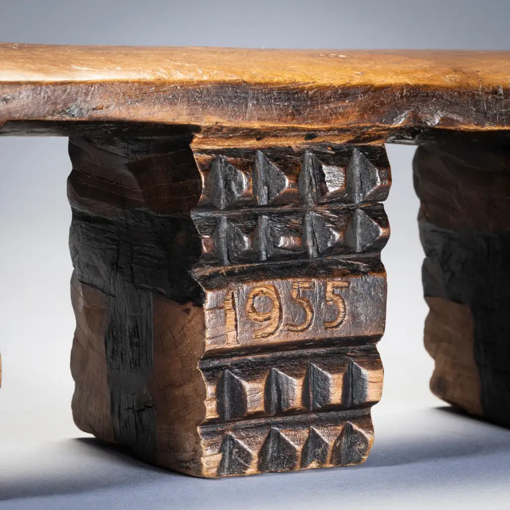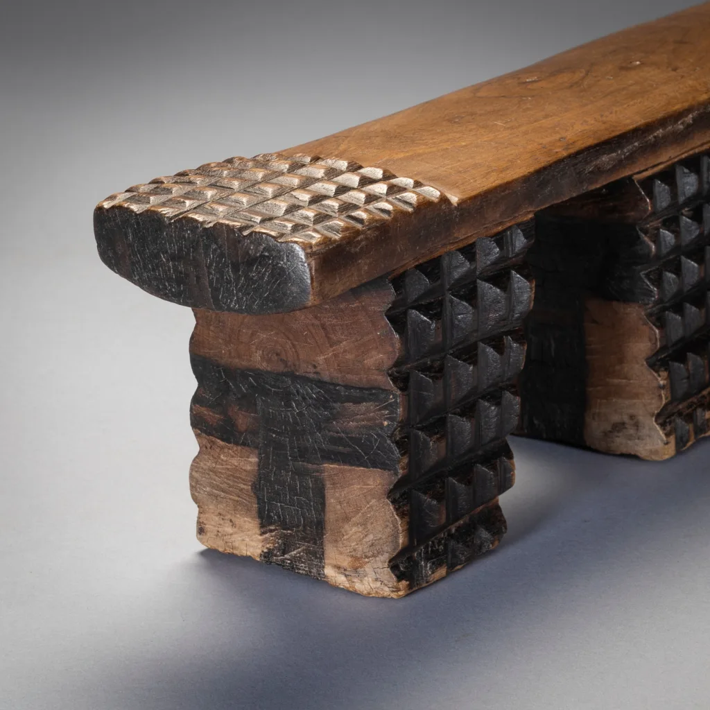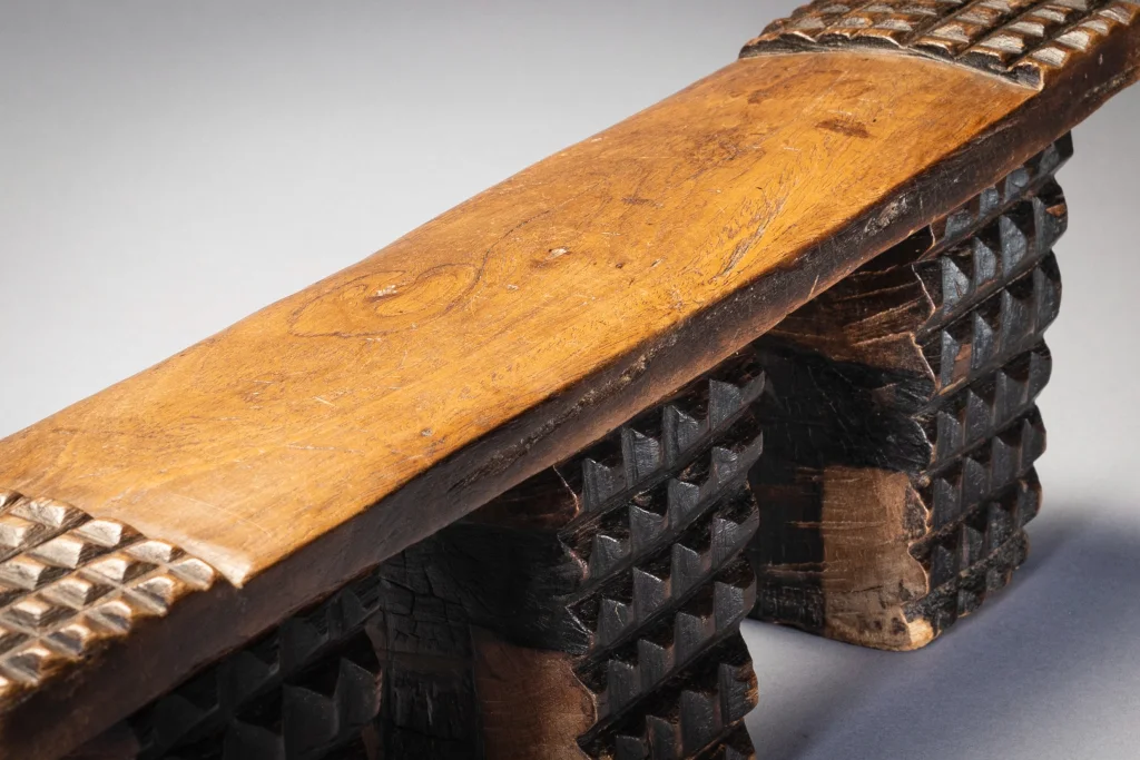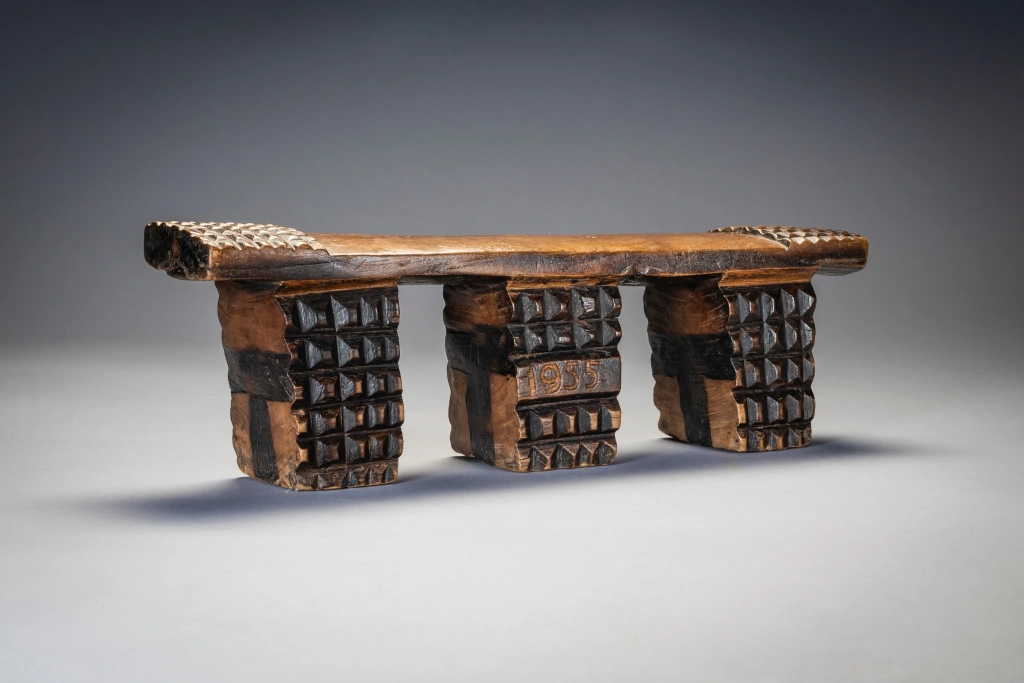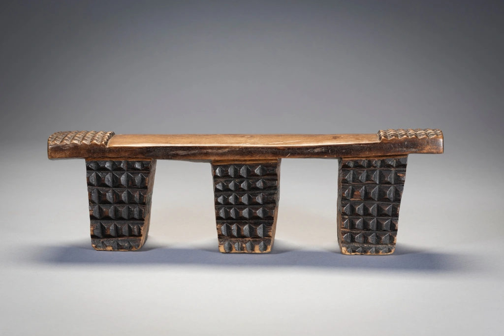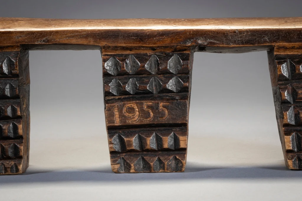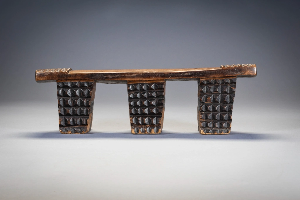 Un superbe et ancien appui-tête zoulou avec trois pieds robustes. Il s’agit d’un bel exemplaire du milieu du XXe siècle, il est simplement sculpté.Les appuis-tête zoulous sont connus sous le nom d’Isigqiki (Izigqiki) ou Isicamelo. Les plus élaborés sont plutôt associés aux chefferies. Autrefois, avant leur mariage, les femme zouloue faisaient sculpter un appui-tête pour leur futur mari et un autre pour elles-mêmes, qu’elles offraient à leur époux lors de leur mariage, dans le cadre de leur trousseau de mariage (Umaho). La mariée pouvait également recevoir un appui-tête comme cadeau de mariage de la part de son beau-père. On peut noter sur cette pièce la date 1955 probablement du mariage et bien que de forme classique son originalité par la présence de larges T pyrogravés sur les faces internes des pieds.