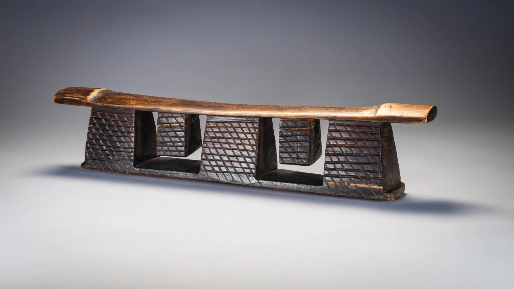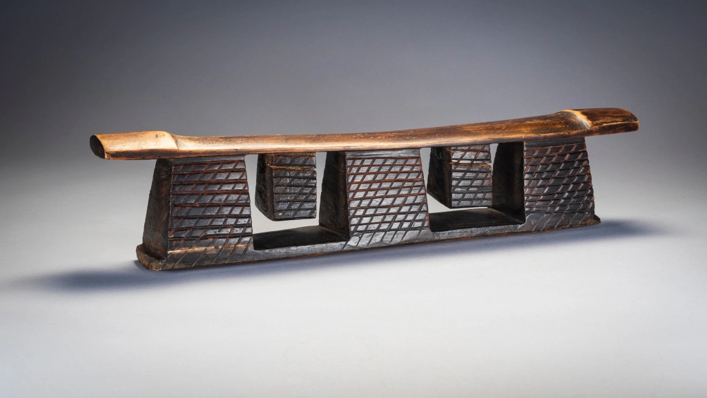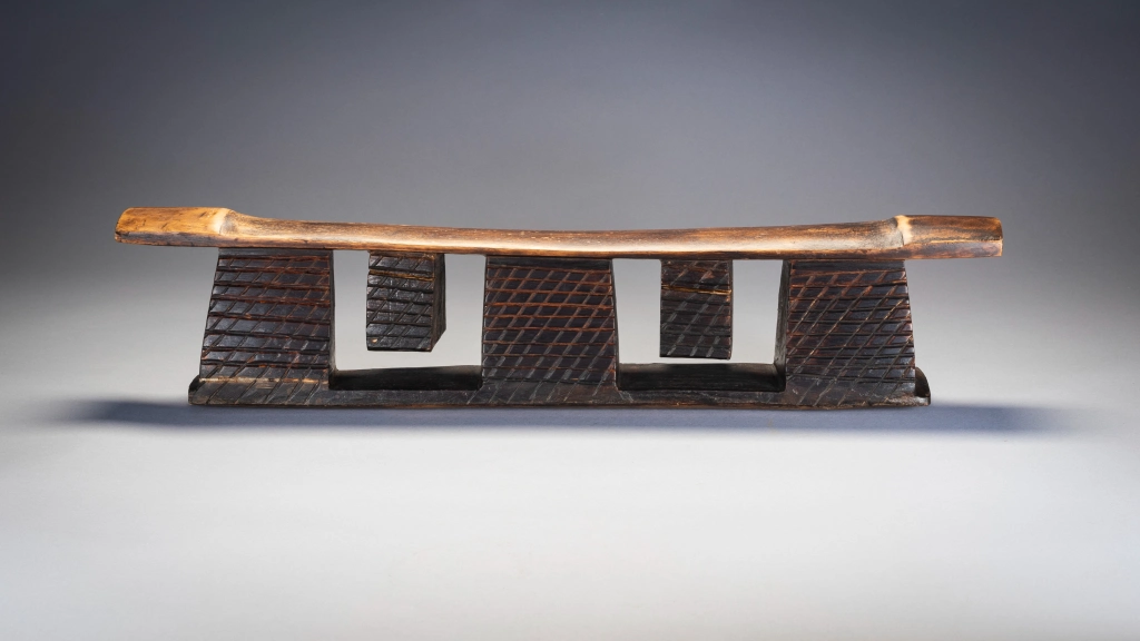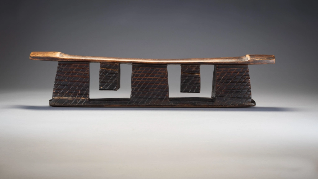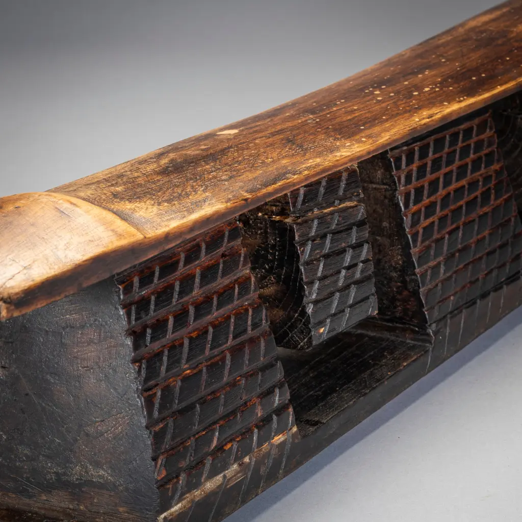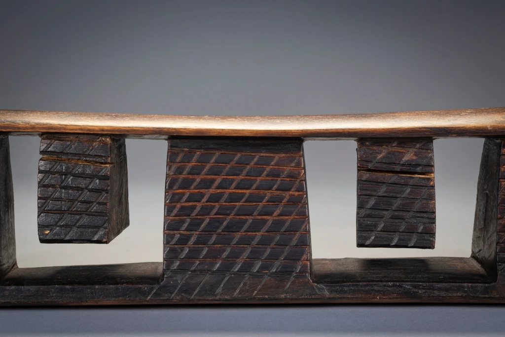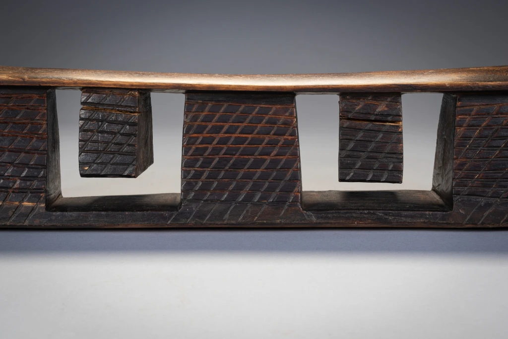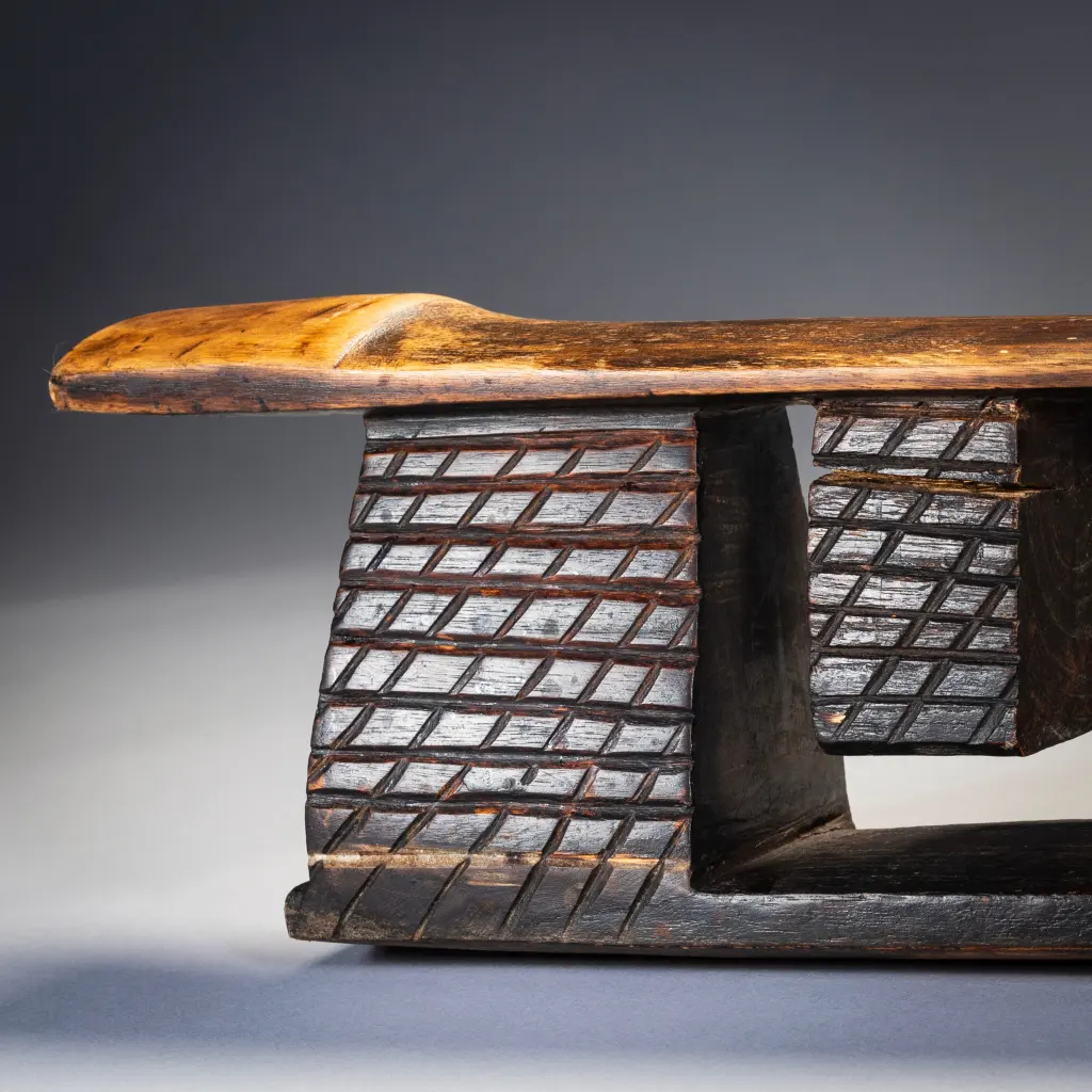 Un appui-tête avec une forme originale. Il possède deux tétons suspendus à la plateforme entre trois de ses piliers. Cette pièce semble être « l’opposé » de l’appui-tête Z24 et pourrait être de la même région et/ou de la même « école de sculpteurs ». A noter les renflements sobres et élégants aux extrémités de la plate-forme. Enfin les craquelures sur les tétons , zones de la pièce sur lesquelles aucun effort ne s’exercent, traduisent des décennies de changement de température au fil des saisons.