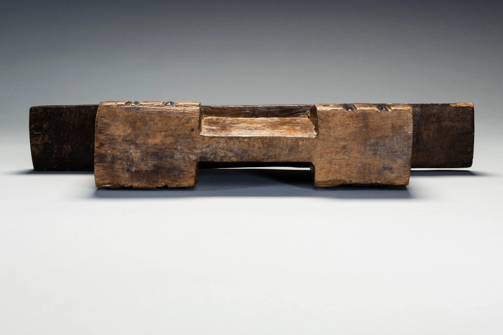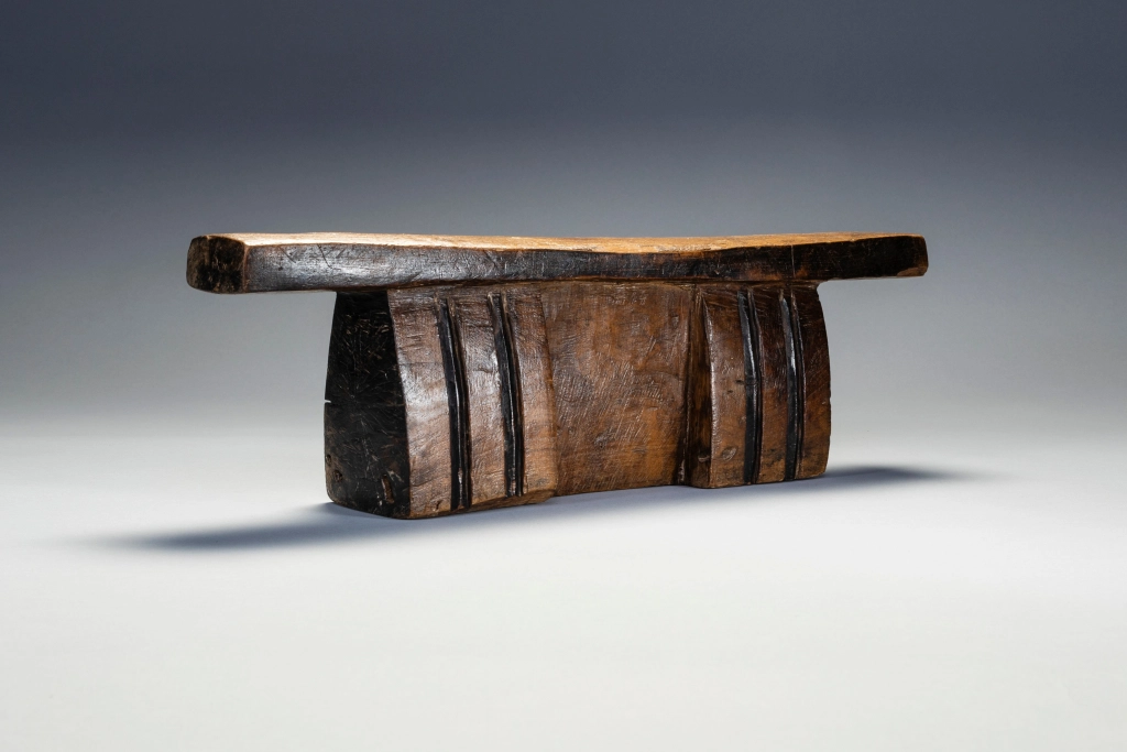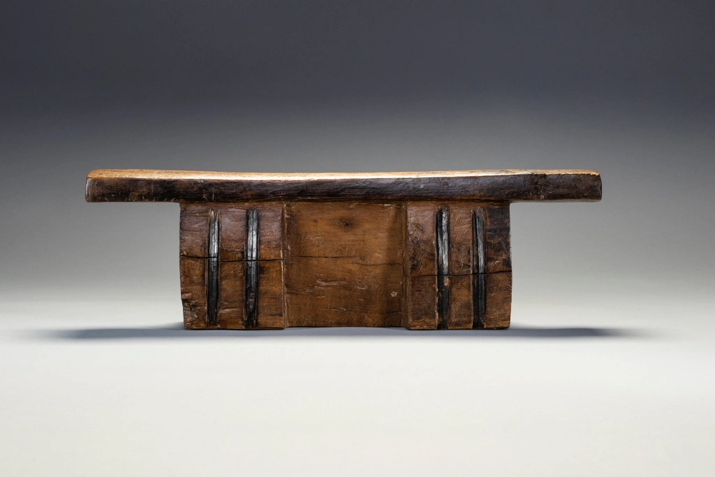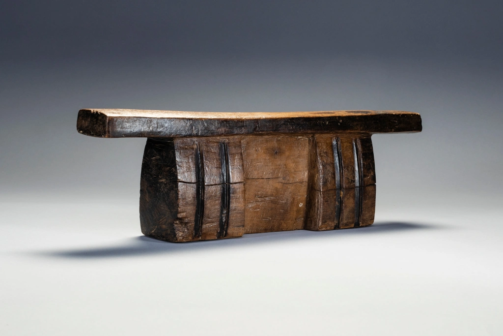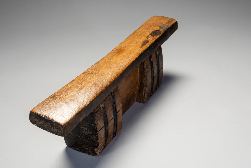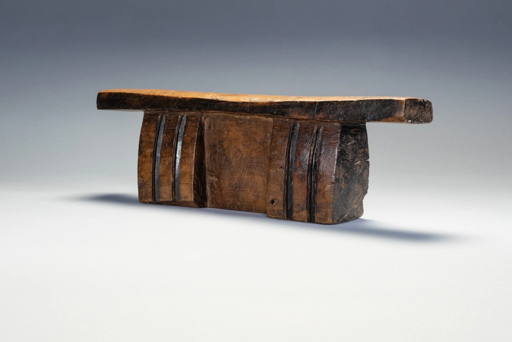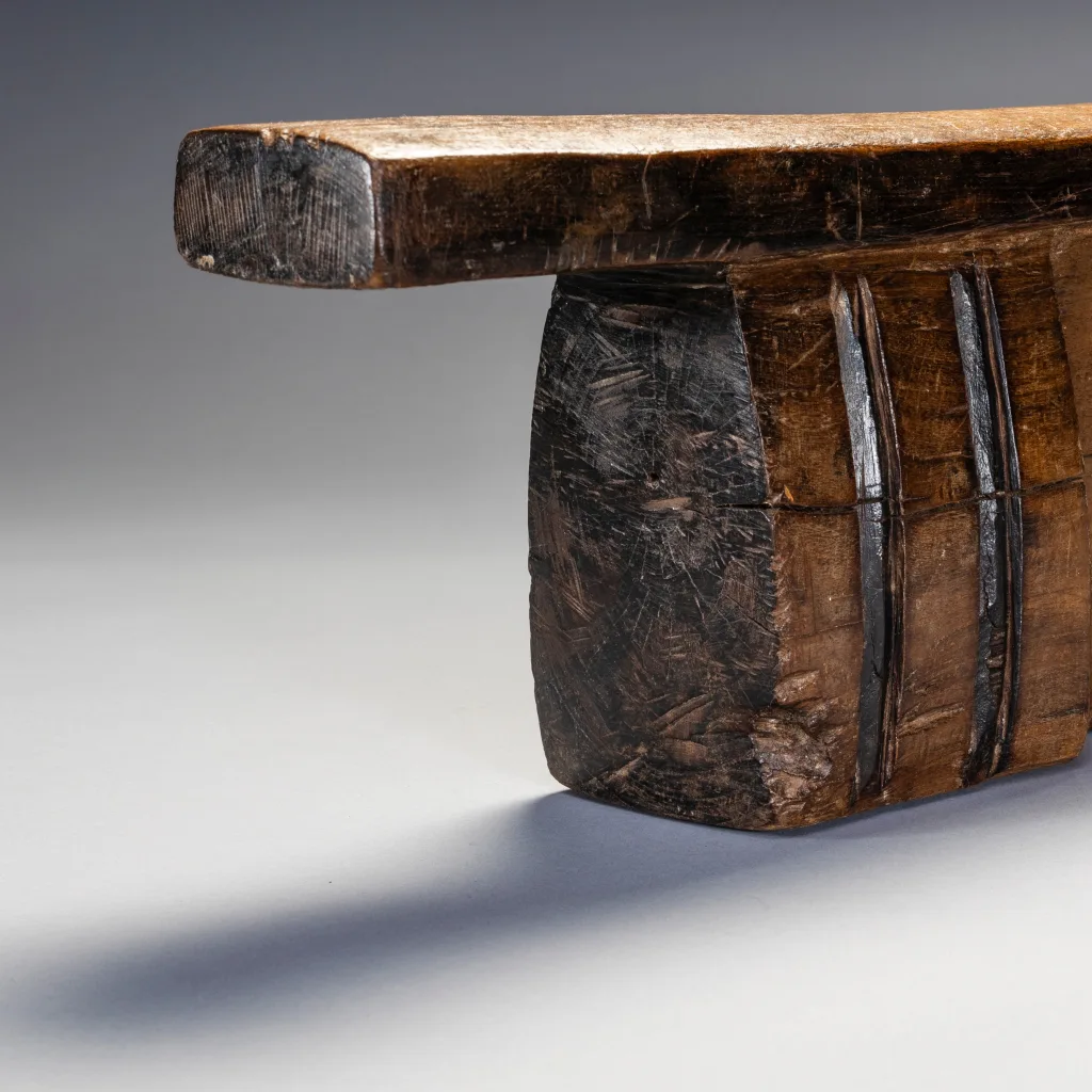 Un appui-tête solide, massif et de plain-pied. On peut trouver une engravure au centre sur l’une des faces, elle contraste avec les deux pieds décorés par des boucles en pyrogravure.