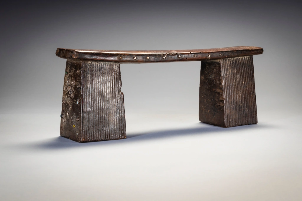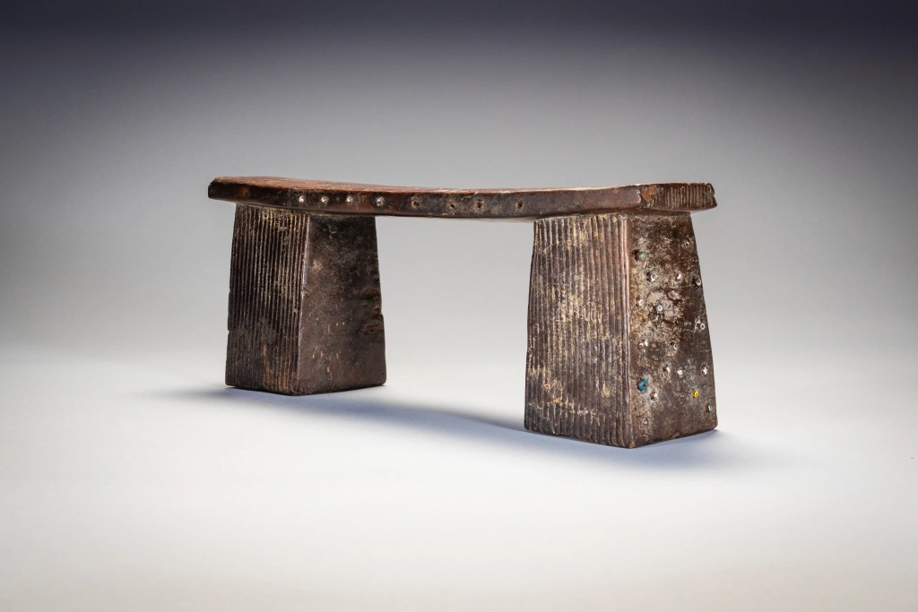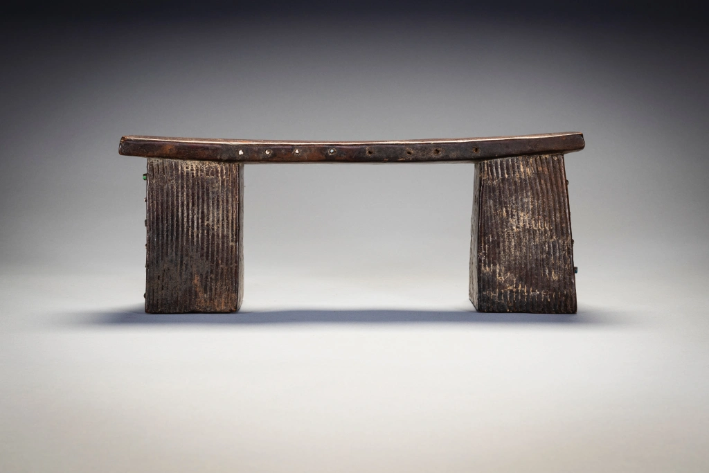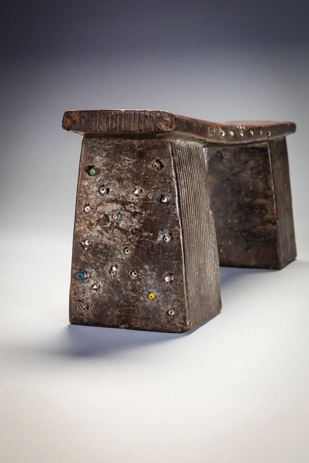 Une forme d’appui-tête classique avec 2 pieds massifs mais finement striés. La puissance de ses pieds s’oppose à la finesse de la plateforme incrustée de brillants sur l’épaisseur.