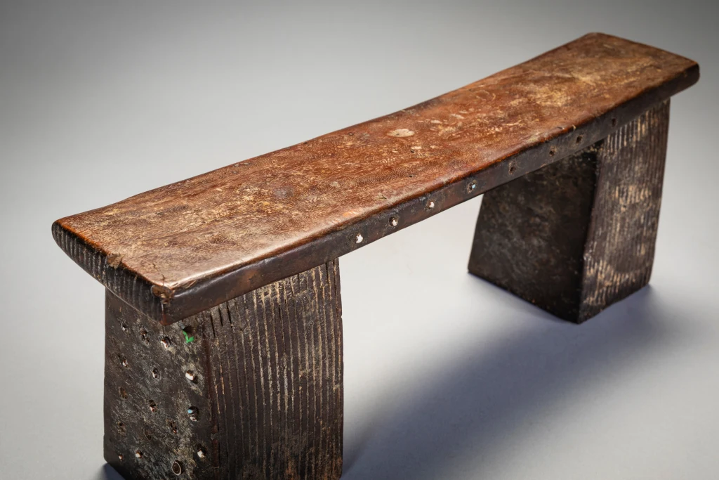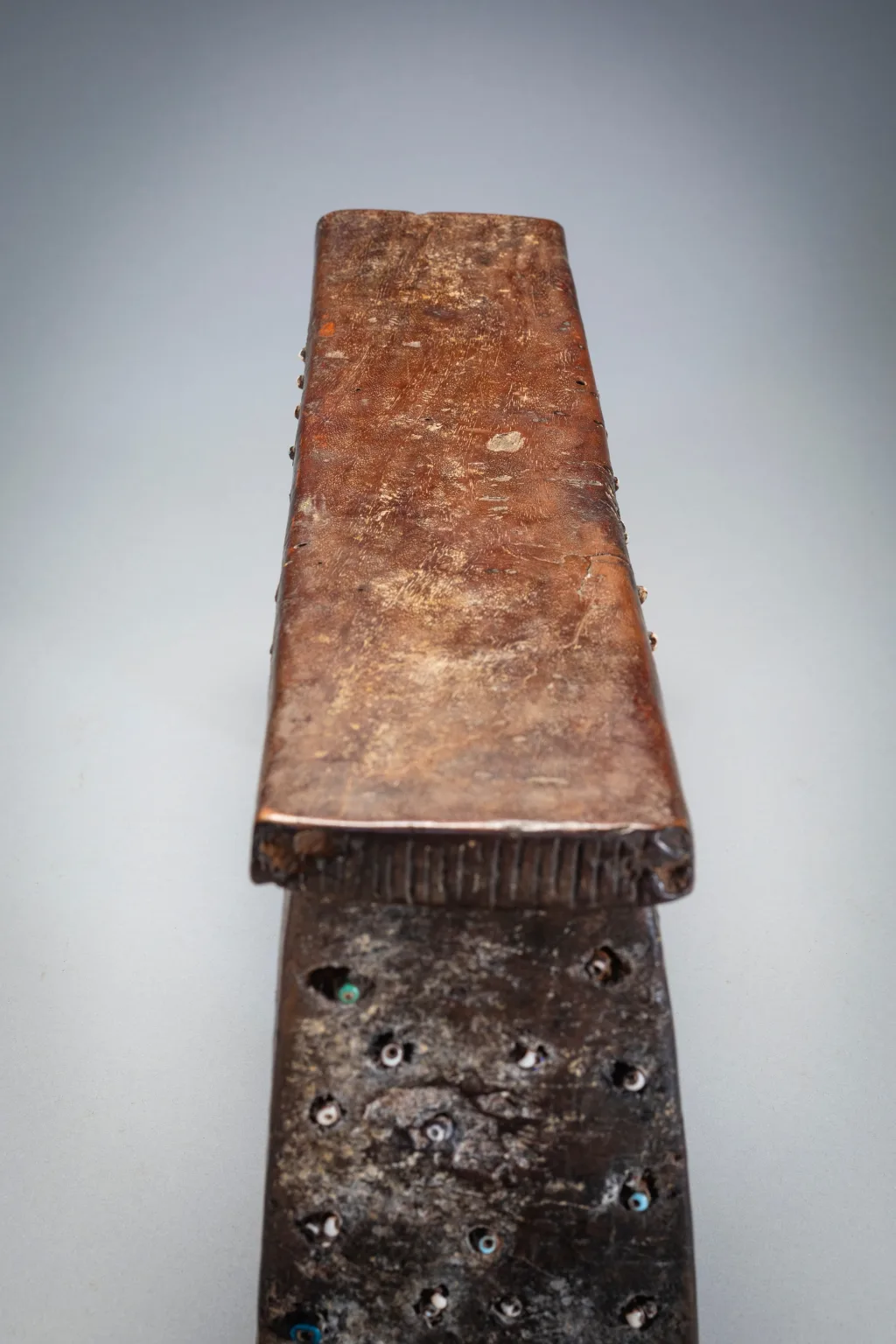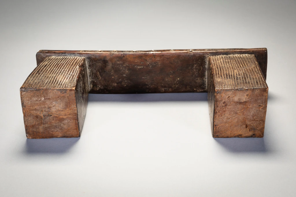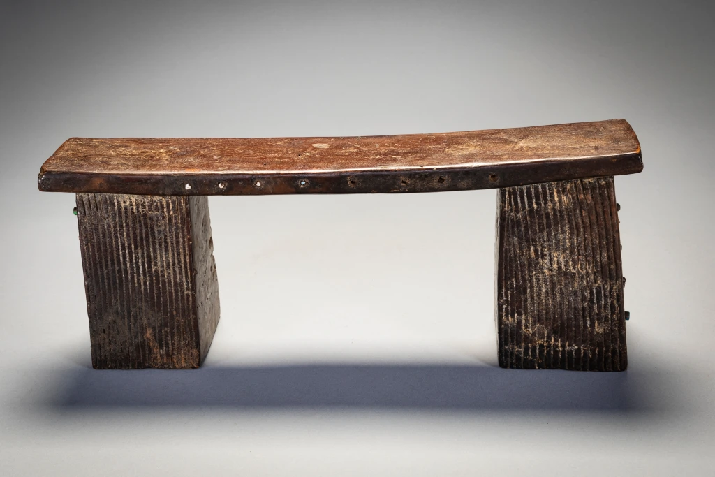 Une forme d’appui-tête classique avec 2 pieds massifs mais finement striés. La puissance de ses pieds s’oppose à la finesse de la plateforme incrustée de brillants sur l’épaisseur.