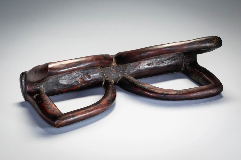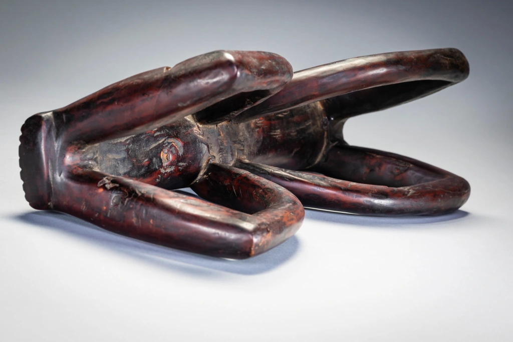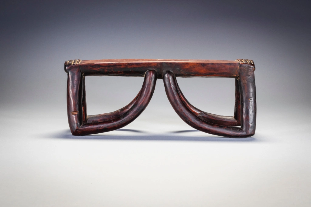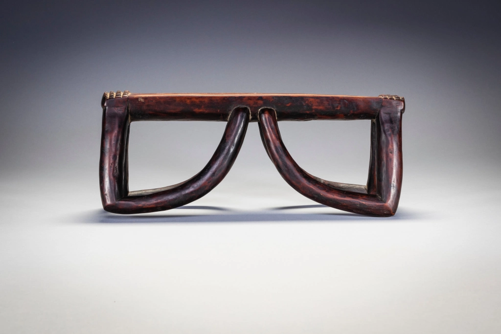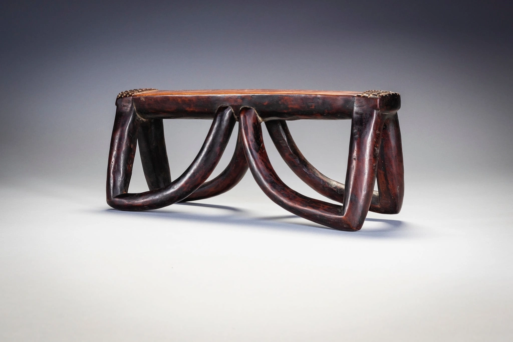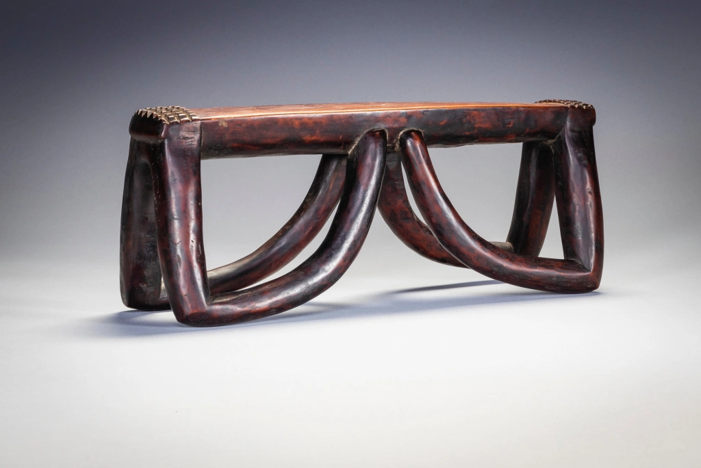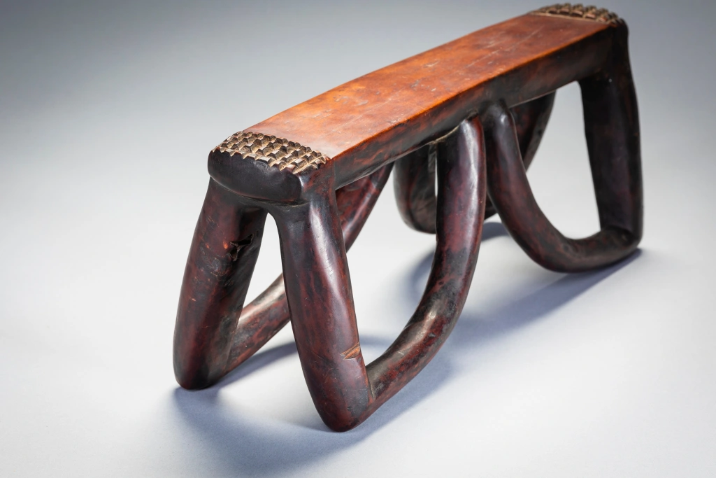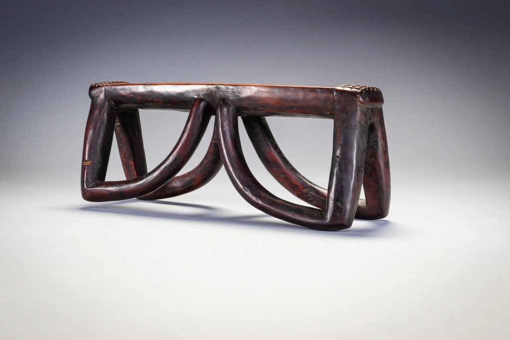 Un appui-tête épuré. Ses 4 pieds sont reliés au centre de la plateforme par 4 quarts de cercle. La finesse de ses pieds pourrait presque l’assimiler à un appui tete » lianes » , de plus comme les appuis têtes de cette catégorie il est en bois rouge de la famille des acajous type Mahogany local. une pièce de forme raffinée.