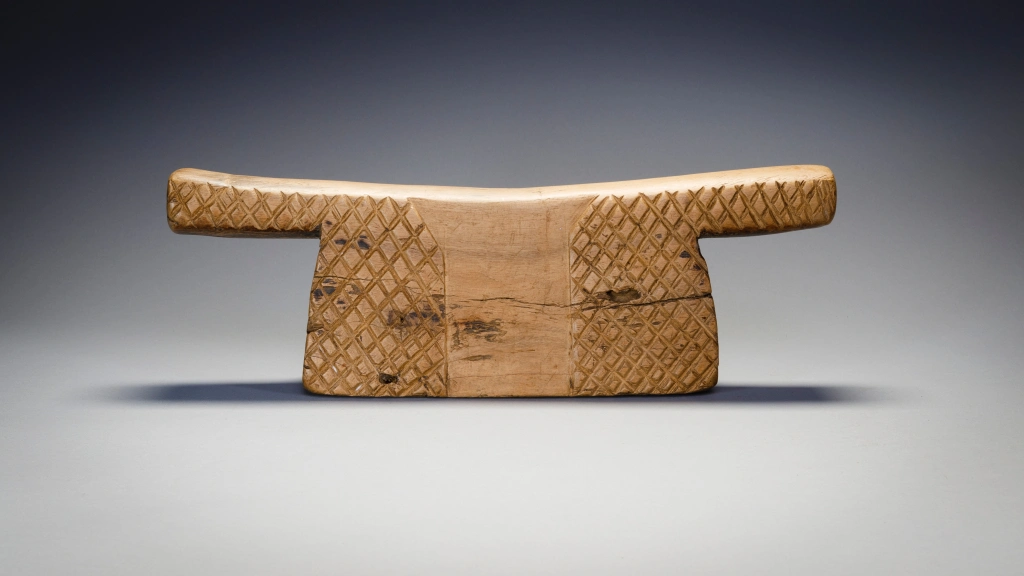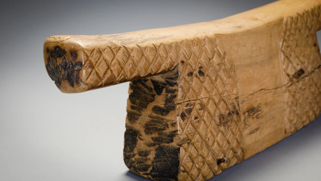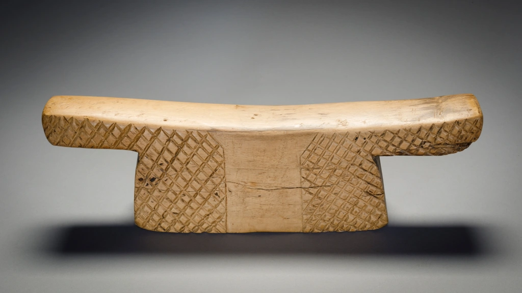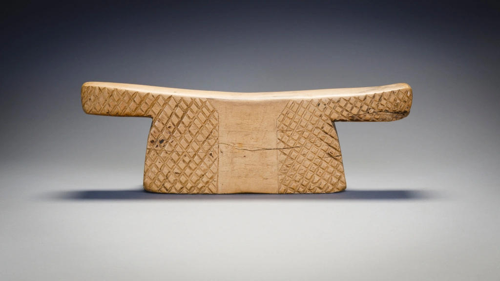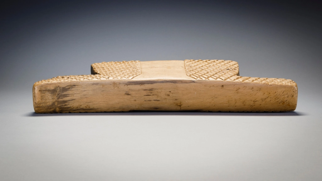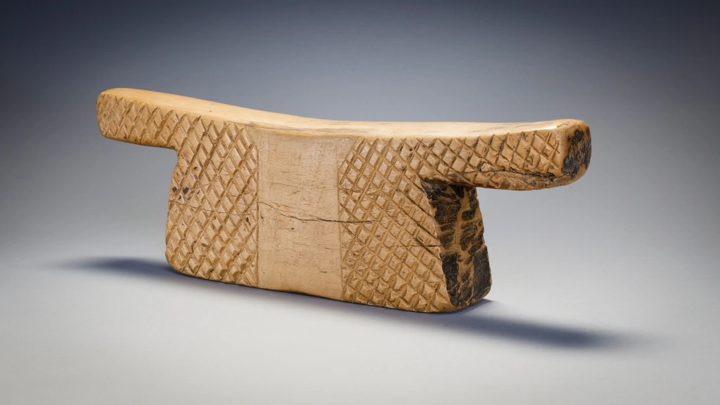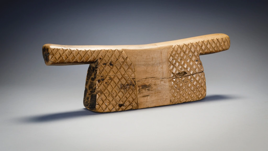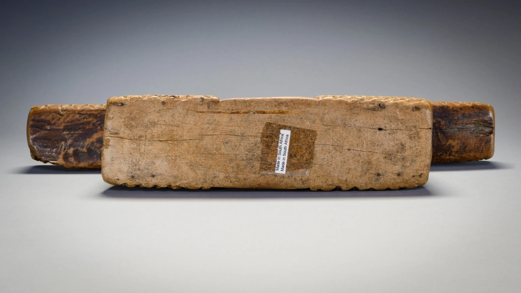 Un bloc Msinga en « forme classique de kimono ». Sa particularité se trouve dans la pâleur de son bois et ses Amasumpa en losange accompagnés d’une bande verticale non travaillé au centre. les craquelures horizontales attestent de son utilisation intense pendant des décennies.