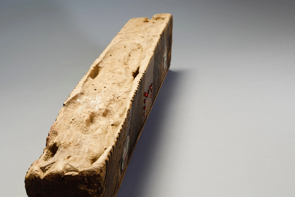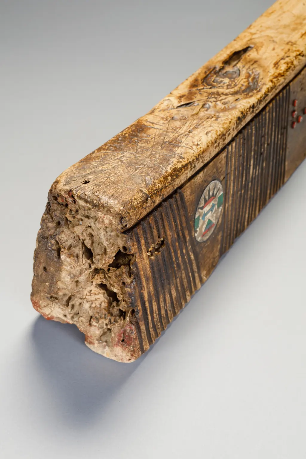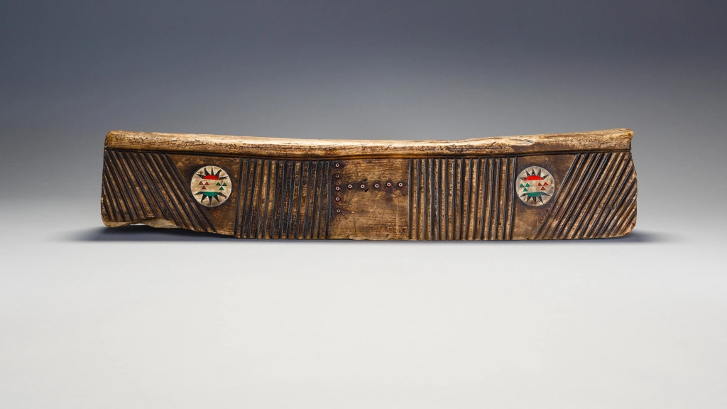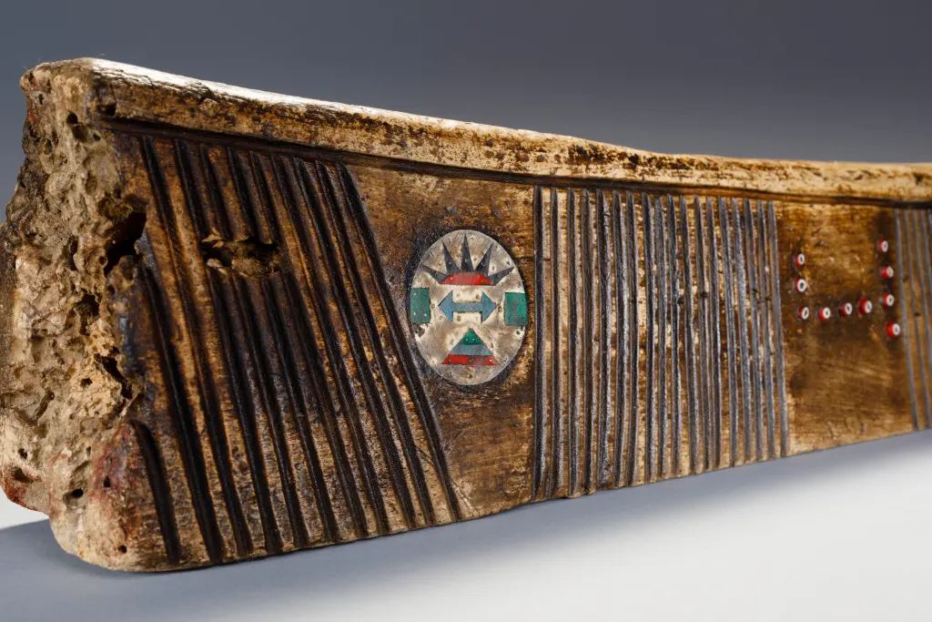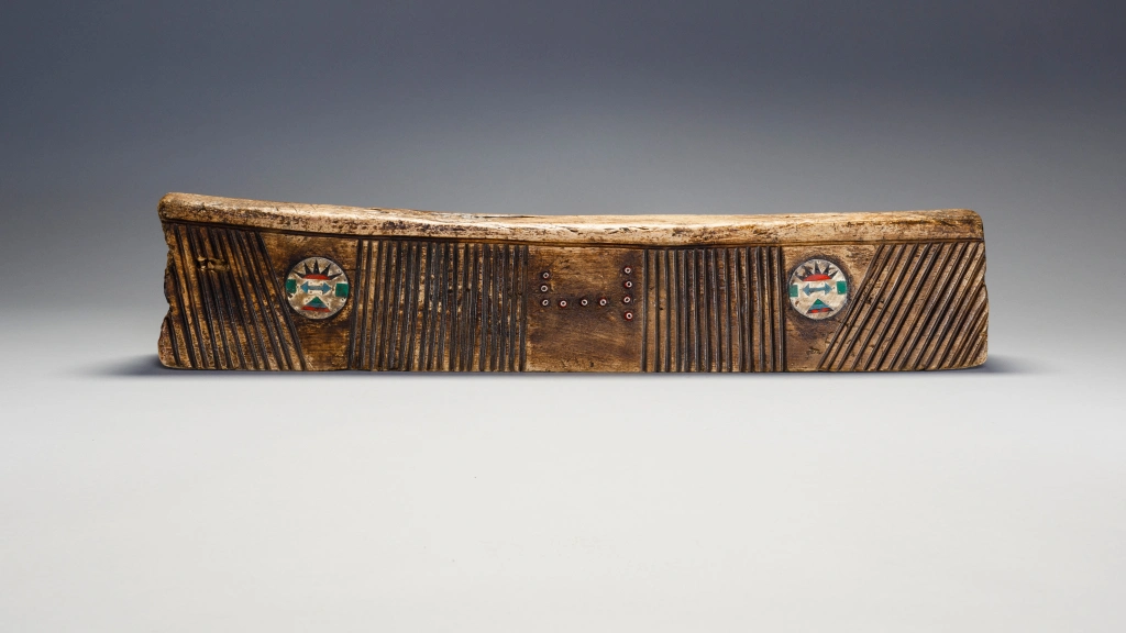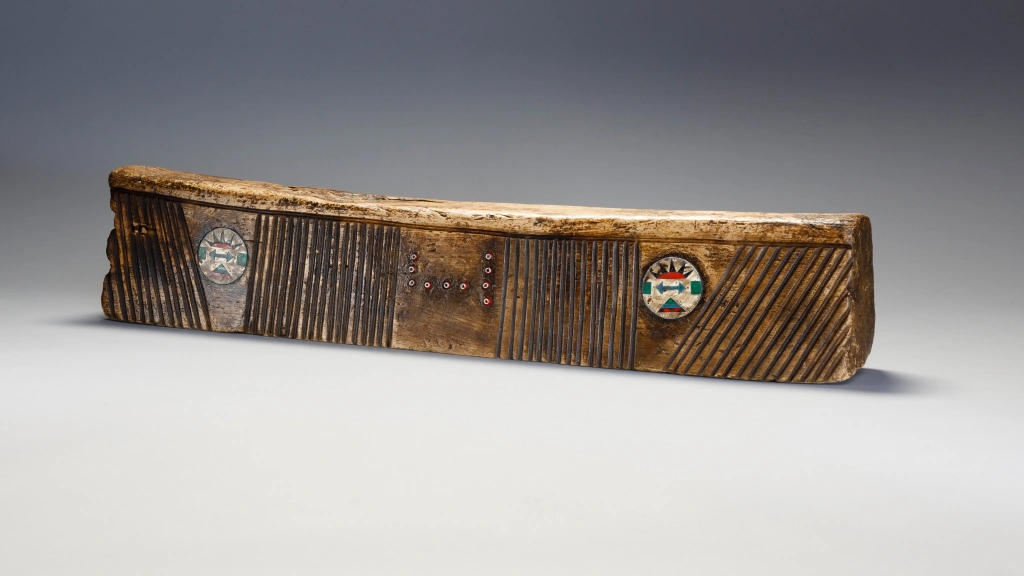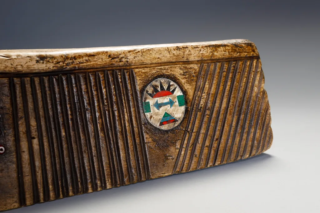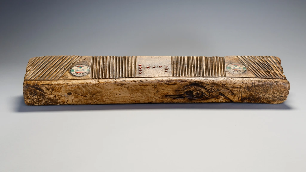 Cet appui-tête zoulou inhabituel en bois de figuier provient de la zone Weenen du Kwa-Zoulou Natal et a été crée en 1955 pour un mariage. Il a été utilisé par le mari et la femme. L’appui-tête consiste en un oreiller double de type travertin à l’européenne et est incrusté de boucles d’oreilles zouloues. Ces dernières sont situées sur les côtés de l’appui-tête et ont un modèle très inhabituel. On retrouve aussi des bandes d’amasumpa vertical sur chaque côté de l’appui-tête et un ensemble de perles rouges en verre sur chaque face, on peut y retrouver les initiales des deux mariés. La patine a une couleur miel et l’appui-tête est dans une condition excellente.