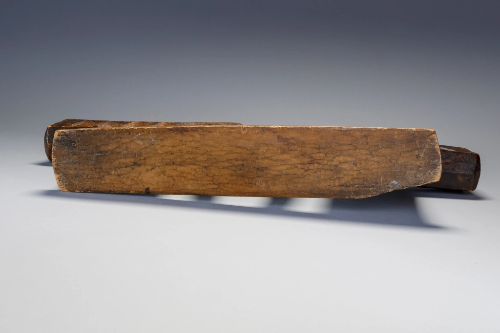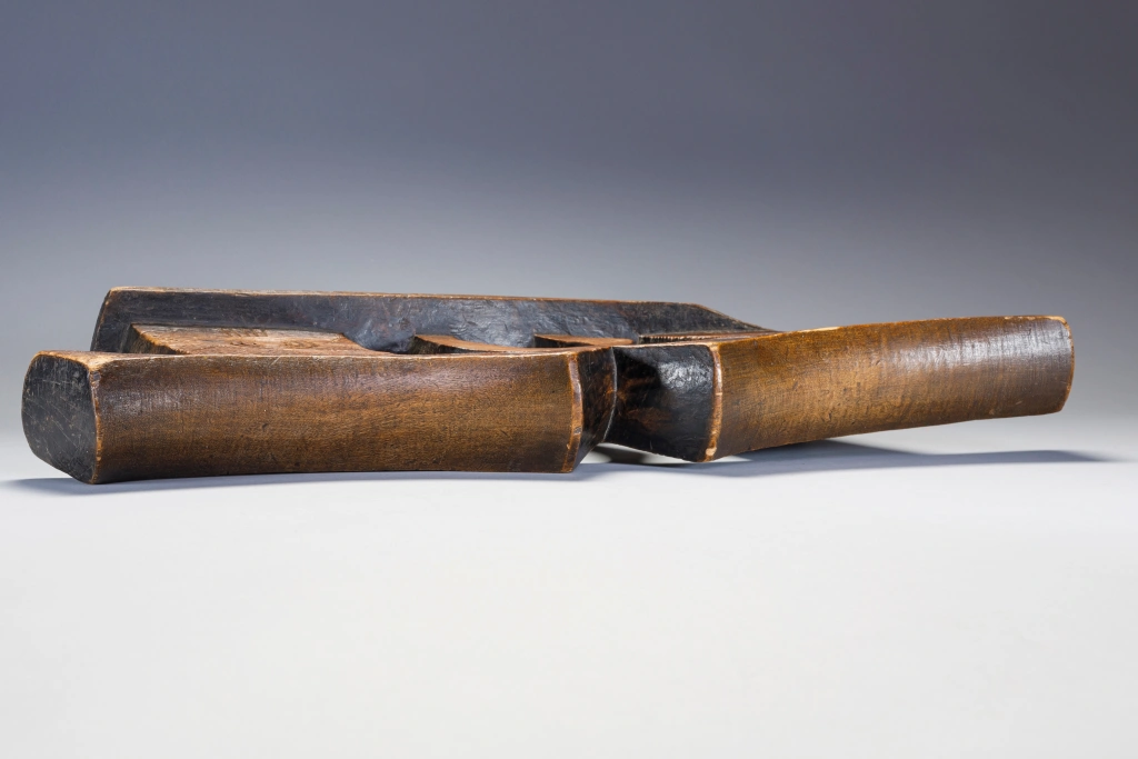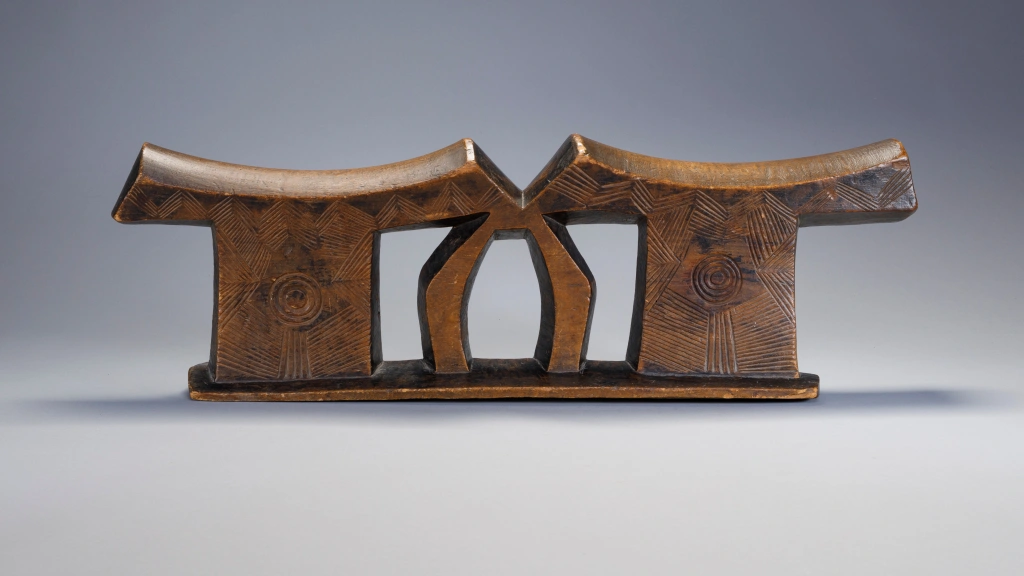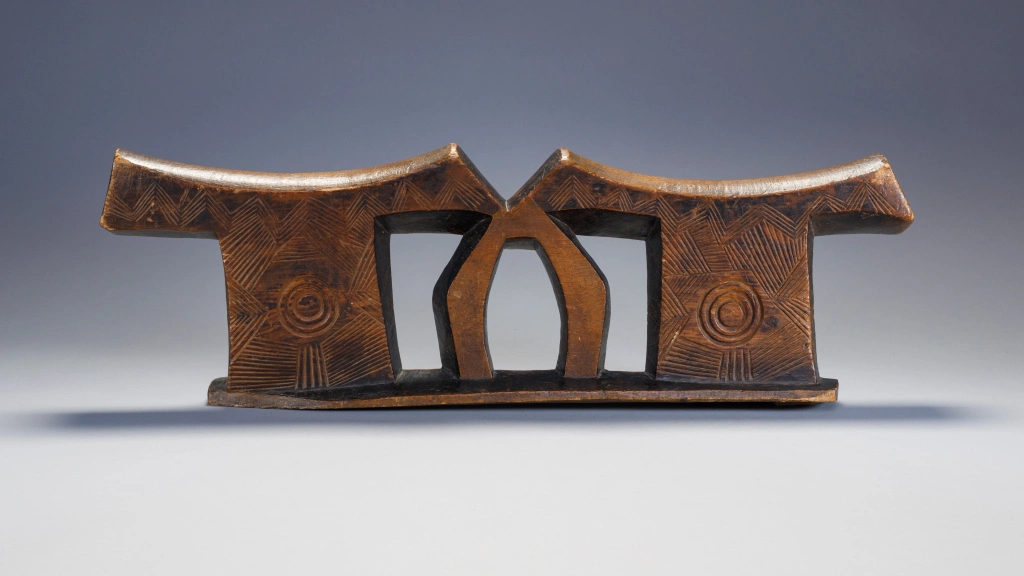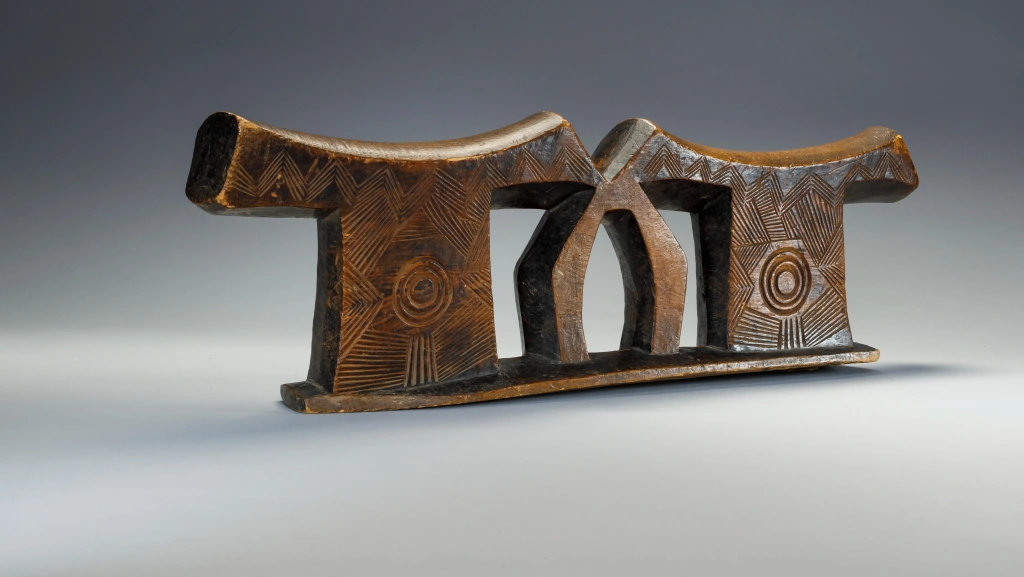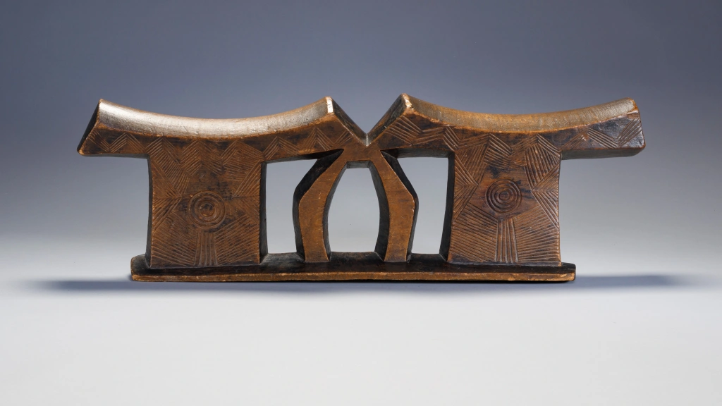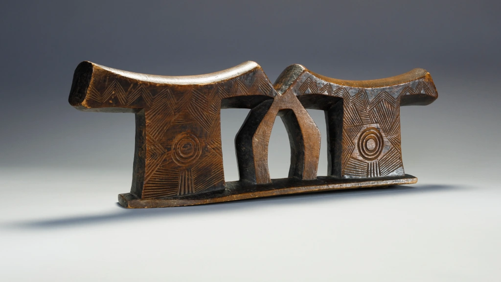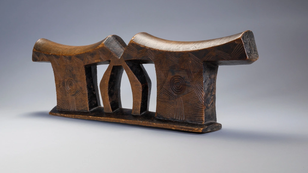 Une pièce extrêmement massive, elle a sa place parmi les plus grandes et les plus imposantes de la collection. Les dimensions imposantes de cet appui-tête sont atténuées par des gravures d’une grande finesse sur les deux faces et sur ses deux parties elles mêmes décorées d’un œil . Il a été fabriqué pour un couple , la partie centrale suggérant deux bras entrelacés.