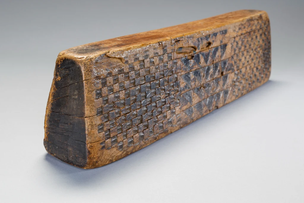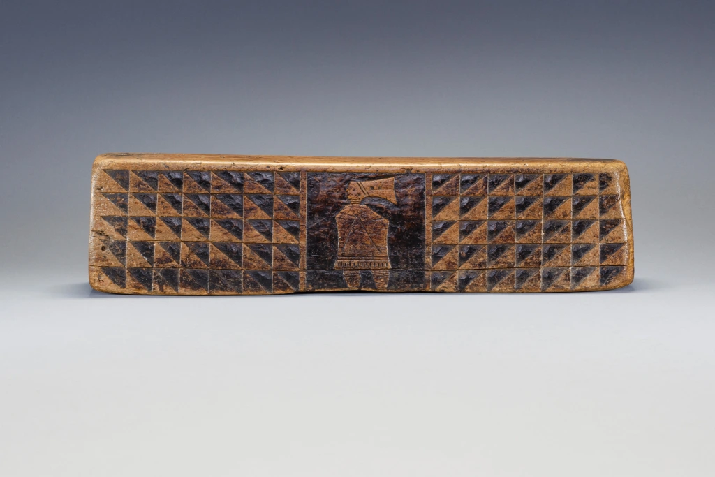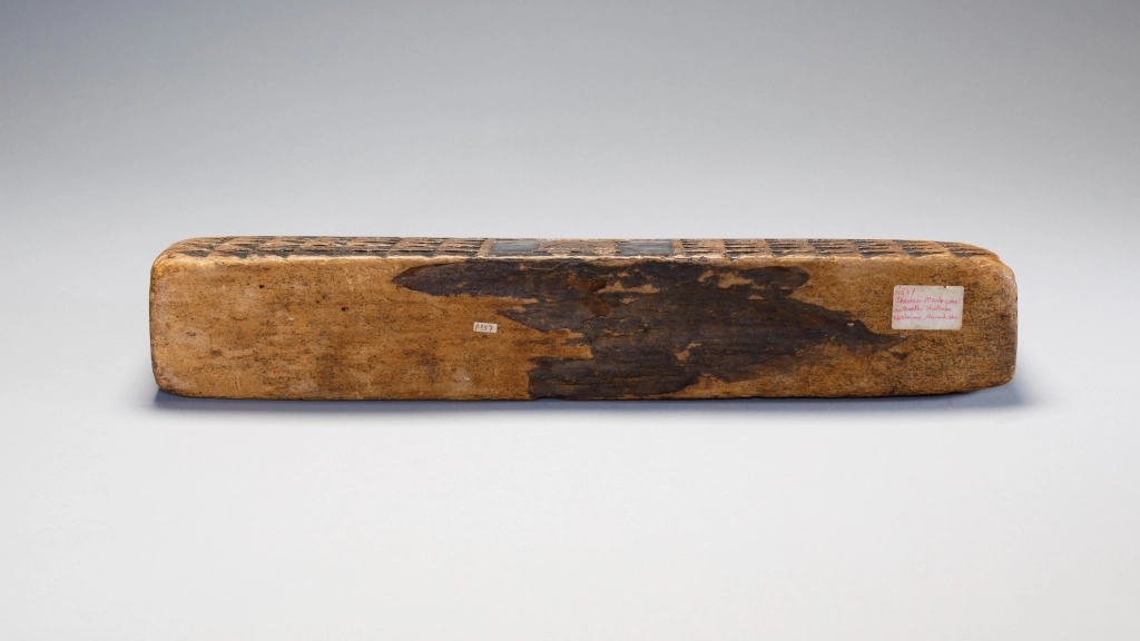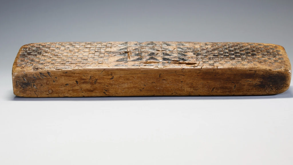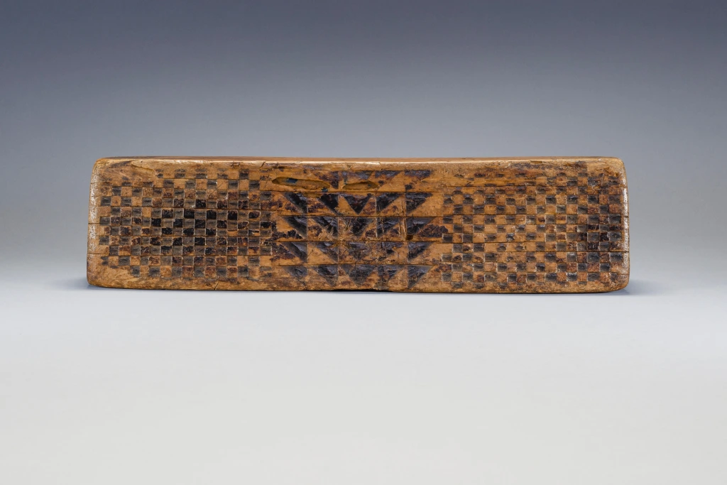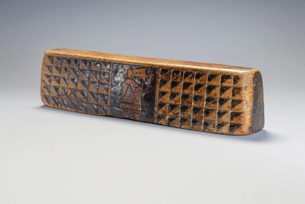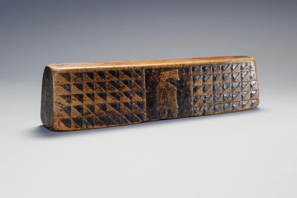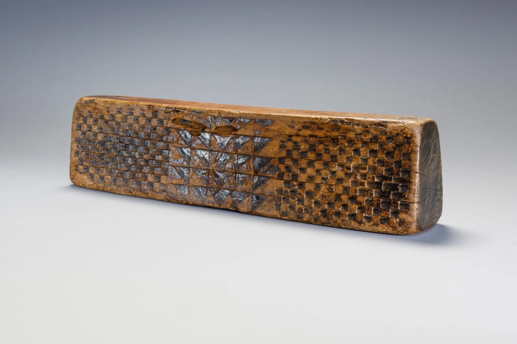 Un appui-tête sculpté par Mbhekeni Mzolo. Mbhekeni Mzolo était un sculpteur originaire d’Emngeni, près de Pomeroy dans la région Msinga. Populaire dans sa région, il s’est spécialisé dans les appuis-tête en bois clair sans poignée, décorés de motifs géométriques en damier. Nombre de ses appuis-tête comportaient également des motifs stylisés d’ihawu (bouclier) et d’umakoti (femme mariée zouloue). Dans ces motifs, les omakoti (pluriel) portent un isicholo et le profil large de leur corps évoque le port d’un ibhayi autour des épaules et d’un isidwaba autour de la taille.Comme beaucoup d’appuis-tête en bloc de Mbhekeni Mzolo, celui-ci présente un uma-koti d’un côté et un ihawu de l’autre, tous deux encadrés par de petites découpes carrées ou triangulaires qui forment un motif perlé. Ces motifs géométriques particuliers, ainsi que le bouclier sont utilisés sur de nombreux appuis-tête de ce sculpteur.
