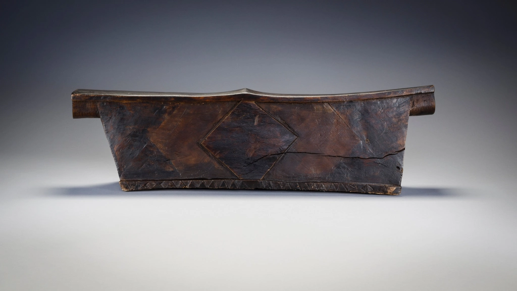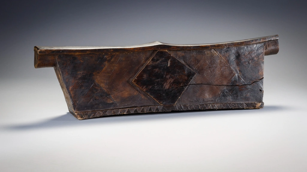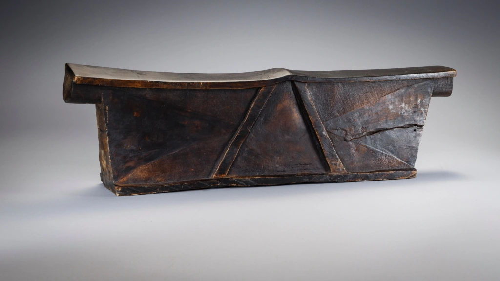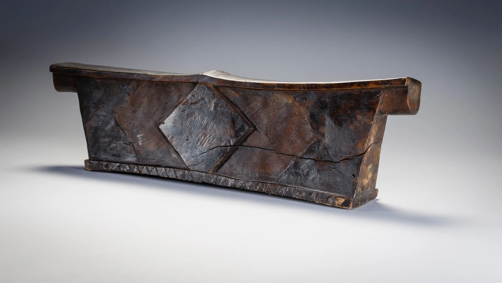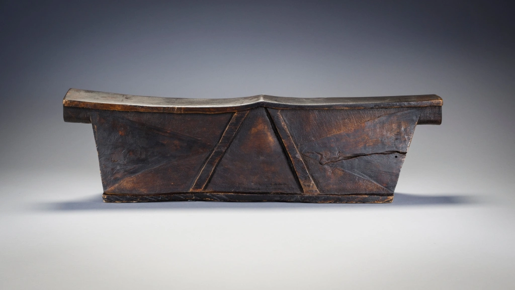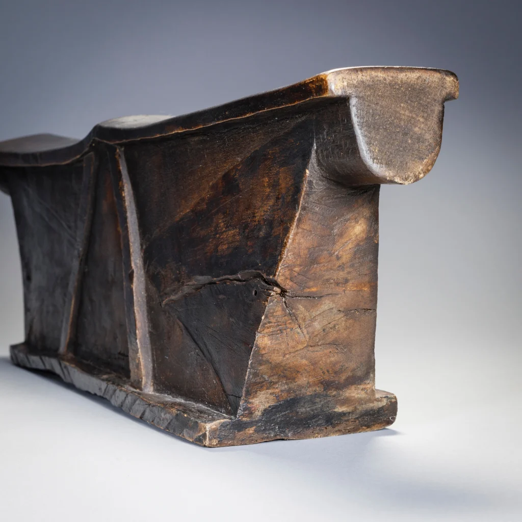 Un appui-tête double massif pour couple, il est originaire de la région Msinga. Faiblement décoré il comporte cependant quelques légères  incrustations sur chacune de ses faces et les différentes teintes de brun et de noir apportent subtilement de légers contrastes sur cette pièce.
