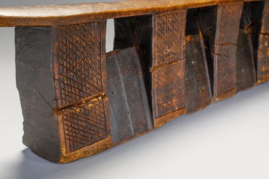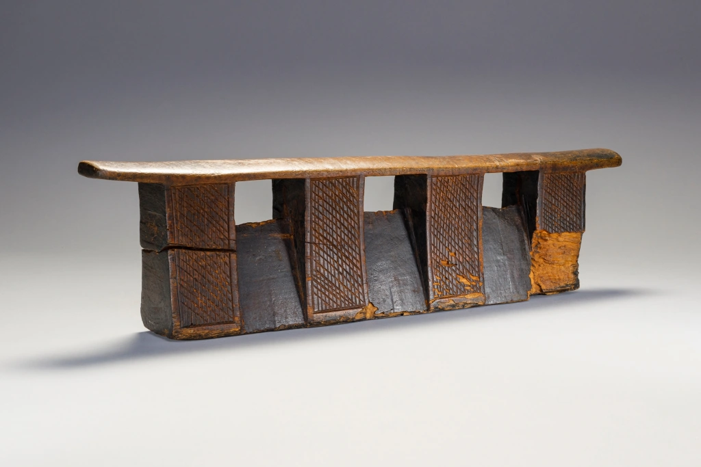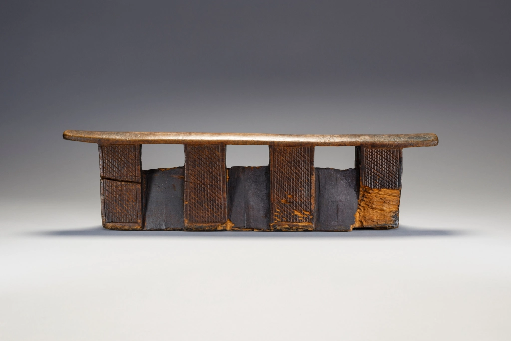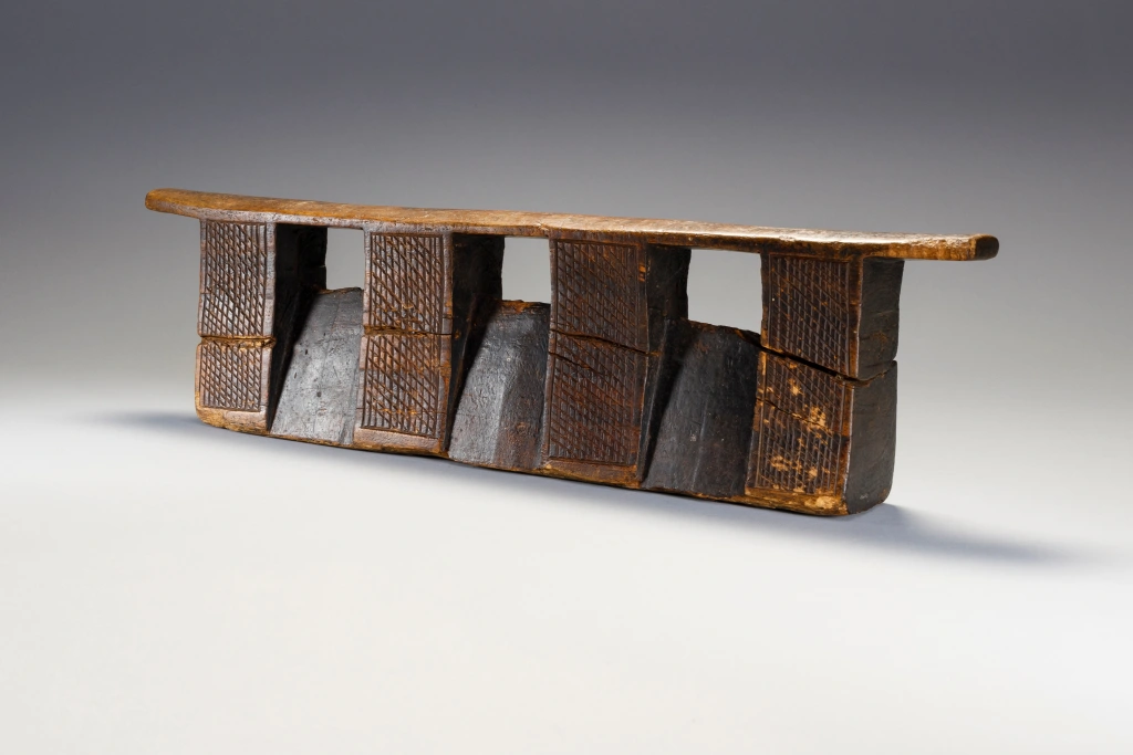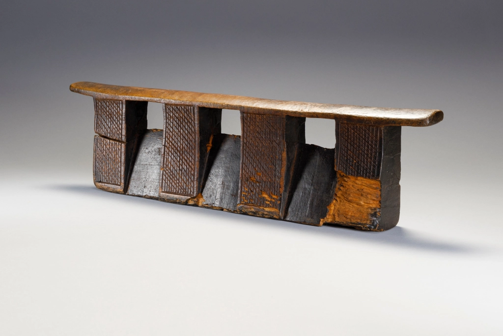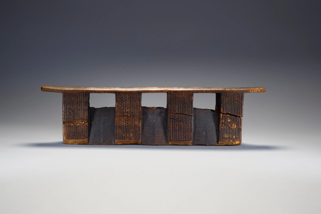 Une pièce en forme de bloc ajourée en partie haute par trois fenêtres entre quatre pieds striés. Les appuis-tête étaient des symboles de statut pour les hommes zoulous et pouvaient être transportés pendant la journée en tant qu’objet de prestige et utilisés la nuit lorsque les hommes surveillaient leur bétail. Ces appuis-tête comme la plupart des appuis-tête en Afrique servaient à maintenir les coiffures hors du sol et à élever la tête pendant le sommeil. Les appuis-tête zoulous ne servaient pas seulement à dormir la nuit, mais aussi à s’asseoir le jour, en raison de leur grande longueur. Les Zoulous croient que les rêves sont le moyen d’intervention des ancêtres. Leur appui-tête serait donc plus qu’un oreiller, il serait un instrument de médiation entre le monde des vivants et celui des morts.