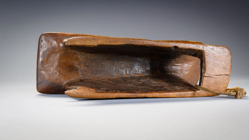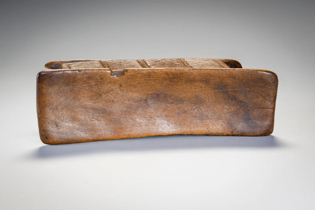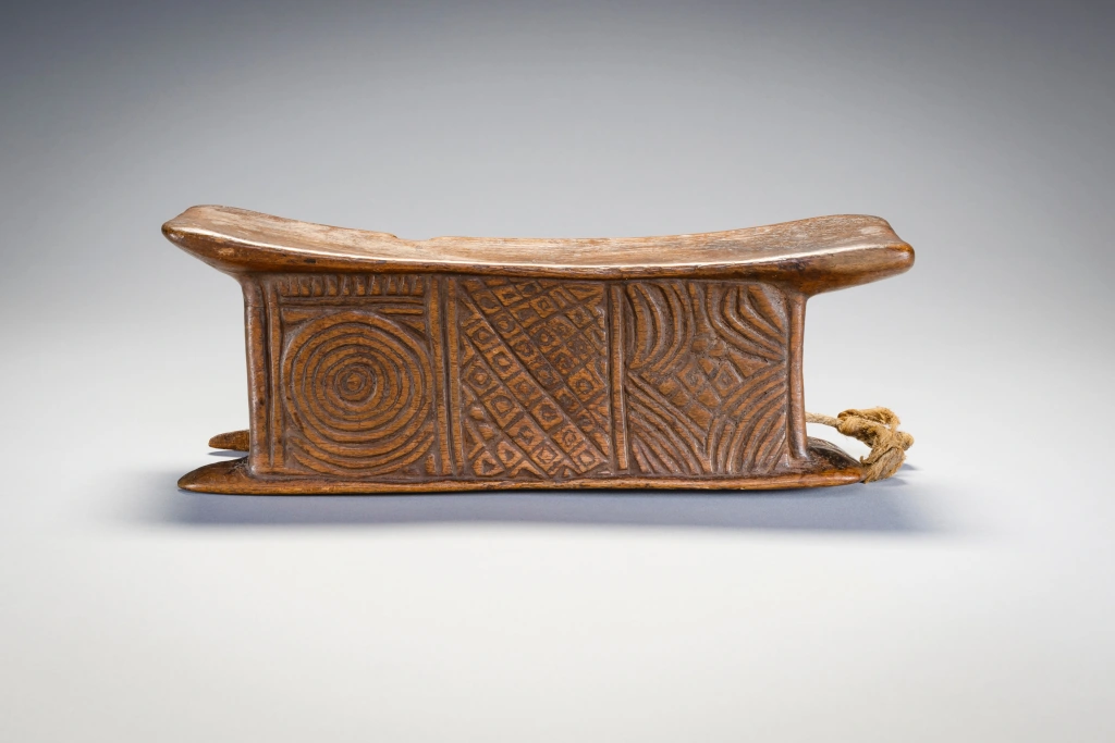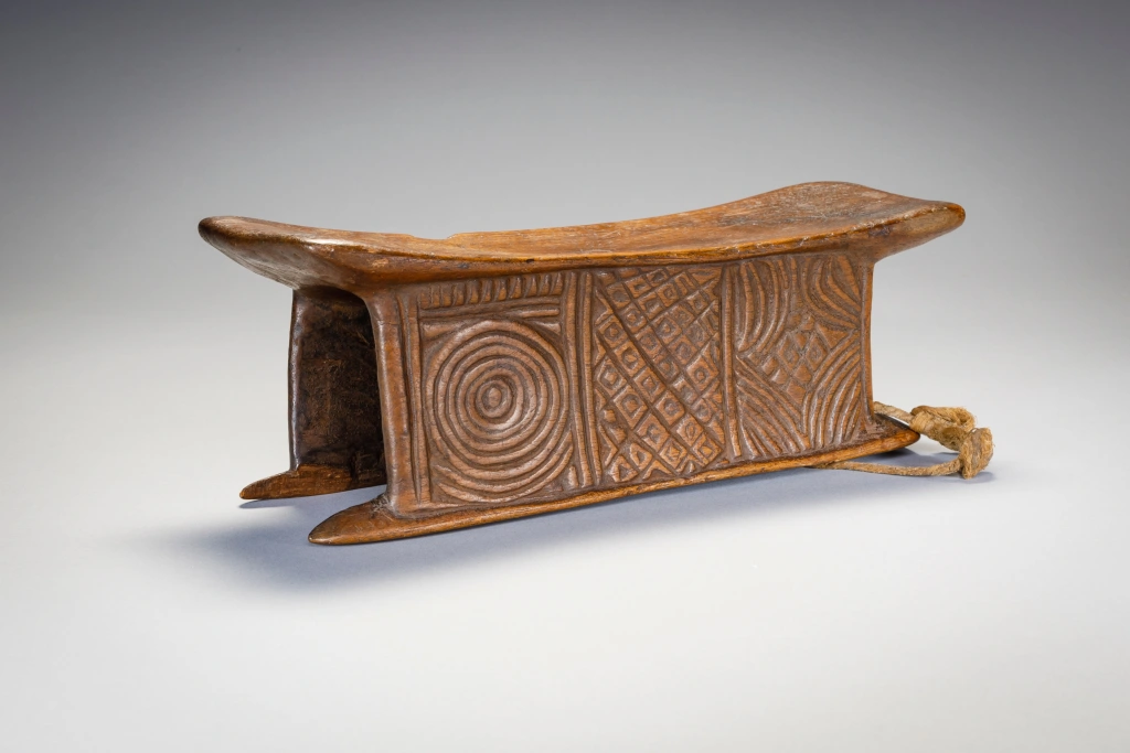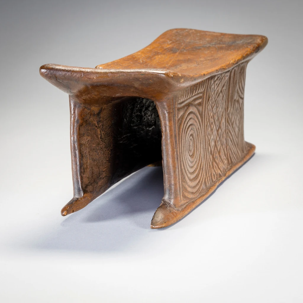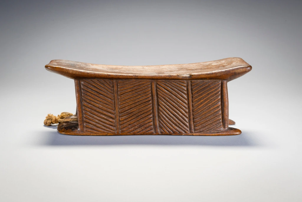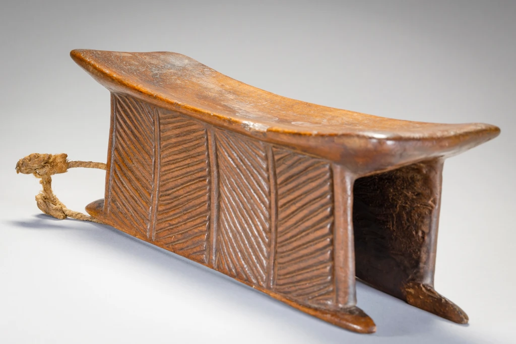 Un appui-tête avec une forme extrêmement originale de « tunnel ». Il est très finement décoré de stries sur l’ensemble de ses faces. Il faut noter que l’appui-tête est accompagné d’une ficelle pour l’accrocher à sa ceinture, il est peut-être destiné à un berger ou à un voyageur. L’appui-tête est aussi et surtout un « médium des rêves ». Il favorise les symboles oniriques, qui vont influencer la vie diurne de son propriétaire ou du clan. Il peut également servir d’instrument de divination. Parfois, il peut aussi servir de petit siège. Par ailleurs, l’appui-tête peut jouer un rôle dans les cérémonies de mariage. La vierge, échangera l’appui-tête reçu contre une somme qui lui permettra d’acheter un collier d’ambre, symbole de son statut de femme mariée. Généralement, lorsqu’une personne décède, elle est enterrée avec son appui-tête. Parfois, l’appui-tête est transmis à son héritier, qui le traitera avec respect car cette pièce de bois incarne l’esprit de la personne décédée. Il est cependant fréquent que l’appui-tête soit « cassé » pour ne pas être réutilisé. Ce n’est pas le cas de cet appui-tête, qui a manifestement appartenu à une personne de haut rang.