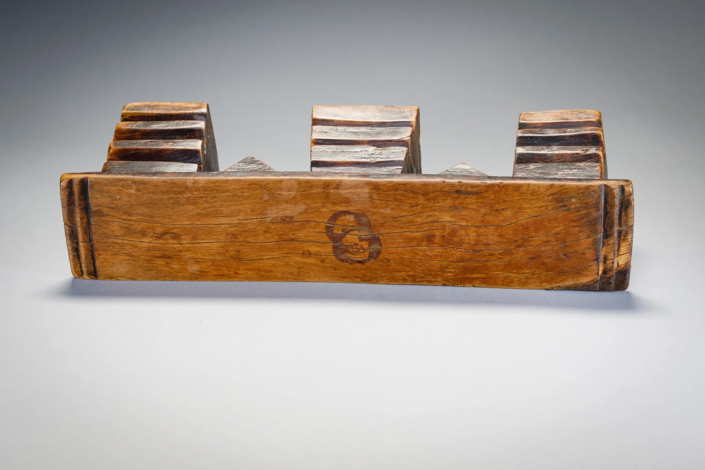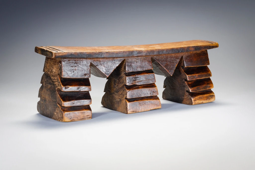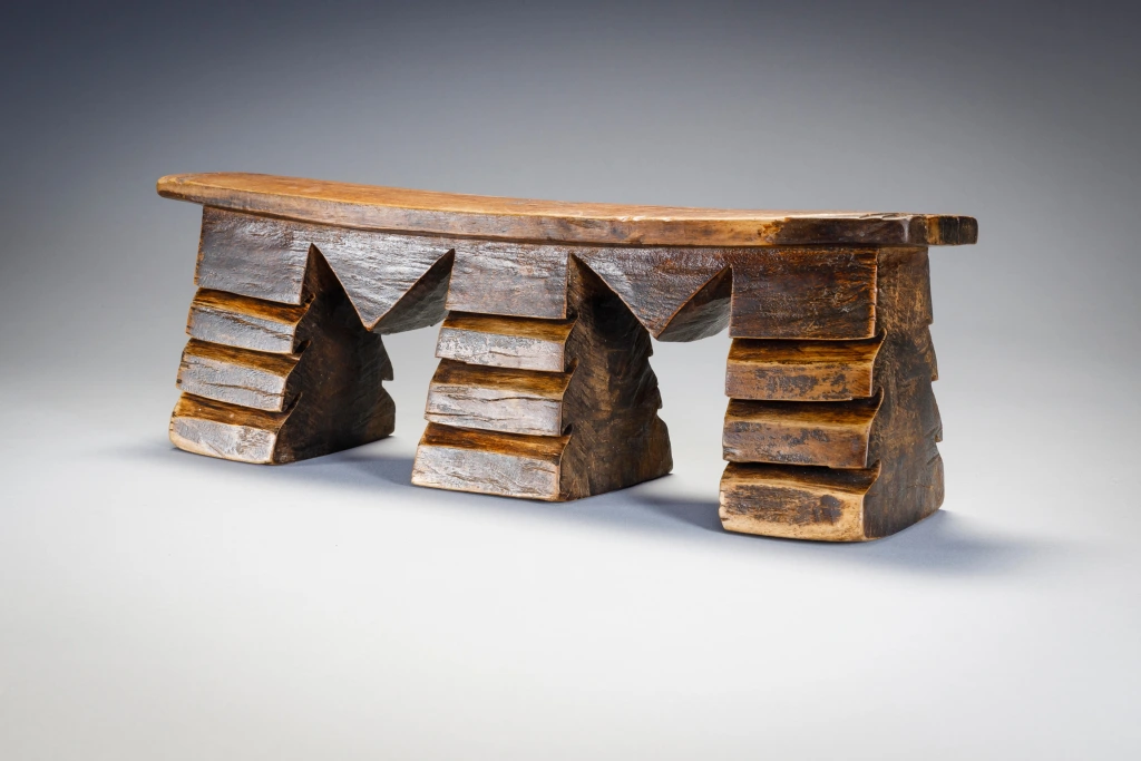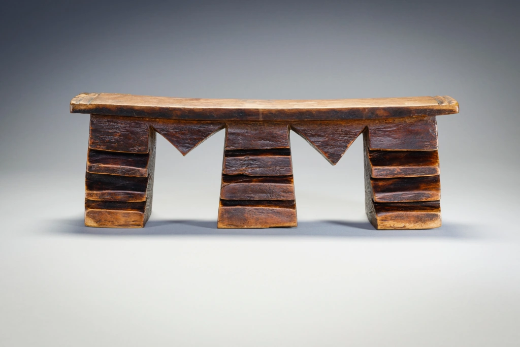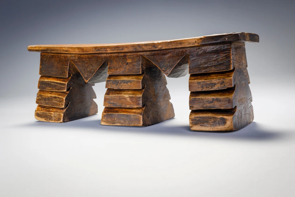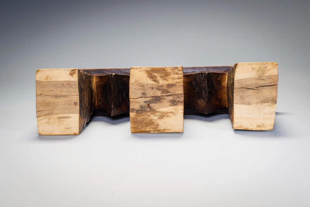 Un appui-tête aux pieds dentelés de rainures très marquées. Sa forme est celle d’un double M correspondant aux initiales de son propriétaire initial : Mangubane Msomi. Cette forme personnalise cette pièce et la rend encore plus attachante. Le dégradé de la patine ( plus sombre vers le haut des pieds) attire l’œil et affine encore sa silhouette.