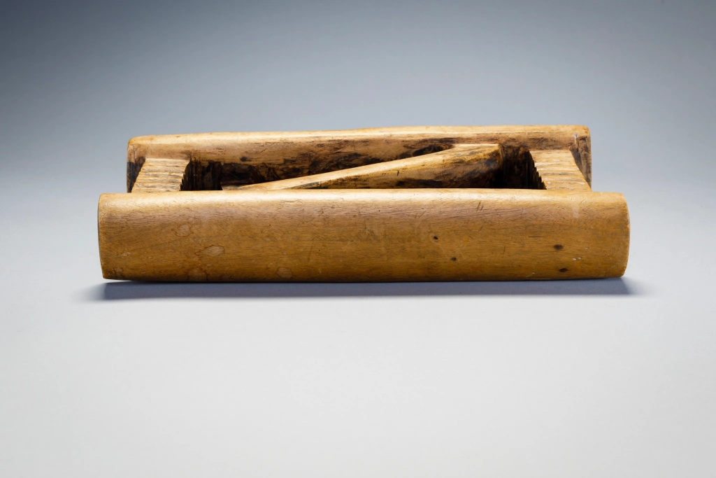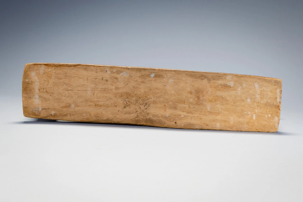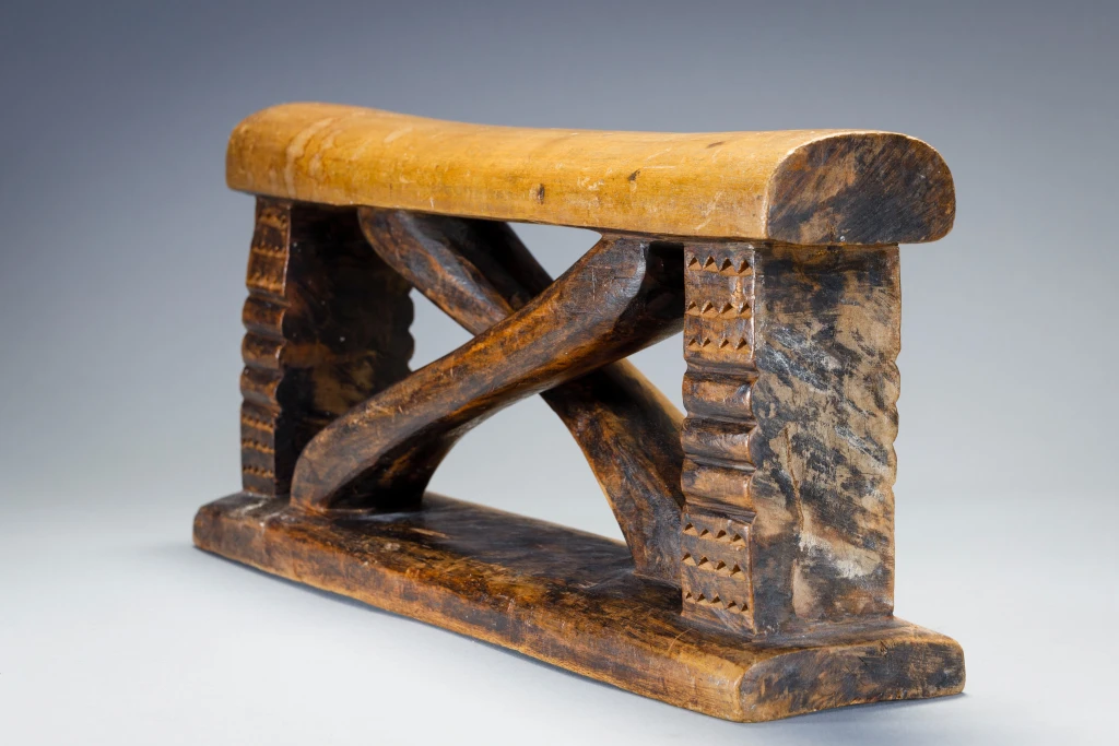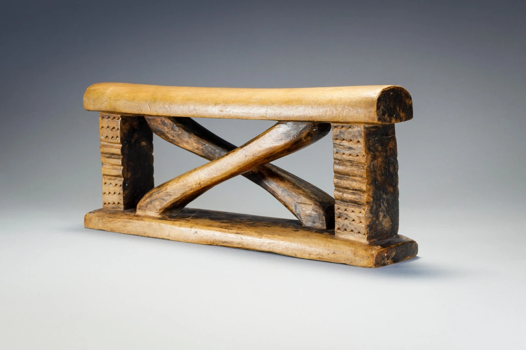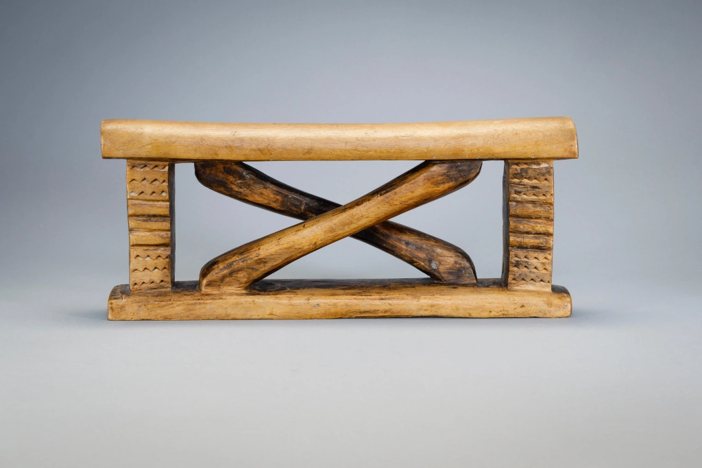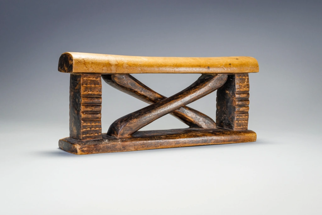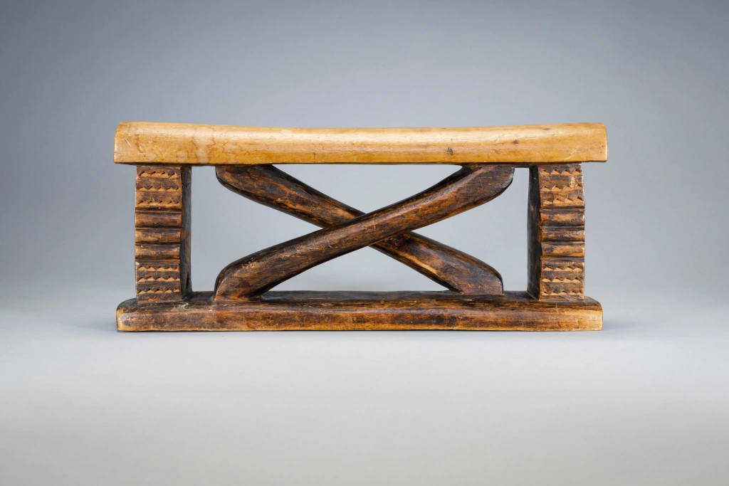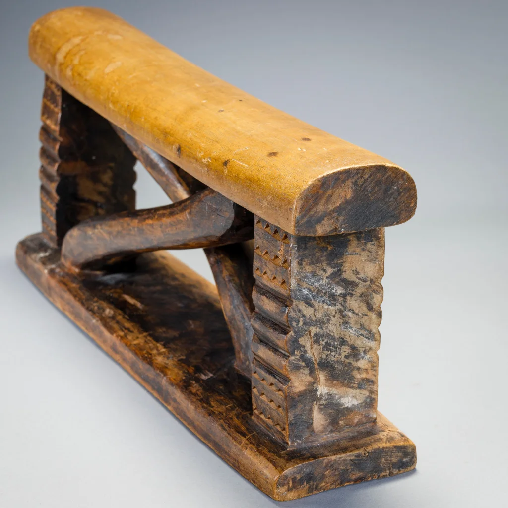 Un appui-tête avec une forme originale dû à son corps constitué d’une croix de deux barres situées dans des plans différents. Il faut également noter que la plateforme de section est arrondie, ce qui est assez rare pour le noter.