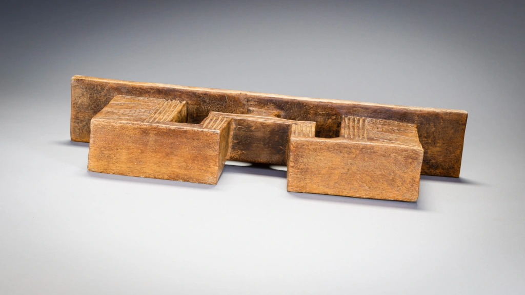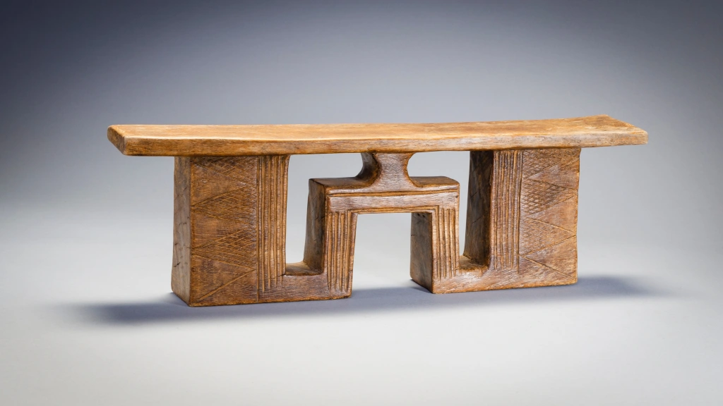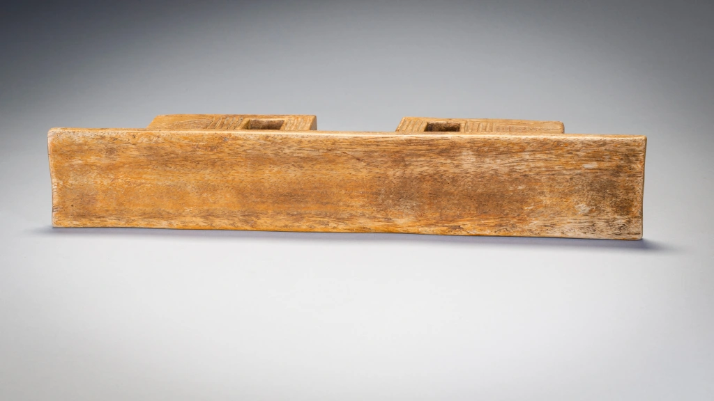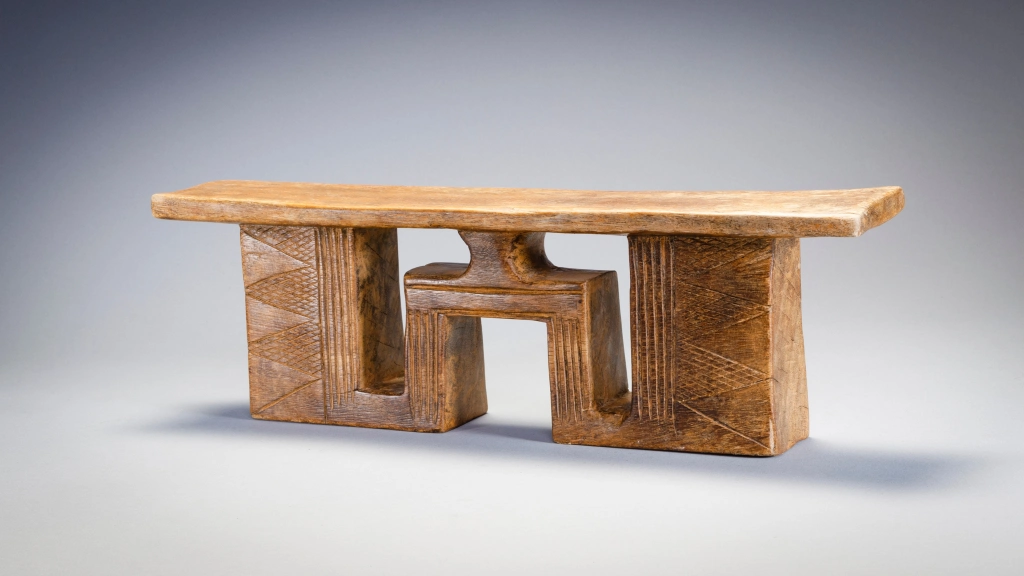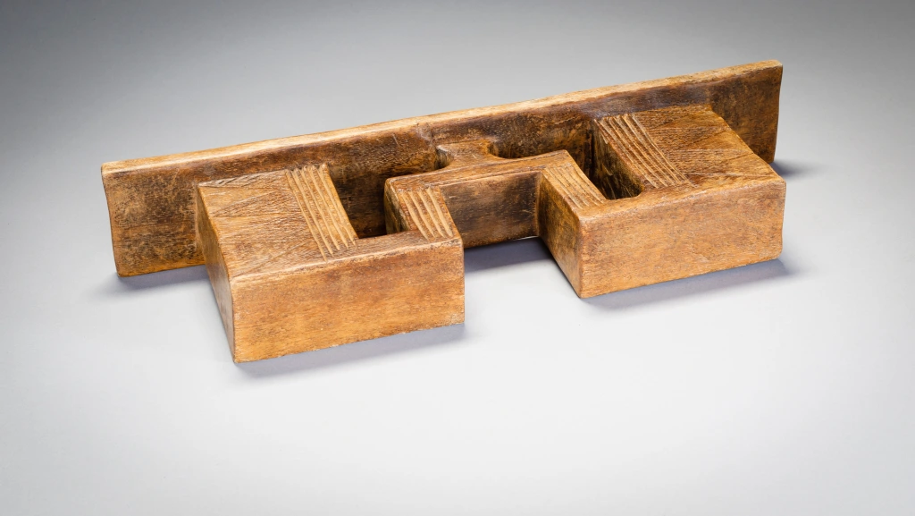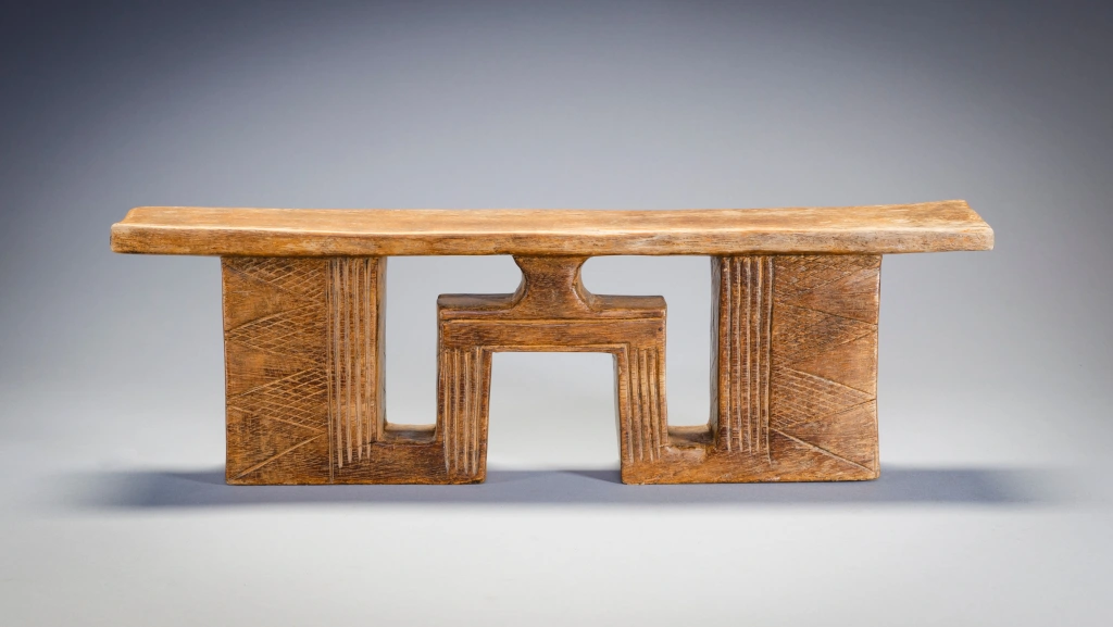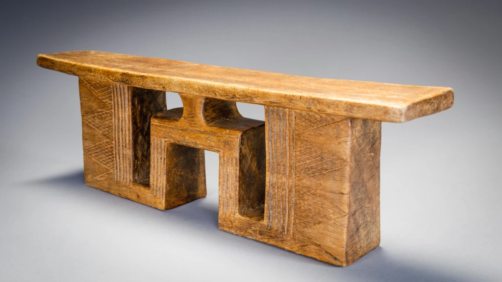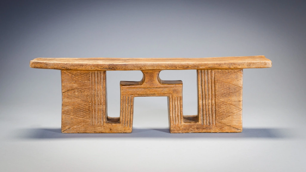 Un appui-tête avec une forme élégante mais aussi assez classique du XXe siècle dans le sud de la région Msinga. Les pièces de cette forme ont été sculptées par différents artistes issus de la même école et ayant les mêmes influences. Elles diffèrent par leurs décorations, et leurs couleurs. Cette pièce est assez originale car elle cumule stries et triangles, mais aussi, car elle est d’une couleur miel particulièrement rare sur ce type d’appui-tête. La célèbre galerie Mennenghelli de Durban l’a vendue en 2014 avant de fermer.