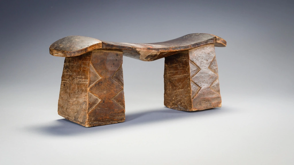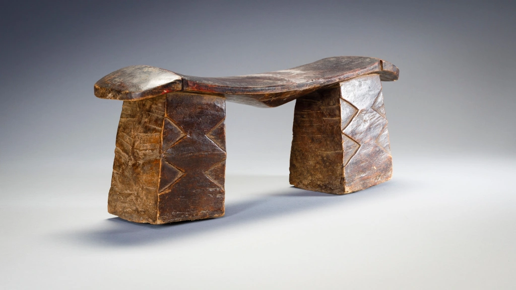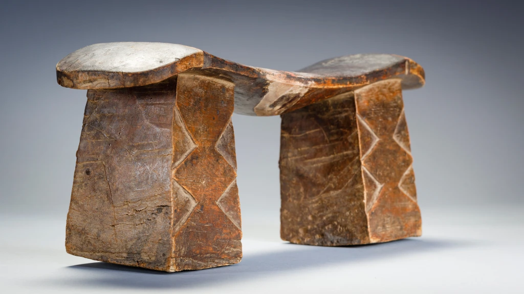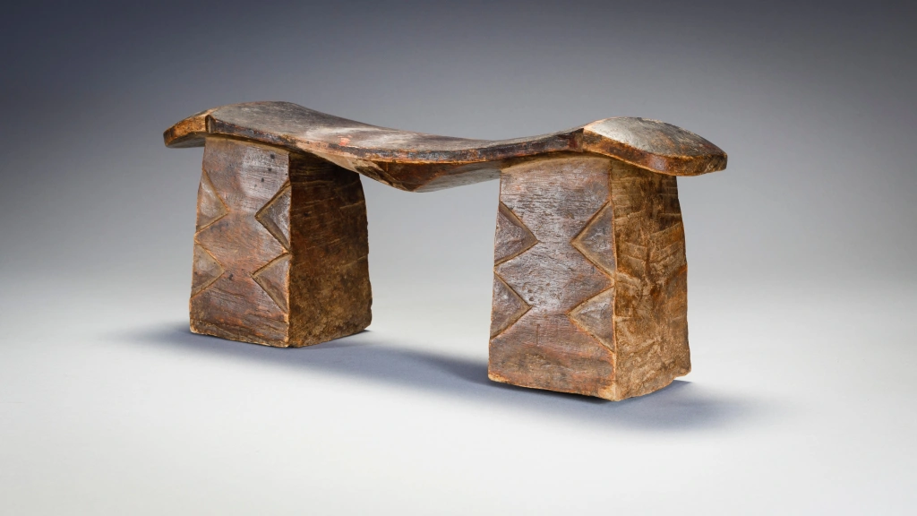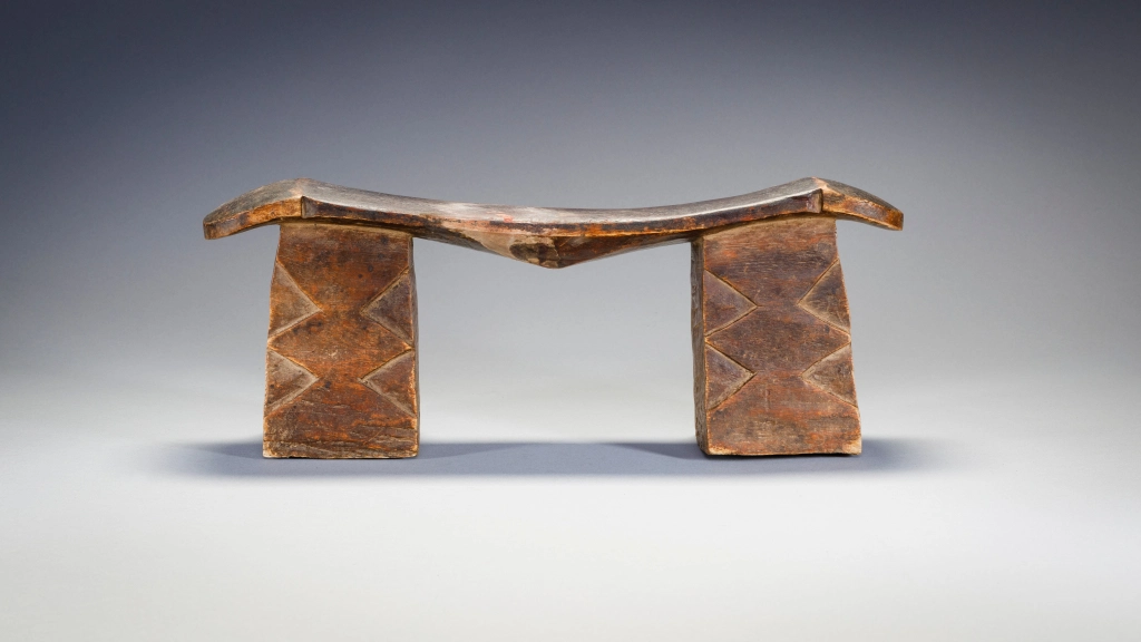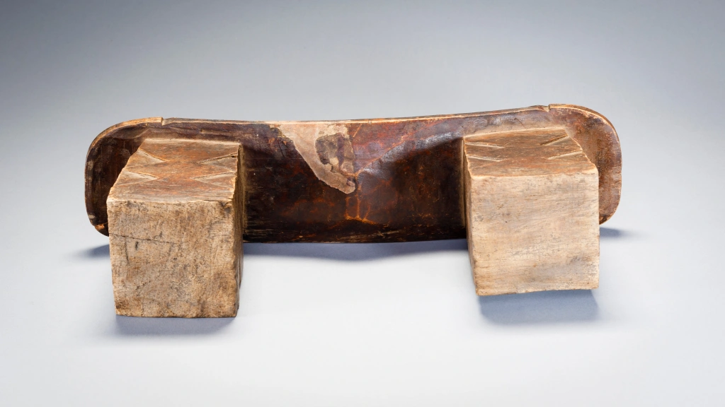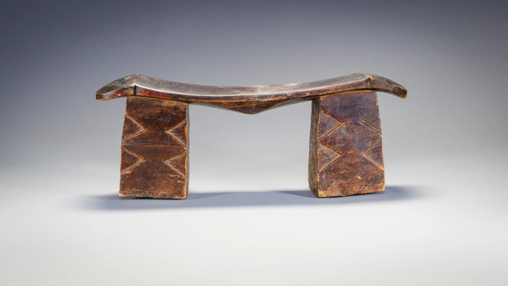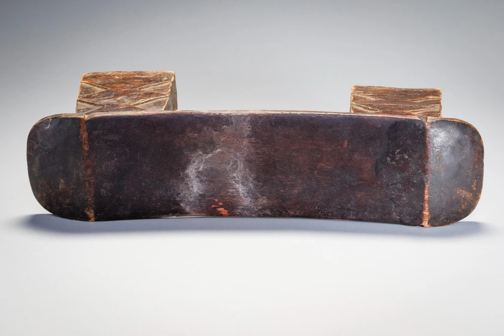 Un appui-tête trapu avec deux pieds massifs et une plateforme fine et légère en forme de vague dans le style Nguni. Son usure traduit des décennies et probablement diverses générations d’utilisation. Sa provenance n’est pas précisément identifiée, mais son style laisse à penser que l’appui-tête provient du Nord du Kwazulu Natal proche donc de la culture Nguni.
