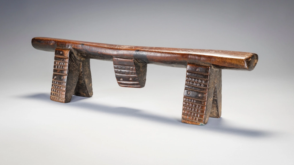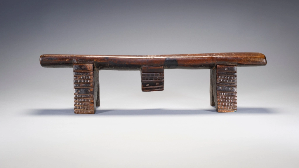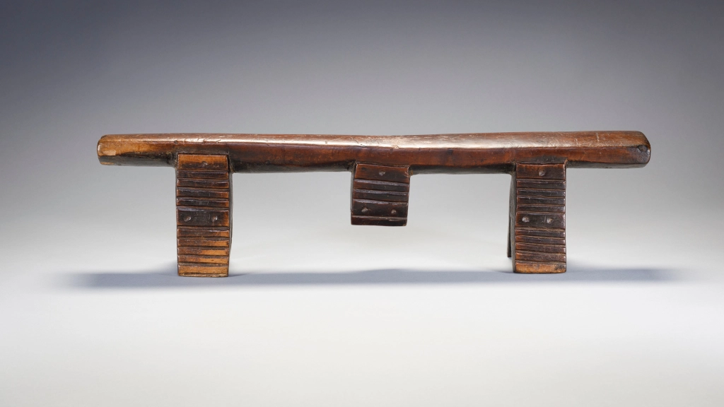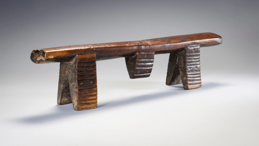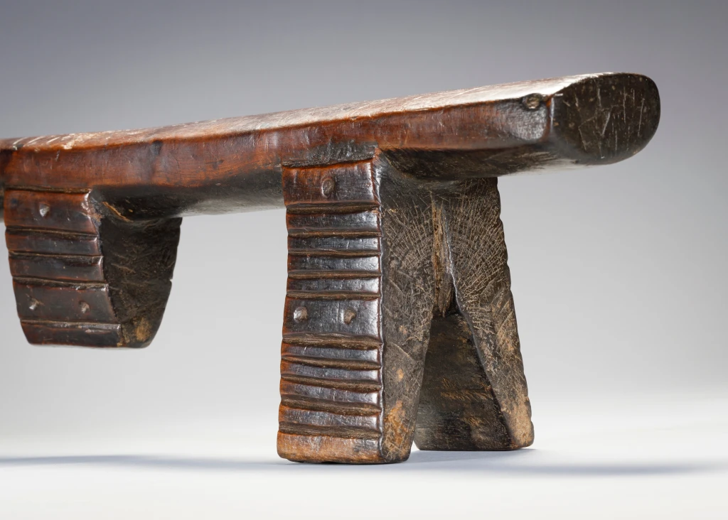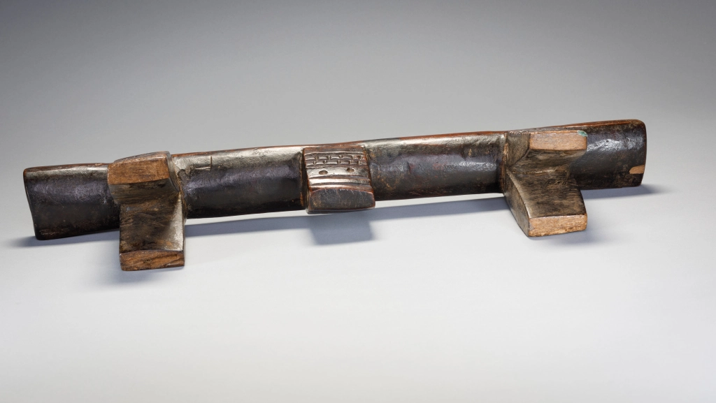 Une très belle pièce sculptée par Mngudeni Shezi un célèbre sculpteur frère aîné de Nkwishi Shezi qui est également sculpteur d’appui-tête. Les deux frères ont été très prolifiques et leurs styles sont très proches. Le téton au centre de la plateforme en biseau est plutôt caractéristique du style de Mngudeni, la finesse des décorations amasumpa est par contre commune aux deux frères.