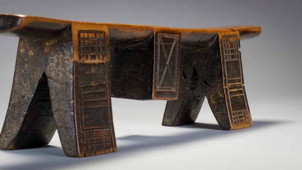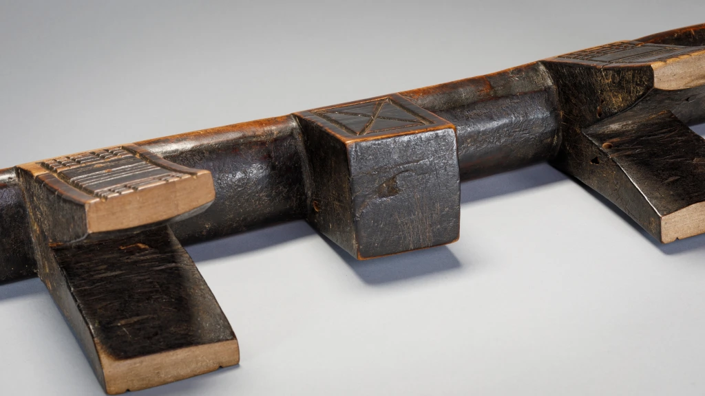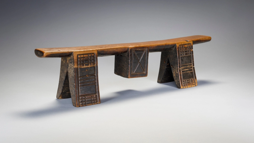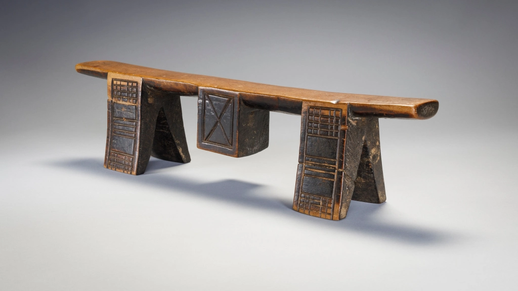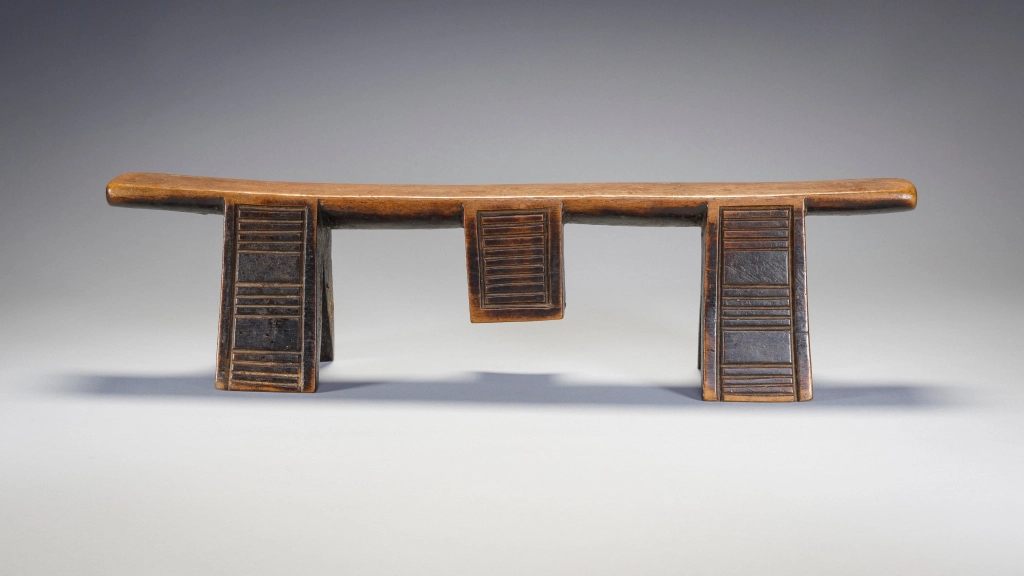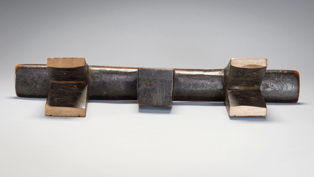 Une pièce typique de la production de Nkwishi Shezi. L’appui-tête a un téton quasiment cubique décoré des mêmes motifs que ses deux doubles pieds. La sobriété de ces décorations n’a d’égal que leur précision qui montre les qualités d’esthétiques et de technicité de deux demi-frères Shezi.