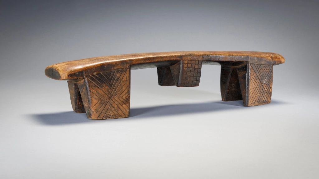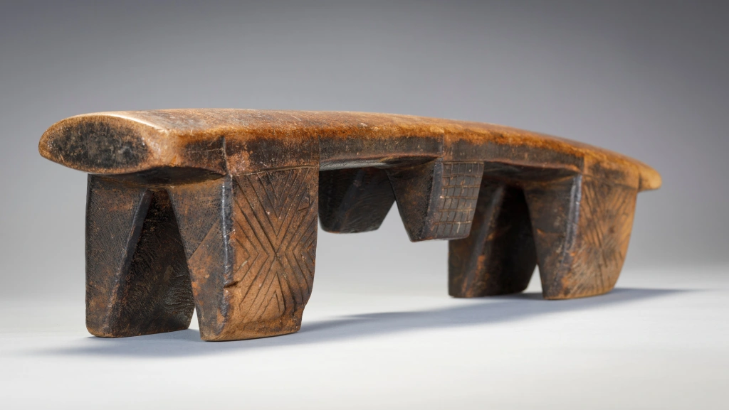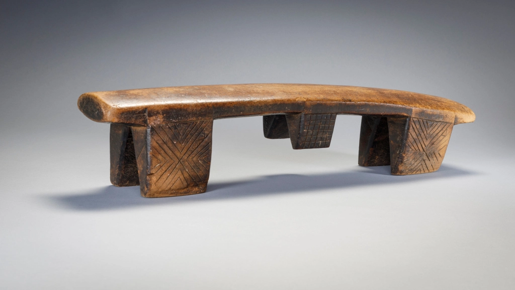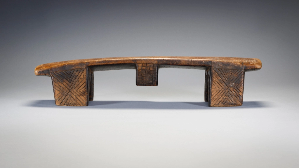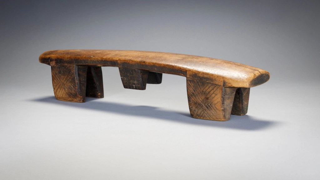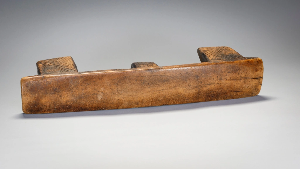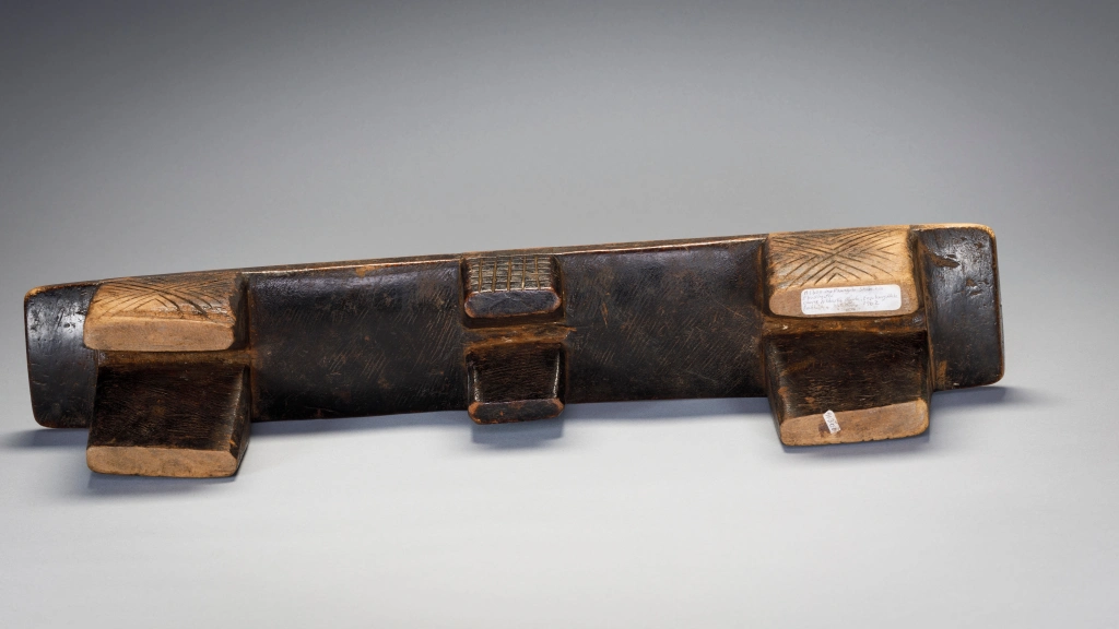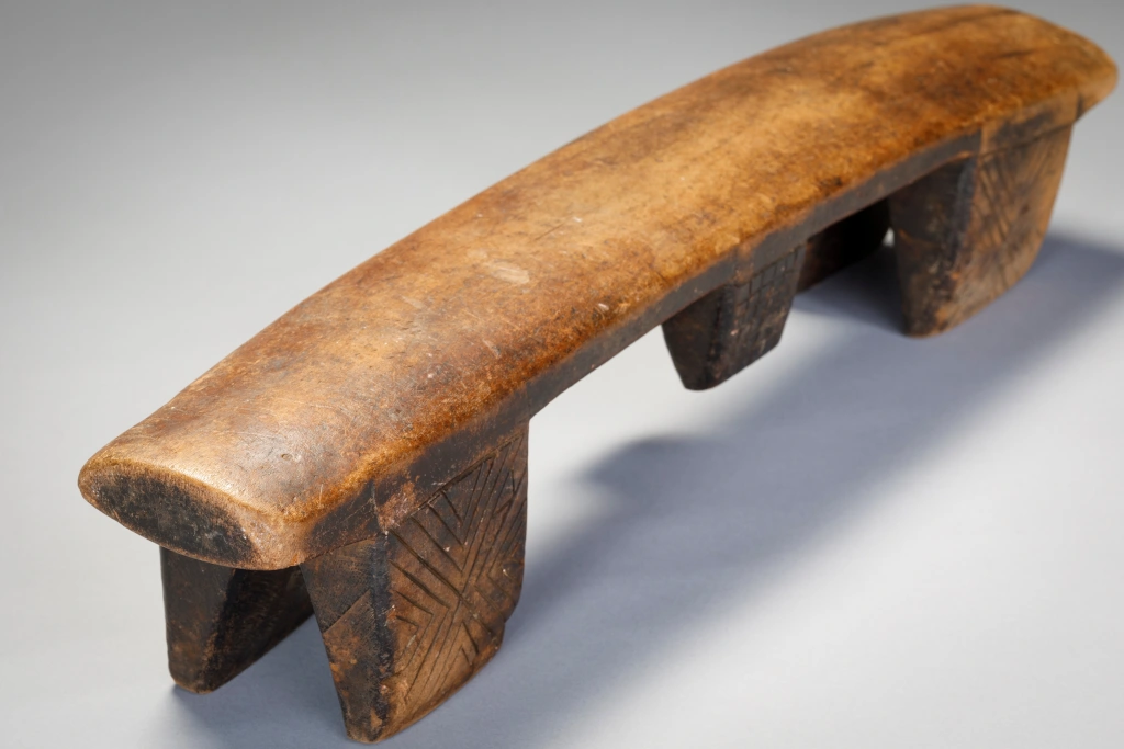 Deux particularités rendent ce très vieil appui-tête particulièrement attachant. En premier lieu, la courbure concave de la plateforme est vraiment inhabituelle et a dû permettre à ses utilisateurs de se décaler à volonté pour poser leur tête à la hauteur la plus confortable. En second lieu le double « téton ombilical » est assez rare aussi bien sur les appuis-tête zoulous que swazi.
