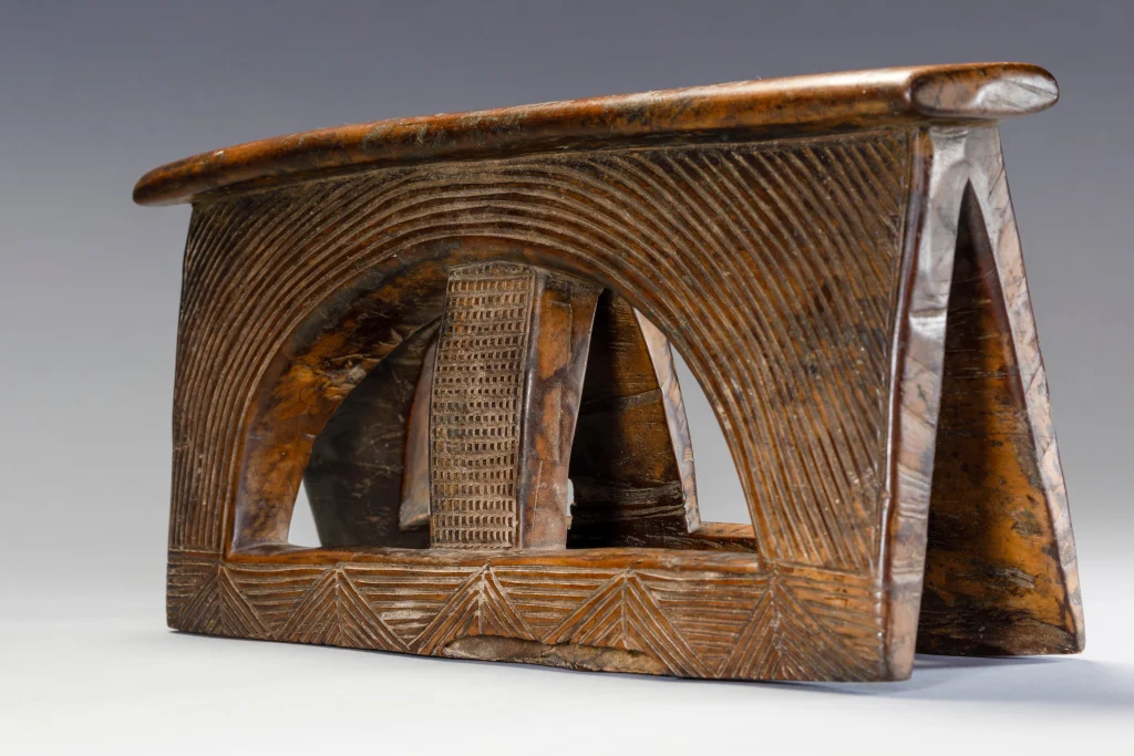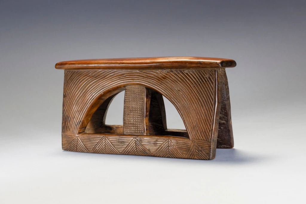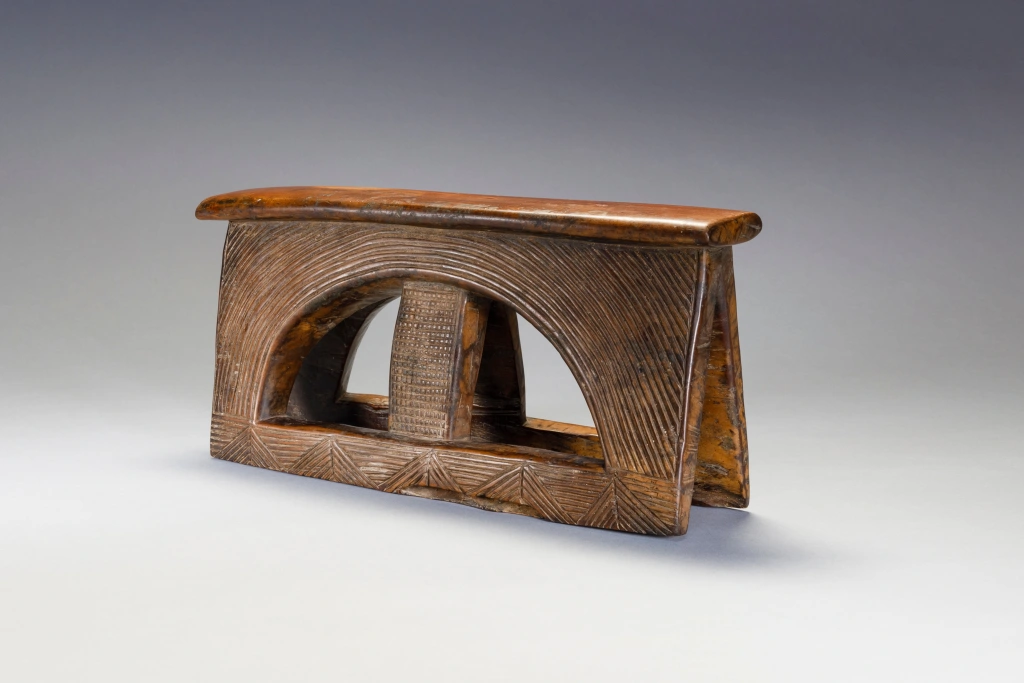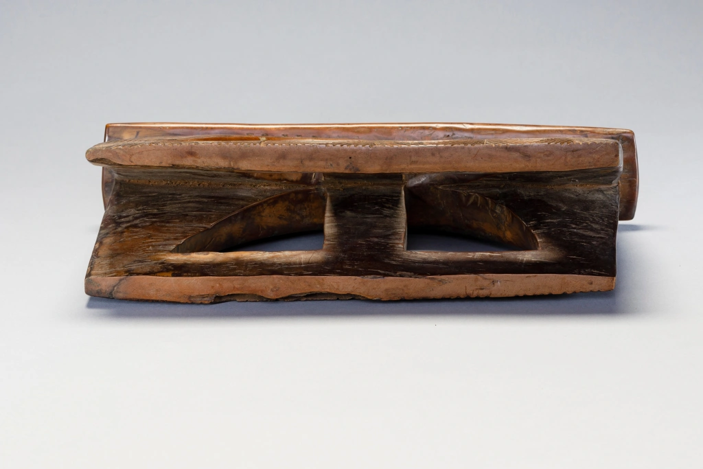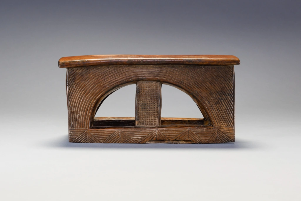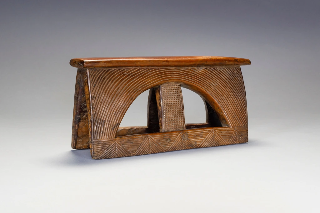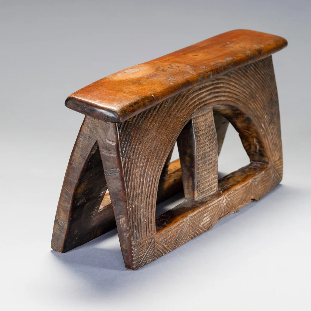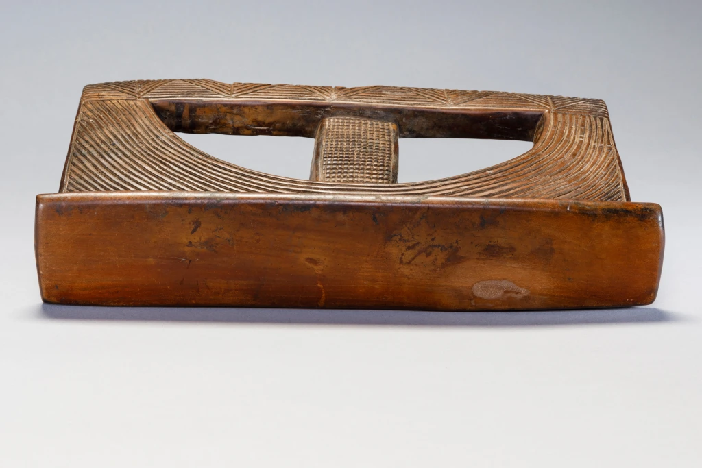 Un appui-tête avec un style extrêmement rare. Le tréteau est rectangulaire percé d’un cercle barré d’un montant central. Les stries et rainures extrêmement fines et serrées sur un bois de couleur miel créent l’harmonie de ce petit appui-tête.