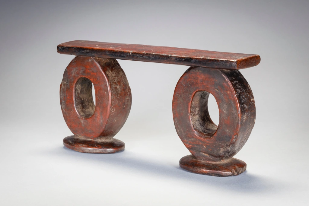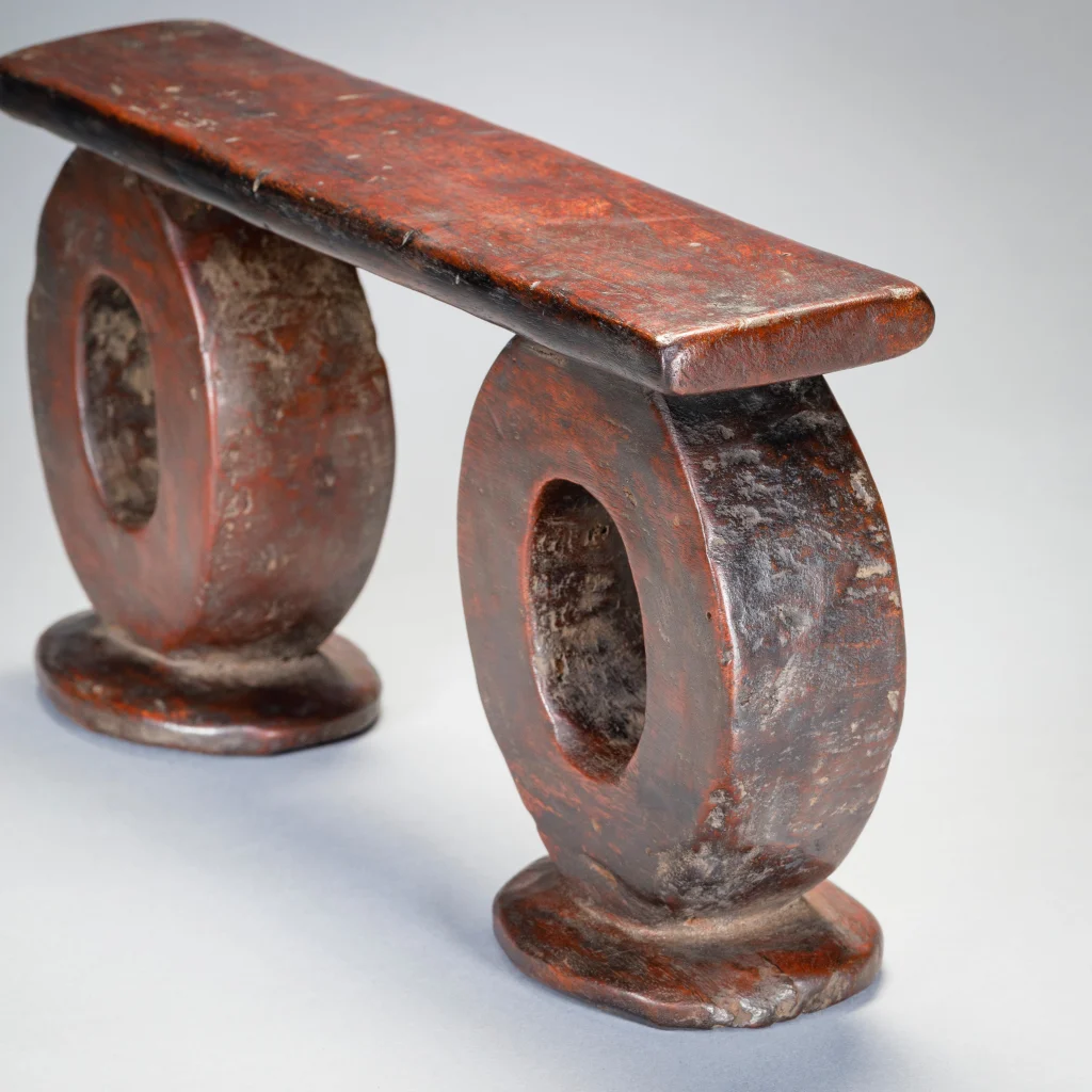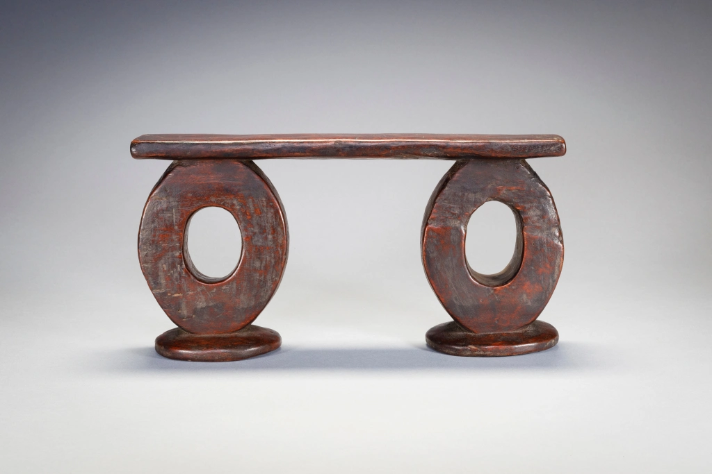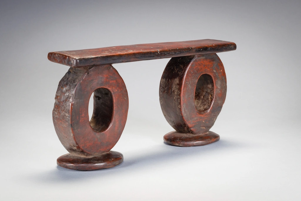 Un appui-tête célèbre car à priori unique dans son style : il repose sur deux pieds en forme de cercles ajourés symbolisant probablement le regard protecteur d’un ancêtre. Sculpté par un inconnu à partir d’un bois rouge et dur, il a acquis au fil du temps une patine brune et brillante.