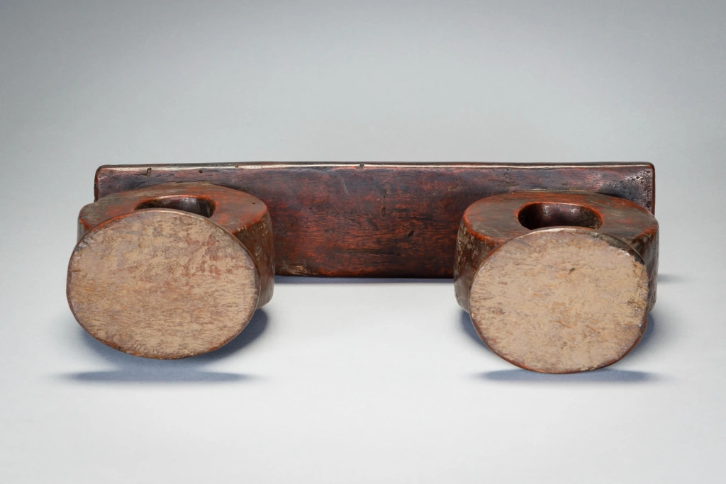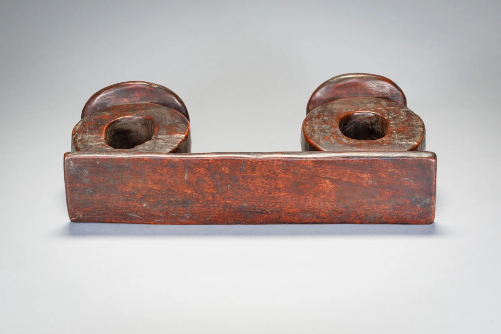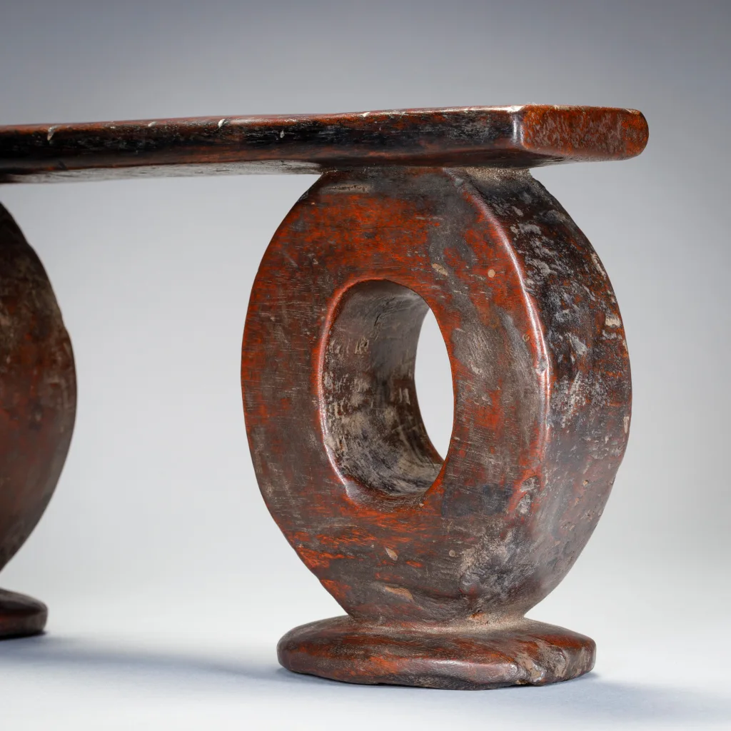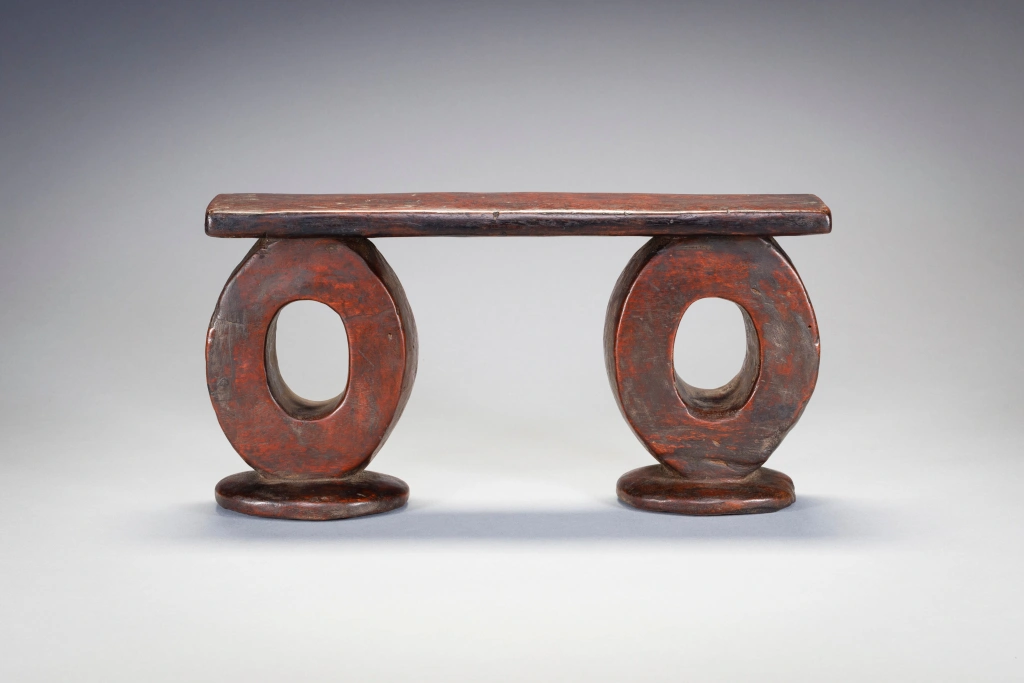 Un appui-tête célèbre car à priori unique dans son style : il repose sur deux pieds en forme de cercles ajourés symbolisant probablement le regard protecteur d’un ancêtre. Sculpté par un inconnu à partir d’un bois rouge et dur, il a acquis au fil du temps une patine brune et brillante.