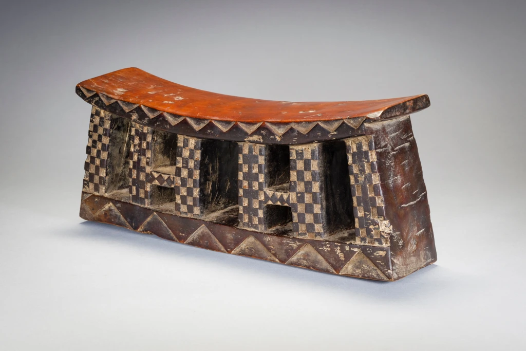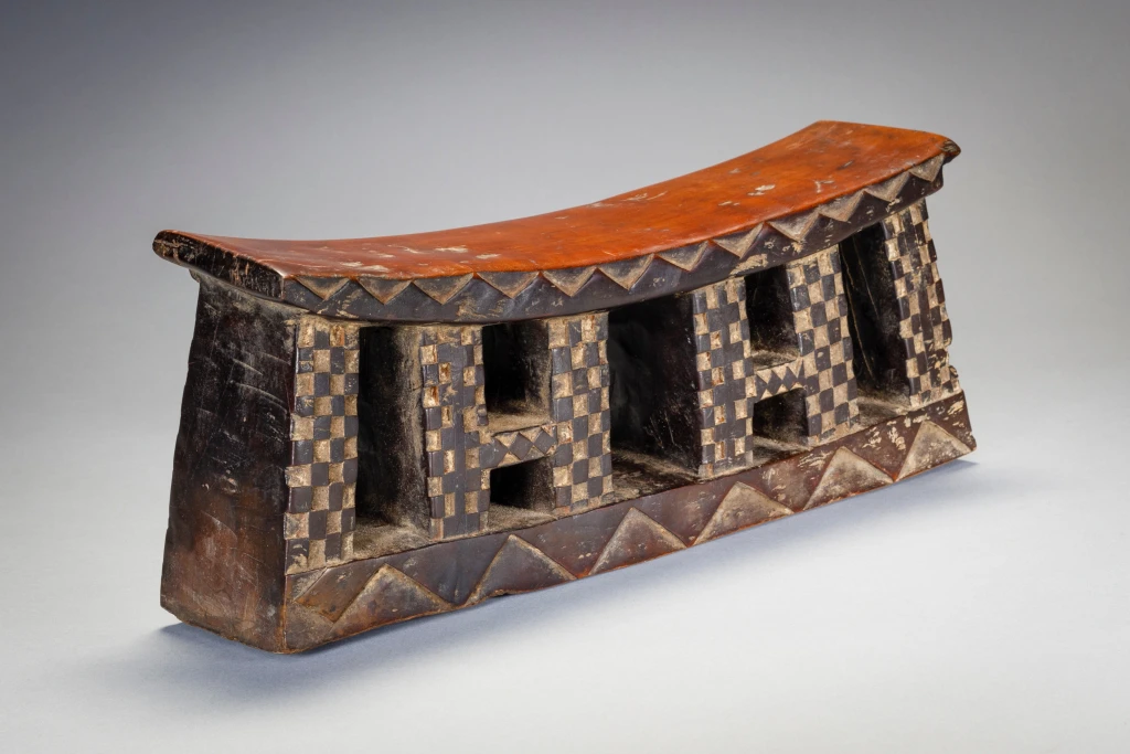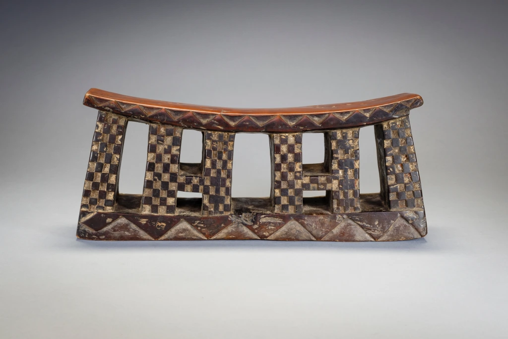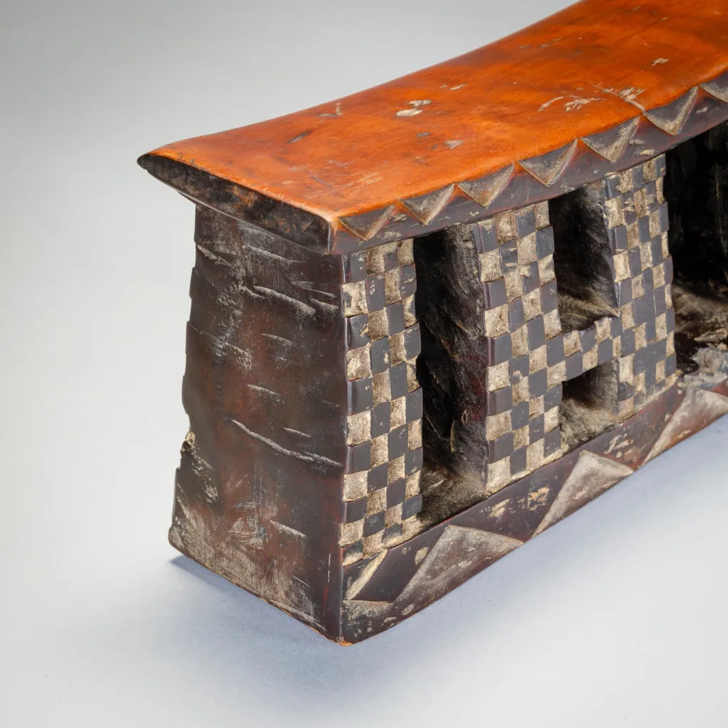 Un appui-tête en bois avec une plateforme incurvée et une base rectangulaire sur laquelle on retrouve des motifs triangulaires clairs et foncés. Les pieds sont rectangulaires et ont des motifs de damier en relief. En raison de leur longueur, on pense que les appuis-tête zoulous étaient utilisés comme tabourets pendant la journée et comme oreillers pendant la nuit. Les Zoulous croient que le sommeil et les rêves sont le moyen d’intervention des ancêtres. L’appui-tête serait donc plus qu’un simple oreiller, il serait un instrument de médiation entre le monde des vivants et celui des morts.