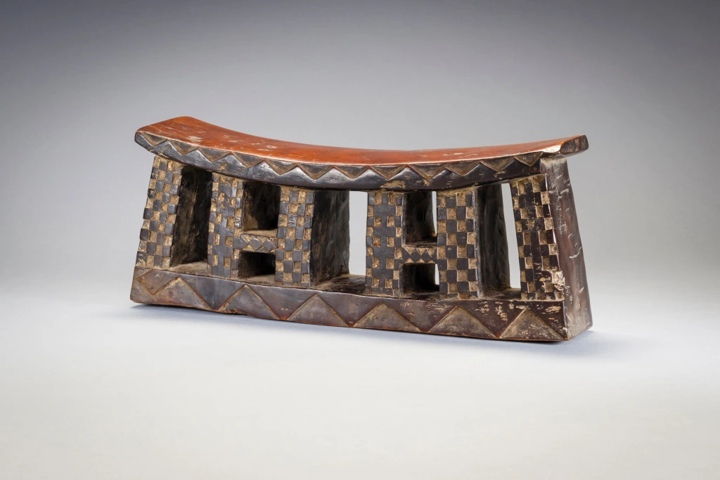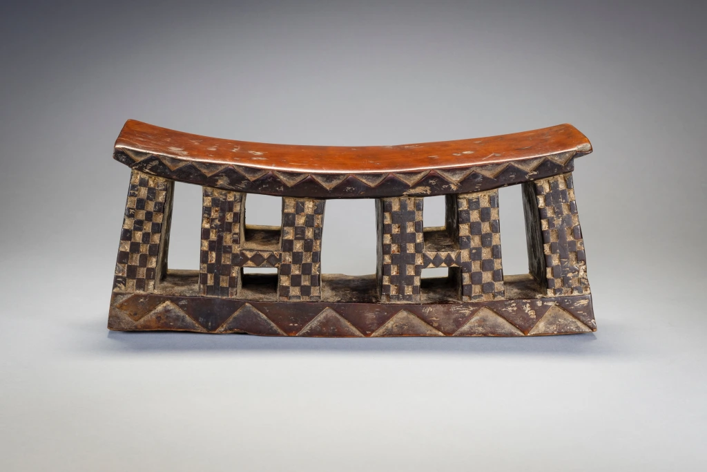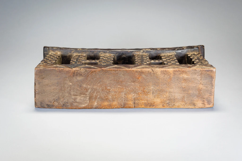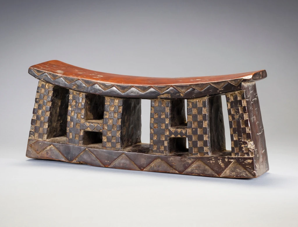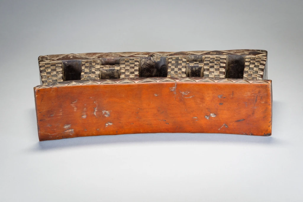 Un appui-tête en bois avec une plateforme incurvée et une base rectangulaire sur laquelle on retrouve des motifs triangulaires clairs et foncés. Les pieds sont rectangulaires et ont des motifs de damier en relief. En raison de leur longueur, on pense que les appuis-tête zoulous étaient utilisés comme tabourets pendant la journée et comme oreillers pendant la nuit. Les Zoulous croient que le sommeil et les rêves sont le moyen d’intervention des ancêtres. L’appui-tête serait donc plus qu’un simple oreiller, il serait un instrument de médiation entre le monde des vivants et celui des morts.