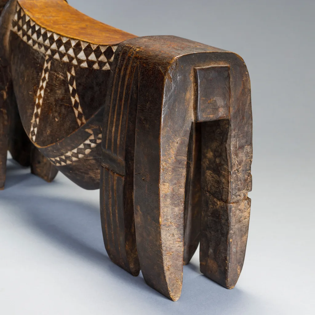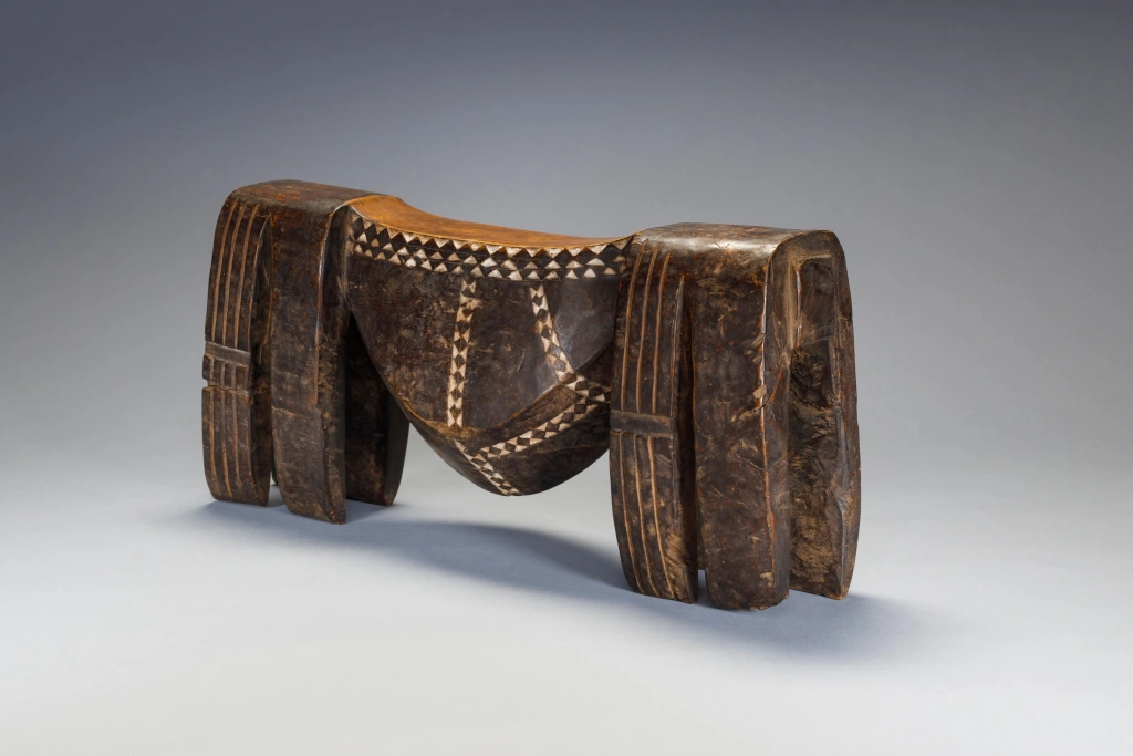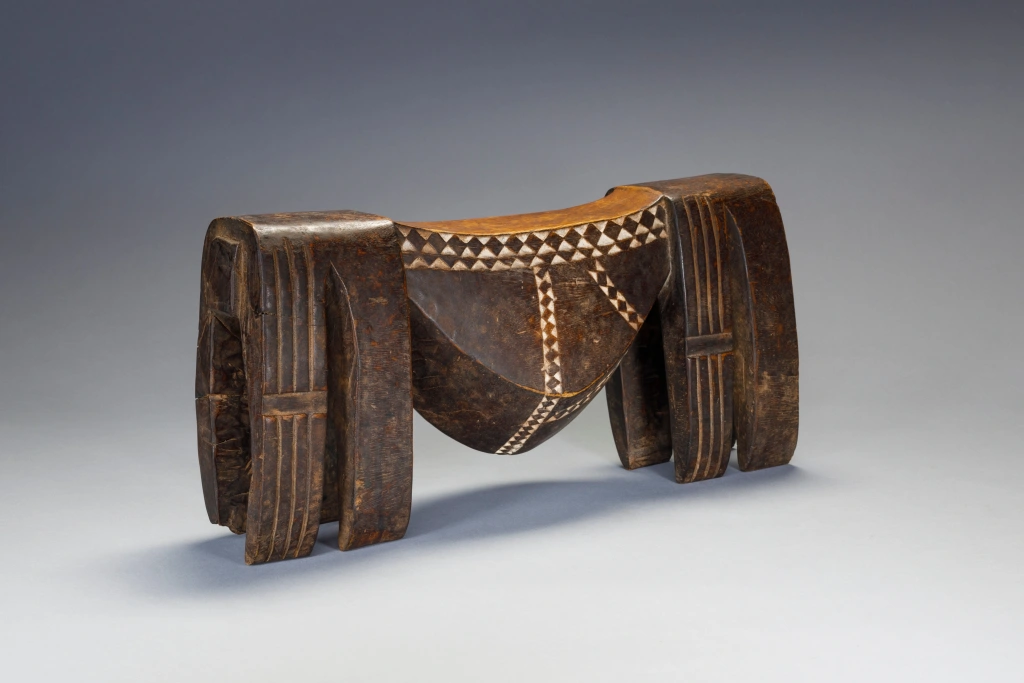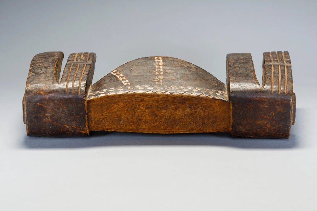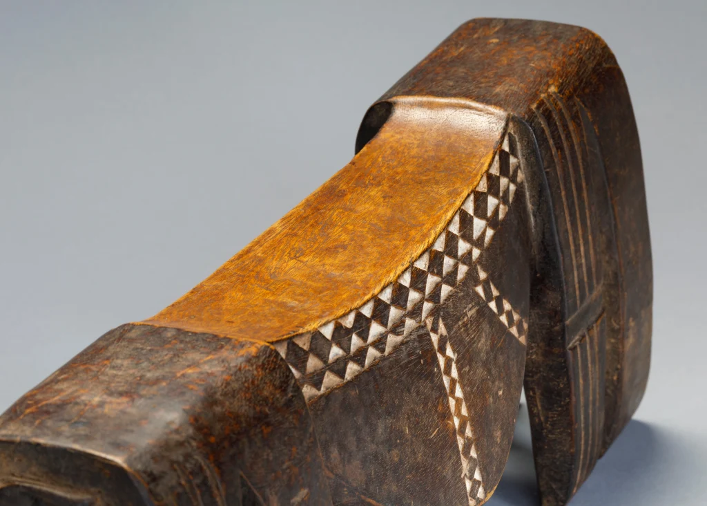 Un appui-tête ventru avec une cavité qui servait probablement de boîte à bijou, la porte s’étant sûrement perdus au fil des années. Les appuis-tête à cavité étaient des pièces considérées comme luxueuses pour les bijoux des femmes ou le tabac des hommes. Cette pièce a appartenu à Eve Lowen, femme de Graham Lowen qui s’était entiché de quelques rares appuis-tête de la collection de son mari, dont celui-ci.