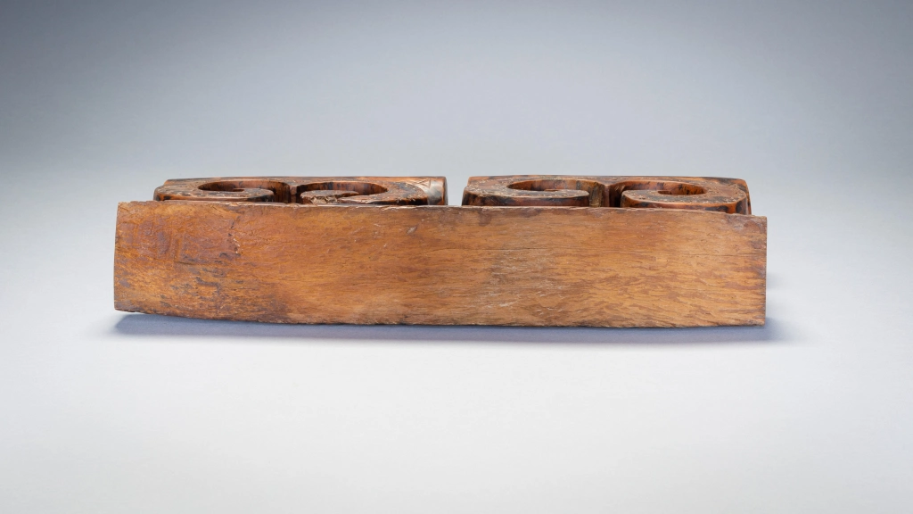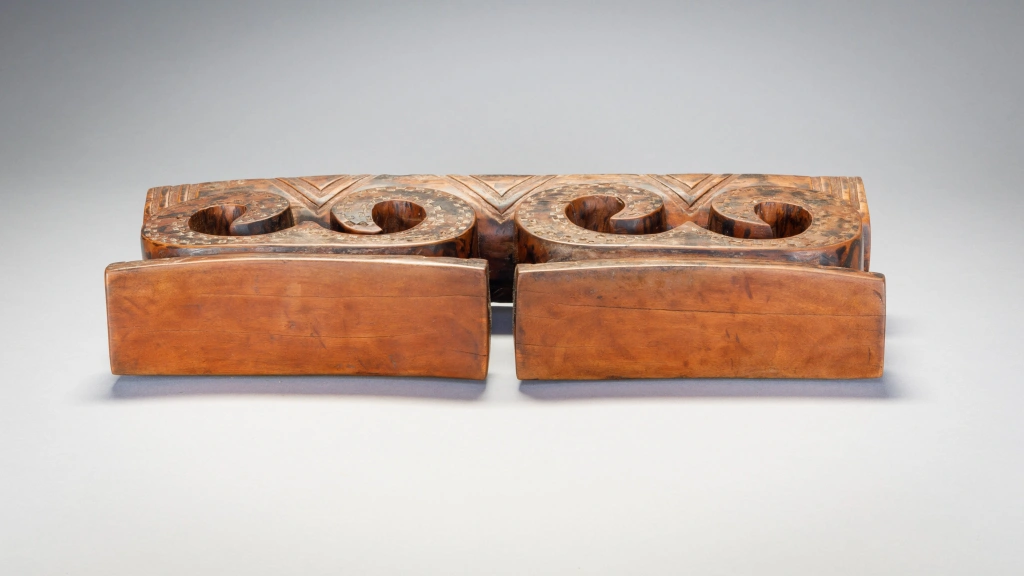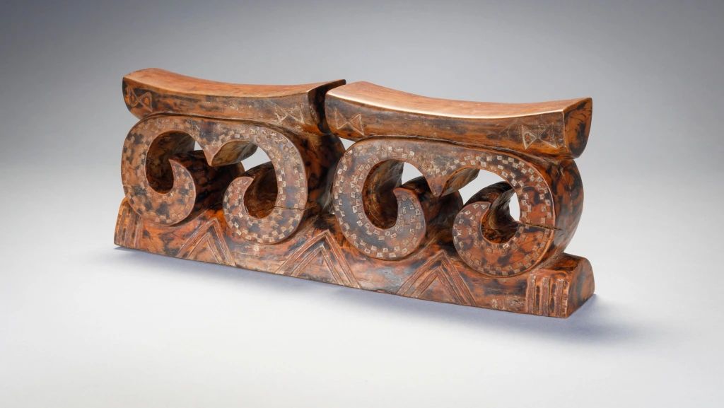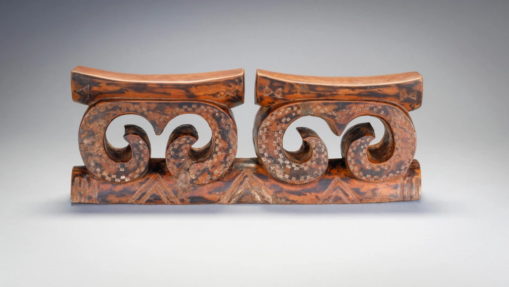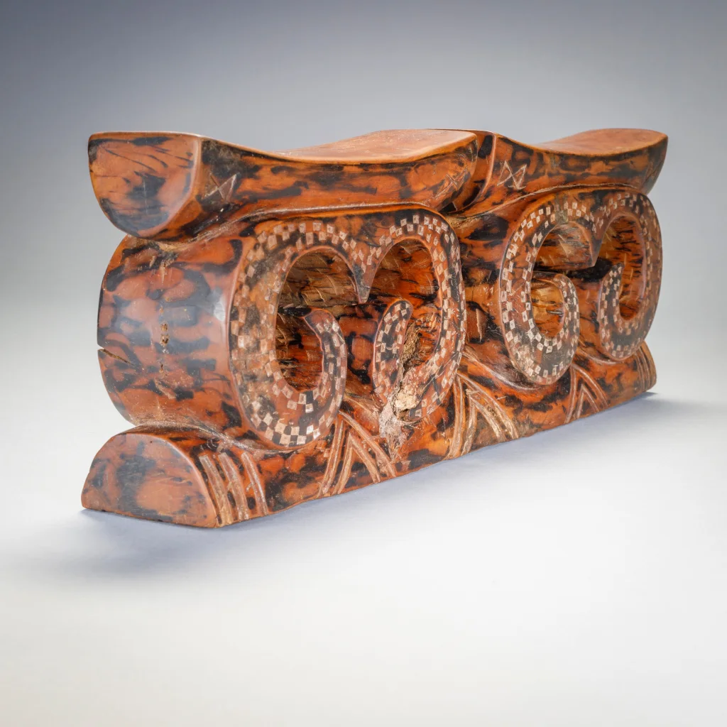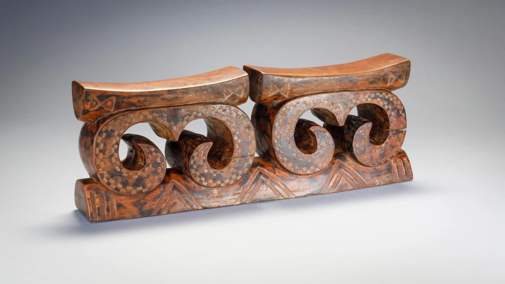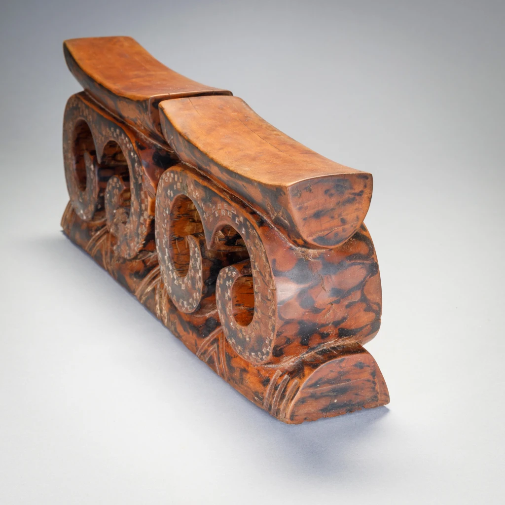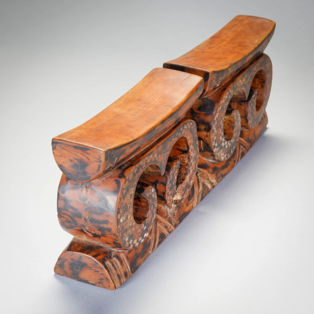 Une pièce récente de la seconde moitié du XXe siècle en bois marbré, cet appui-tête double tire son originalité des arabesques qui supportait les deux plateformes.