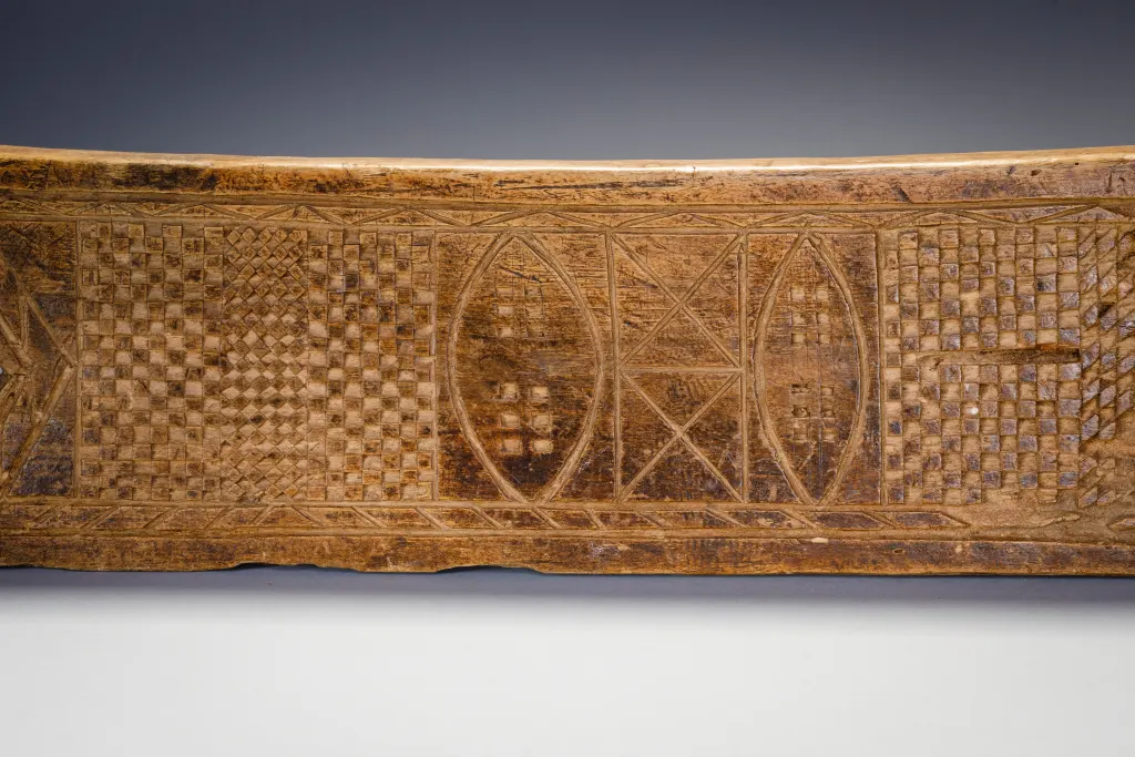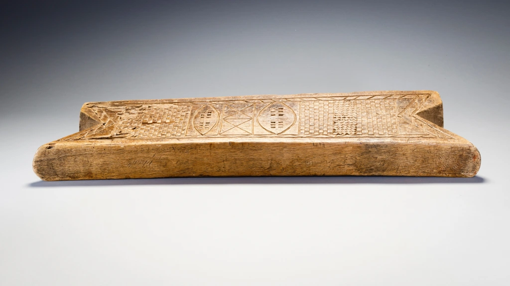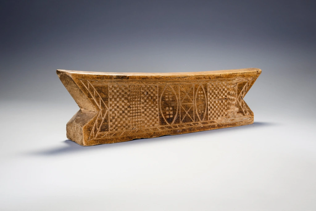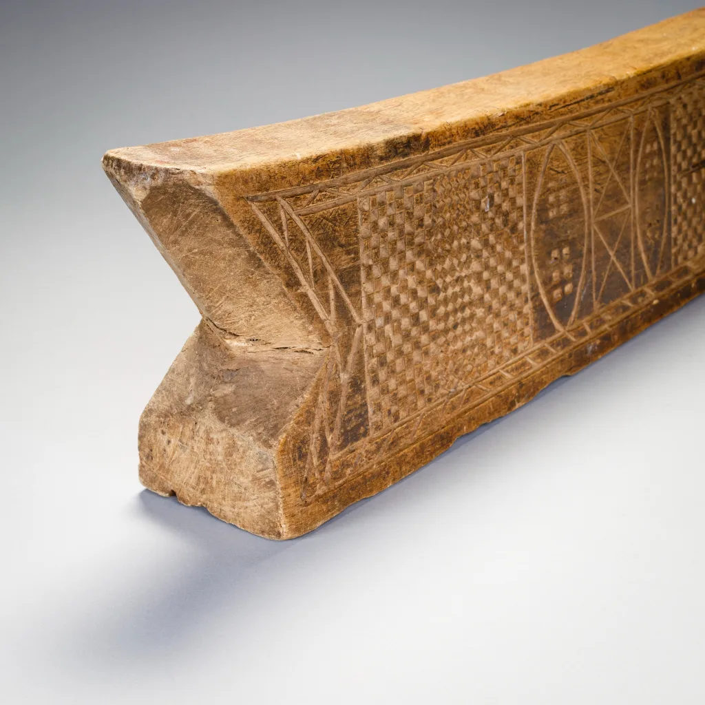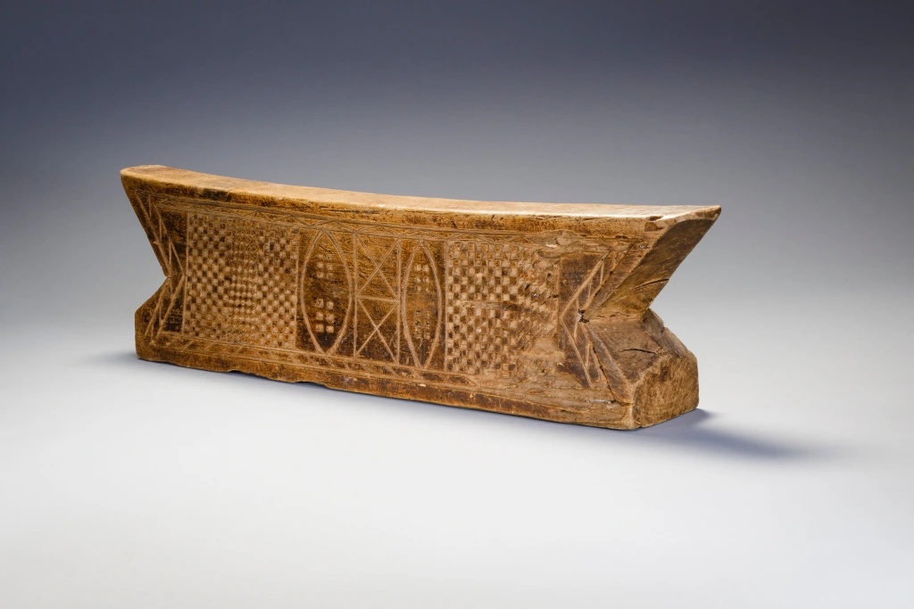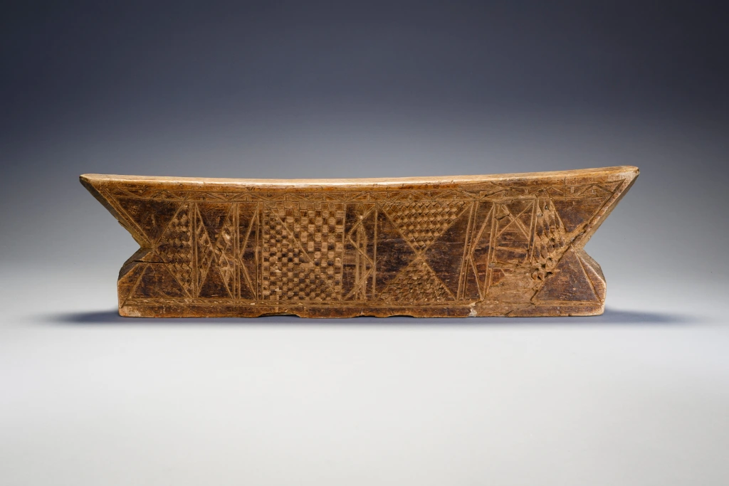 Un appui-tête bloc en bois léger décoré de damiers et de représentation de boucliers zoulou. Ses extrémités en pointes de diamant lui donnent un aspect particulier. Lucie Rhoda une Californienne a collecté cette pièce dans la région de Tugela Ferry en 1972 alors qu’elle constituait sa collection de paniers en osier zoulou.