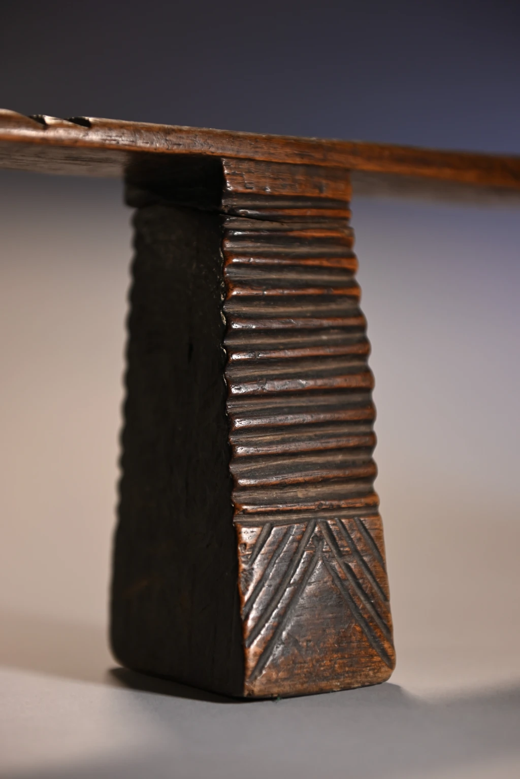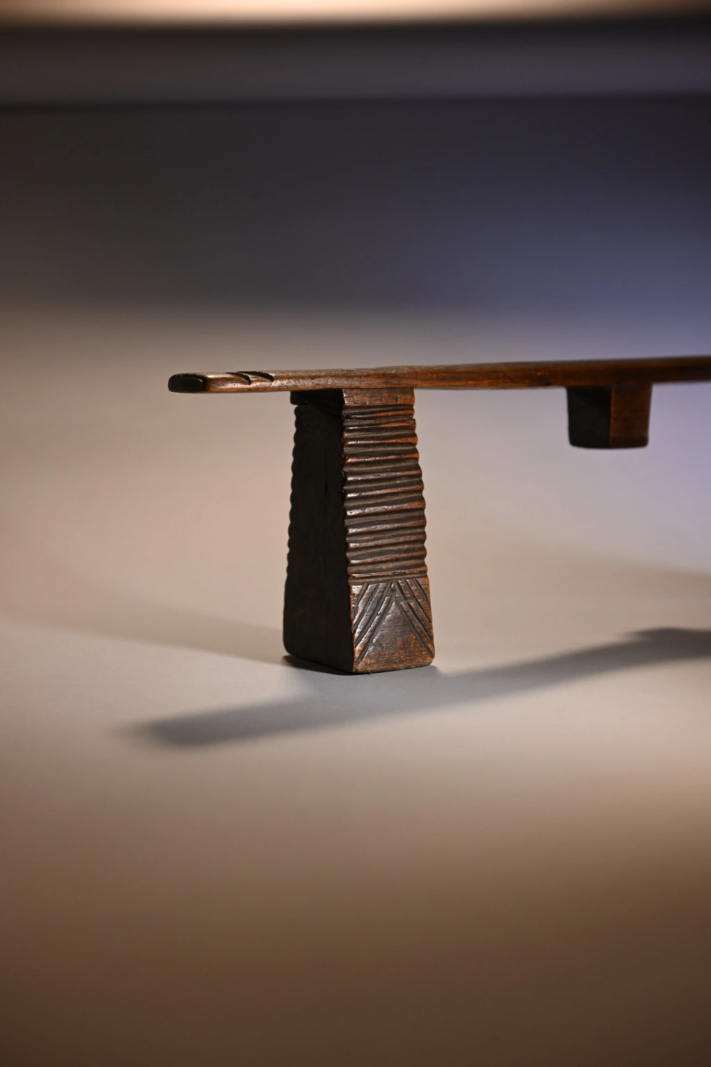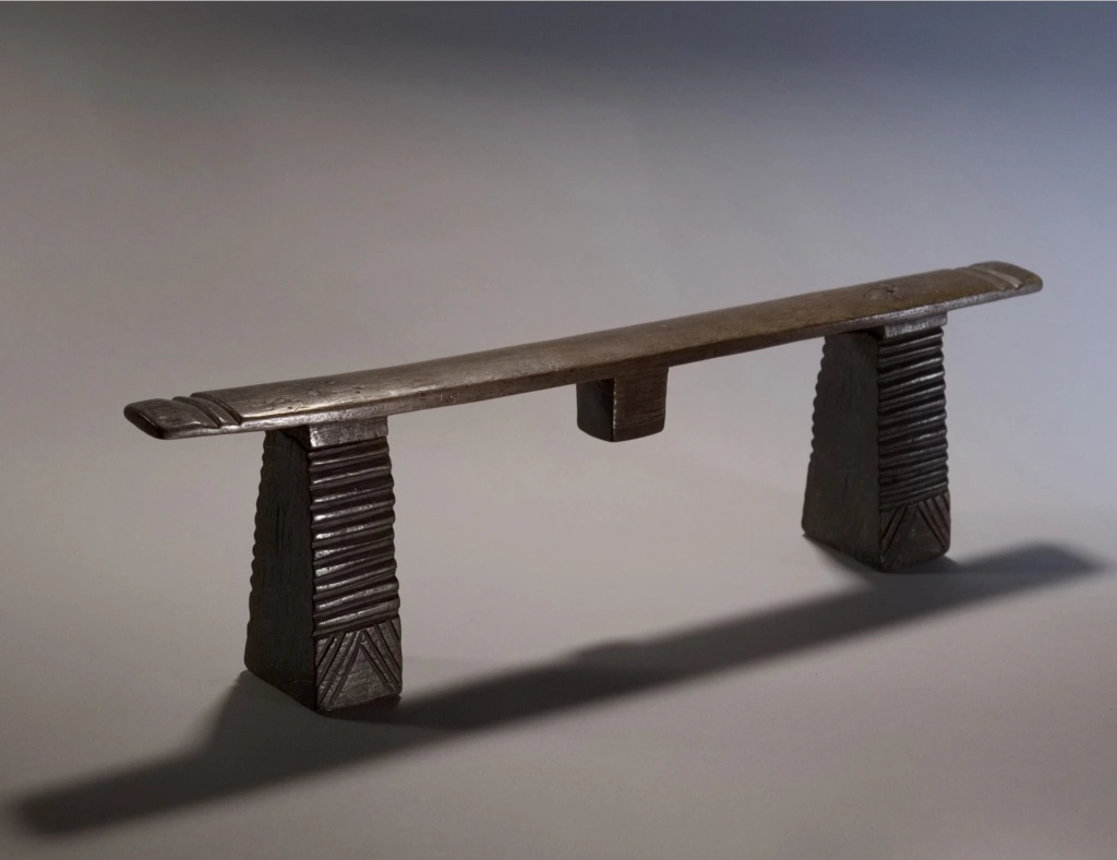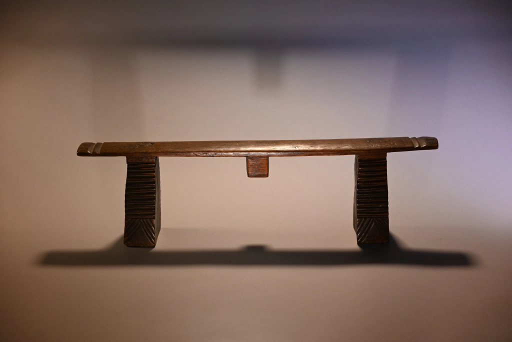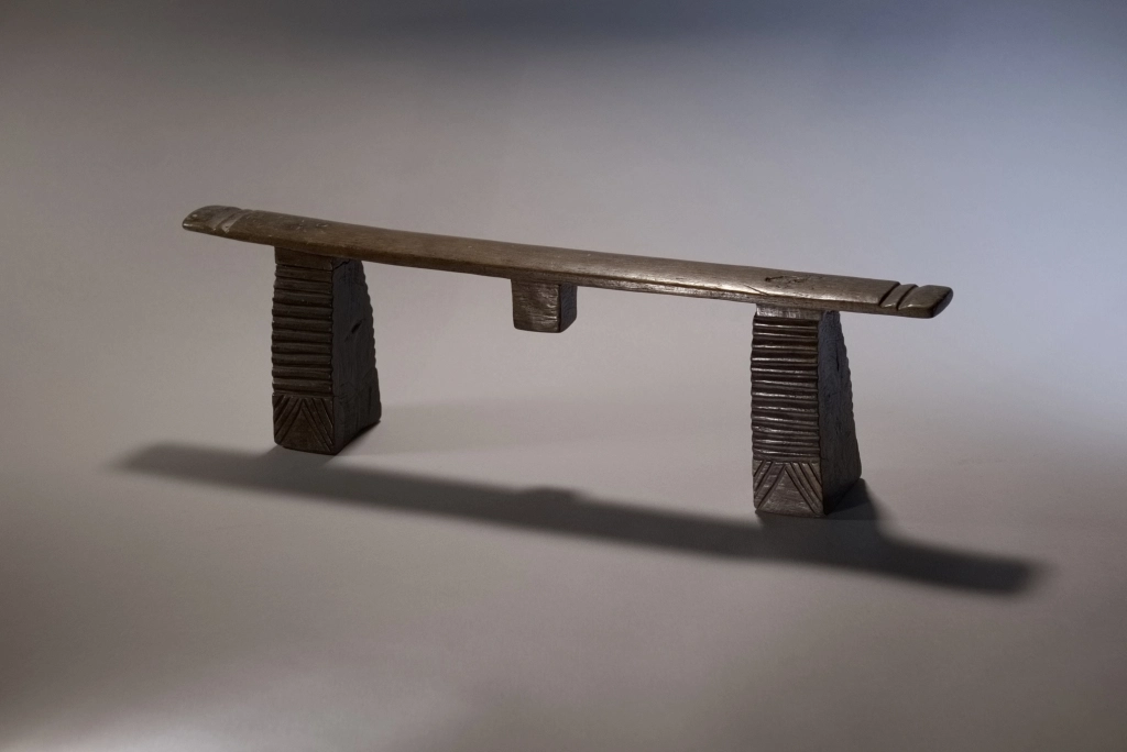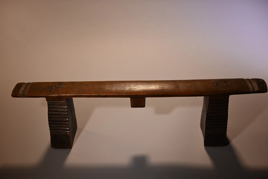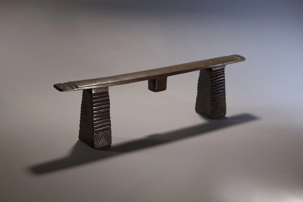 Une pièce également d’influence mixte et qui pourrait tout à fait se situer dans la collection swazi . Le téton est du style swazi contrairement à la plateforme plate en sous-face (au lieu d’arrondis comme trouvées généralement chez les swazis) et les pieds dépourvus de cannelures. Nous avons peu d’informations, mais quelle que soit son origine précise, sa finesse et son profil rectiligne contribuent à sa pureté.