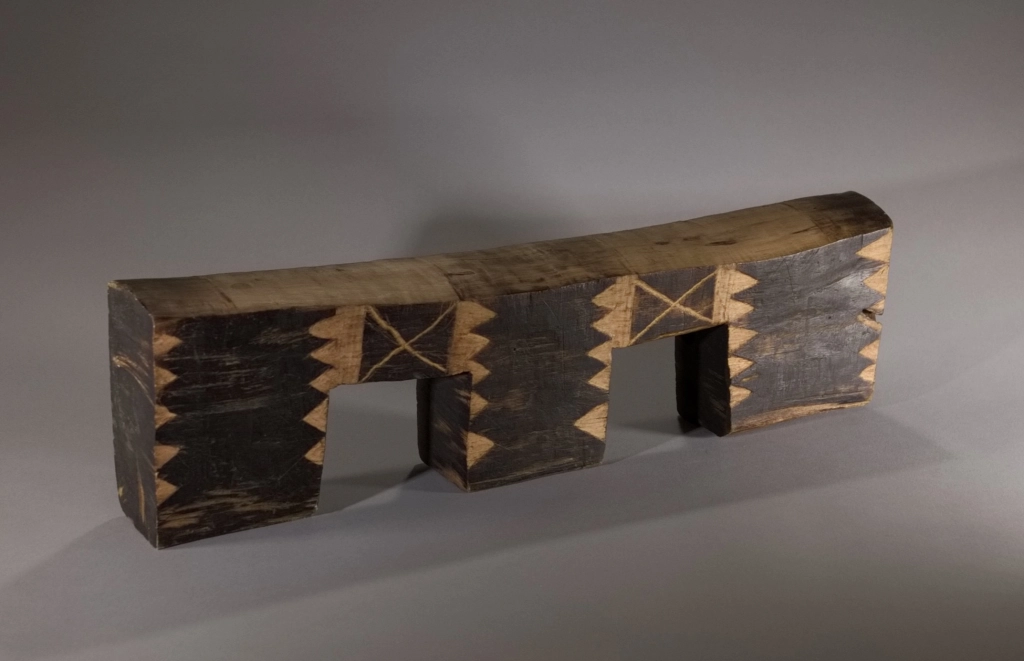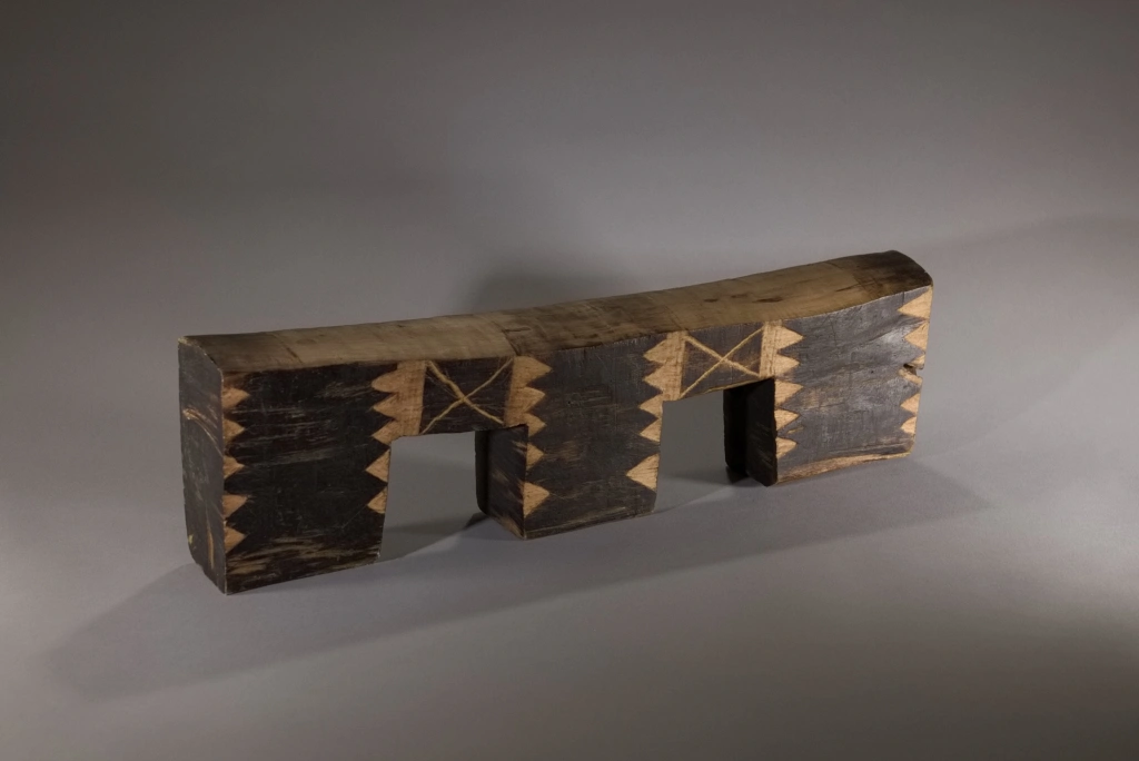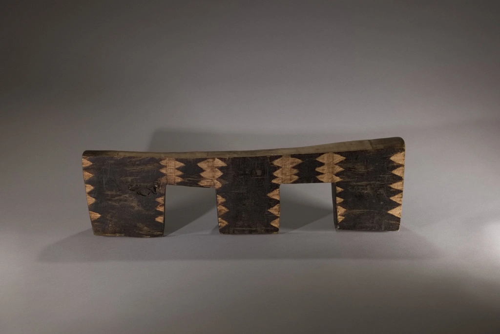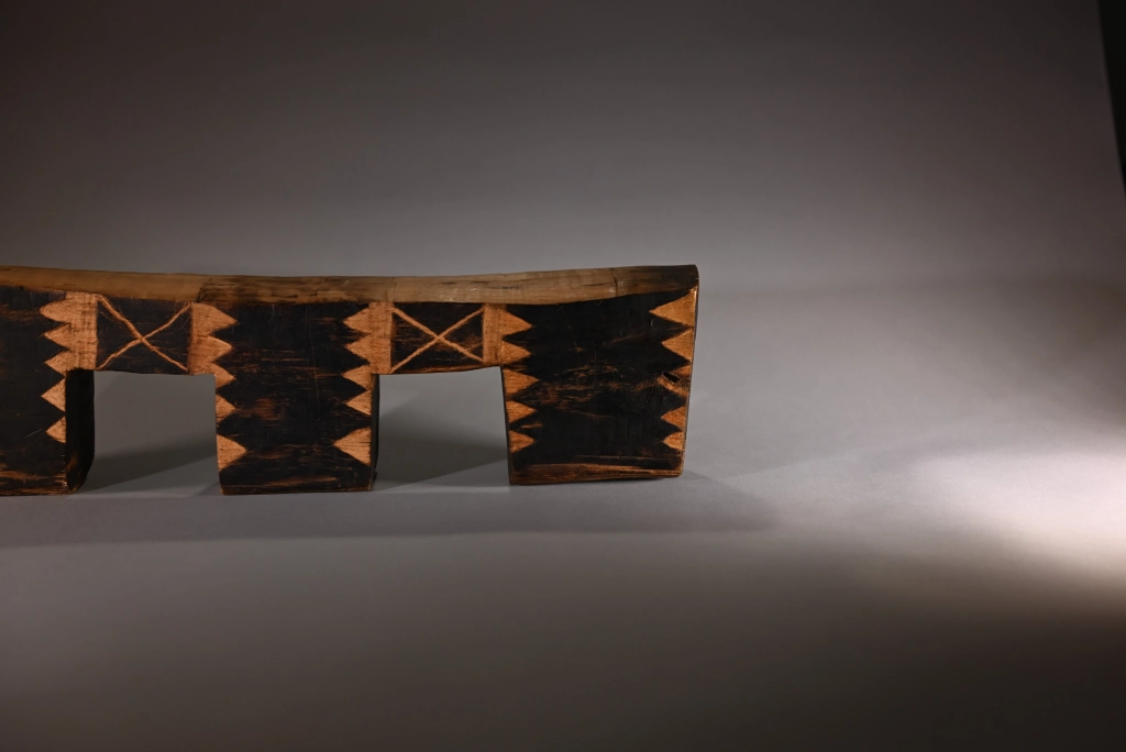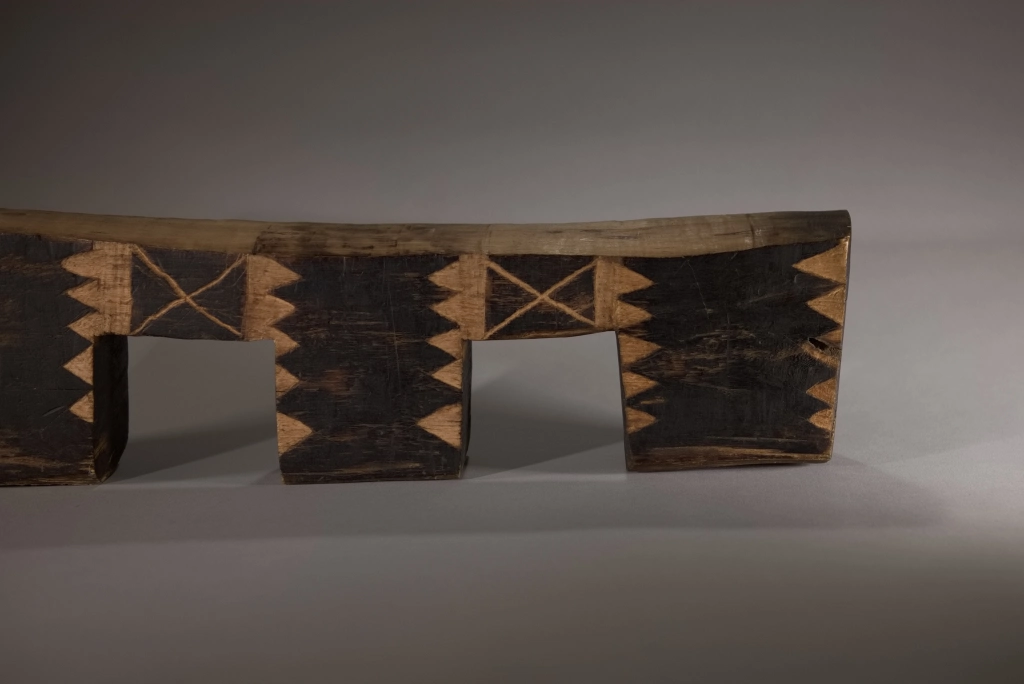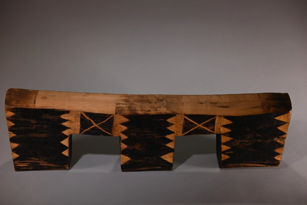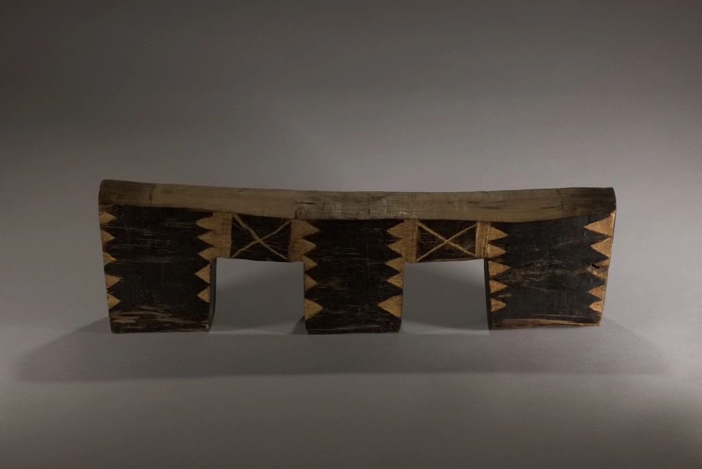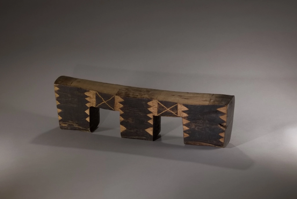 Bien que beaucoup plus grossière , cette pièce n’est pas sans rappeler le style du sculpteur Gqishilili Ngubane, spécialiste des blocs Msinga à doubles arches décorés de pyrogravures comme cela est représenté dans l’ouvrage Architecture of Sleep. Cet appui-tête taillé « à la serpe » dégage une force adoucie par les décorations en pyrogravures et ses marques d’usages.