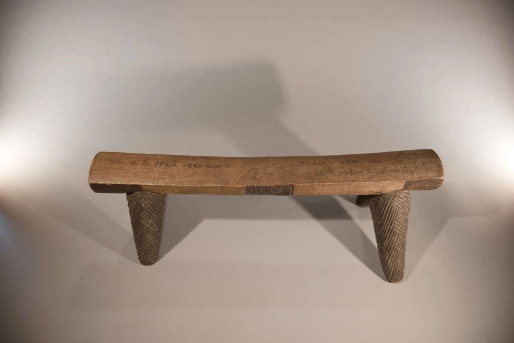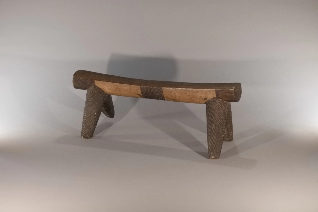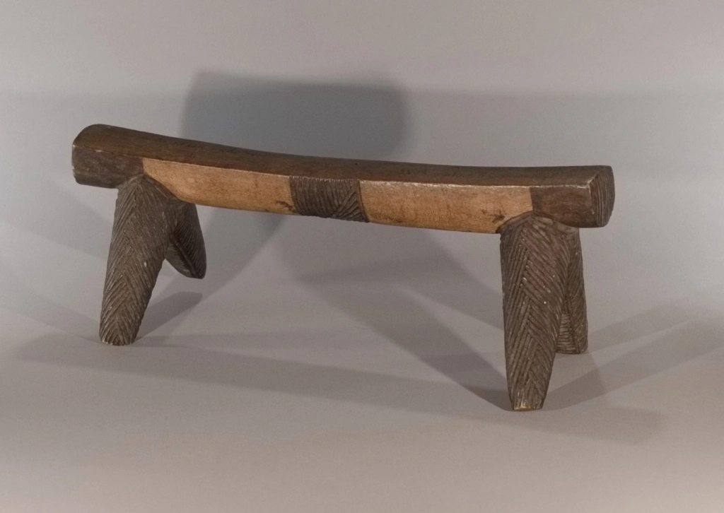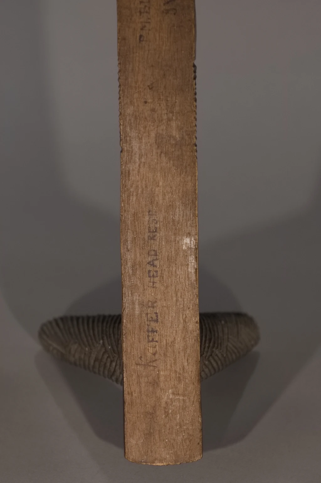 Un appui-tête extrêmement finement sculpté par un artiste disposant d’une technique affirmée. Il mixe les styles zoulou (plateforme et profil global), Swazi avec un simulacre de téton central représenté par de fines rainures et enfin Nguni avec des stries sur les pieds proches des cannelures Nguni. Cette pièce est largement représentée dans les documentations et sur le net, mais ne l’a jamais été dans aucun ouvrage. Elle fait pourtant partie des pièces emblématiques chez les collectionneurs grâce à son inscription sur la plate-forme très lisible « Kaffer head rest P.M.Burg Natal 1904 J.W.R. de Poer. R.Garrison.Regt ». Une enquête est désormais à initier pour découvrir l’histoire de son origine et de ce J.W.R de Poer du régiment Garrisson à l’époque de la guerre des Boers !