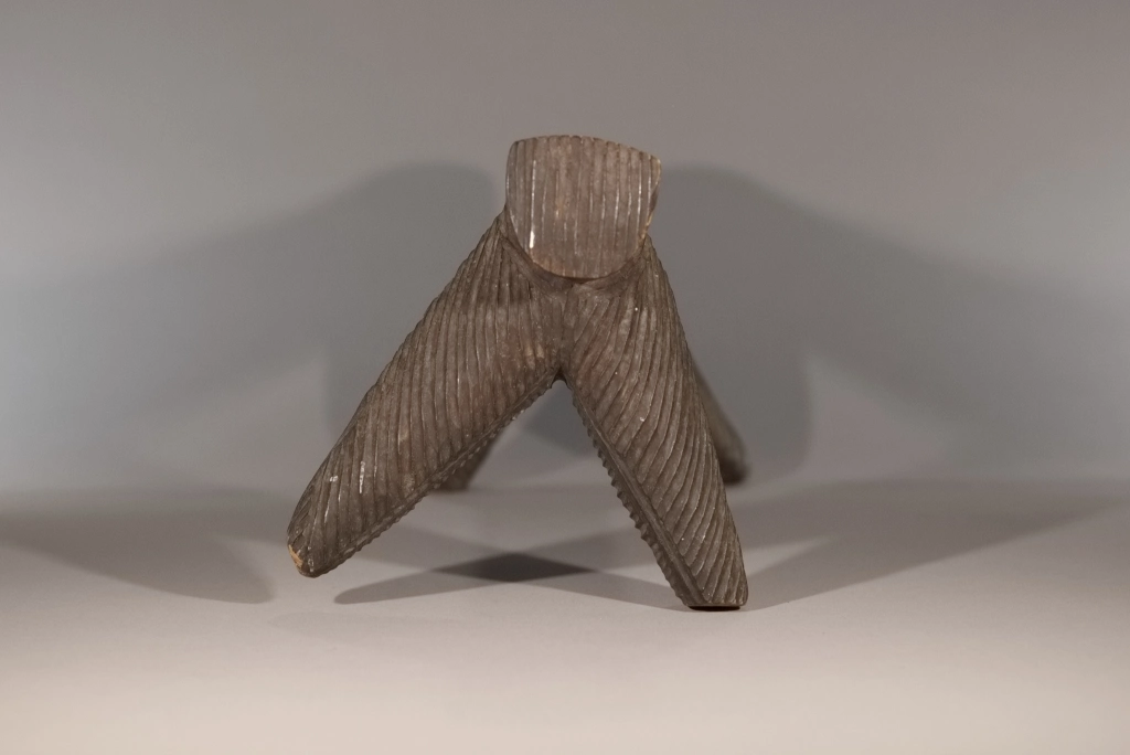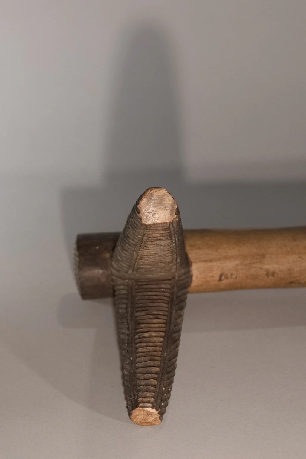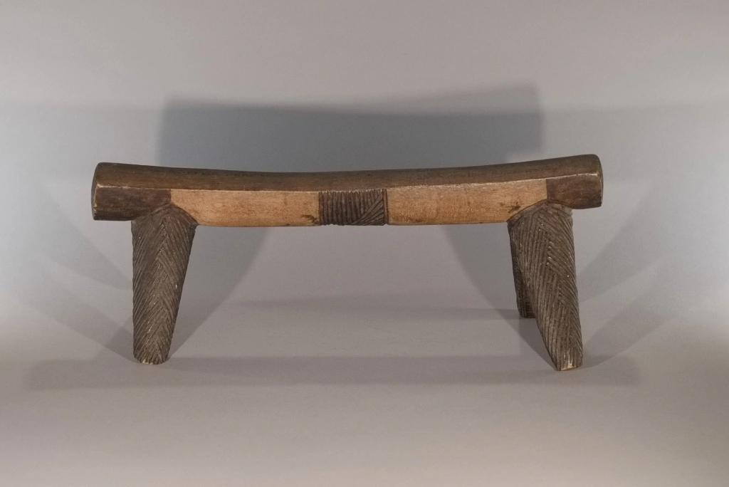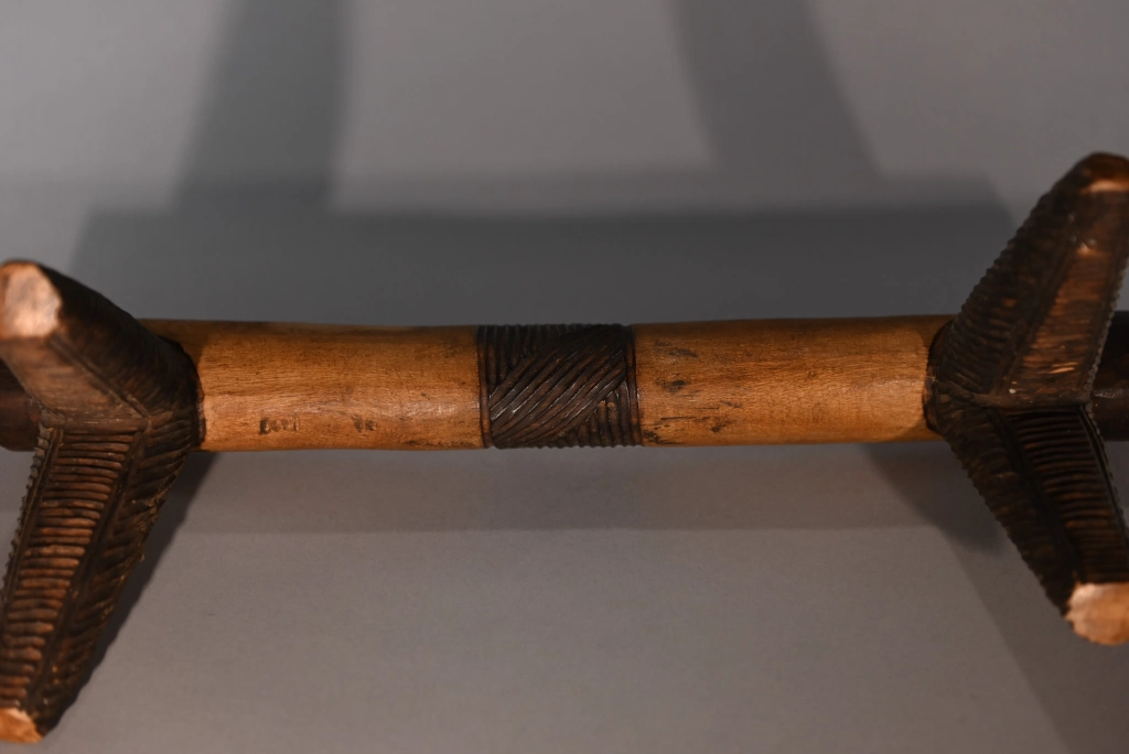 Un appui-tête extrêmement finement sculpté par un artiste disposant d’une technique affirmée. Il mixe les styles zoulou (plateforme et profil global), Swazi avec un simulacre de téton central représenté par de fines rainures et enfin Nguni avec des stries sur les pieds proches des cannelures Nguni. Cette pièce est largement représentée dans les documentations et sur le net, mais ne l’a jamais été dans aucun ouvrage. Elle fait pourtant partie des pièces emblématiques chez les collectionneurs grâce à son inscription sur la plate-forme très lisible « Kaffer head rest P.M.Burg Natal 1904 J.W.R. de Poer. R.Garrison.Regt ». Une enquête est désormais à initier pour découvrir l’histoire de son origine et de ce J.W.R de Poer du régiment Garrisson à l’époque de la guerre des Boers !