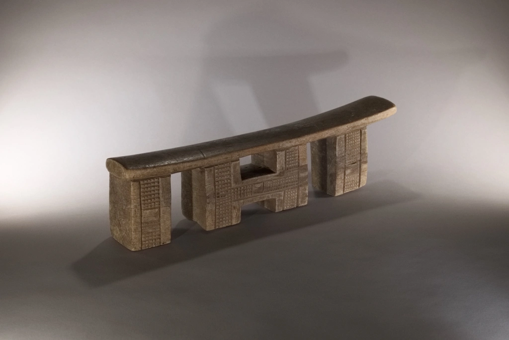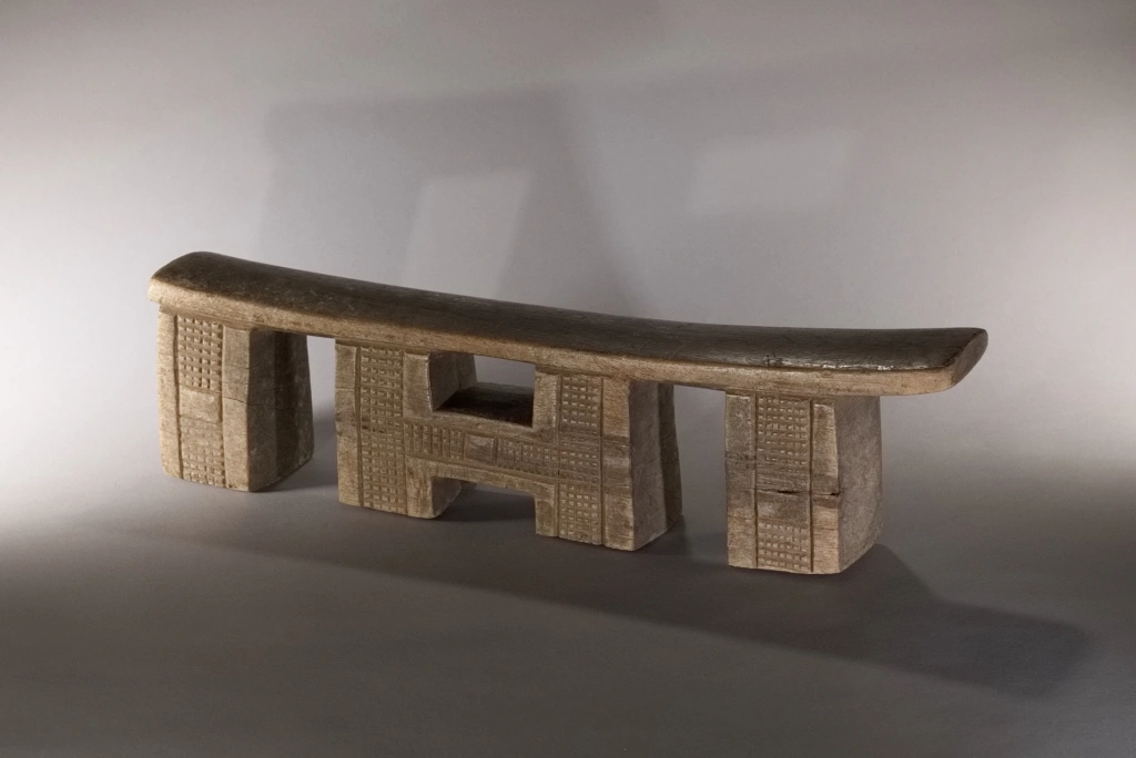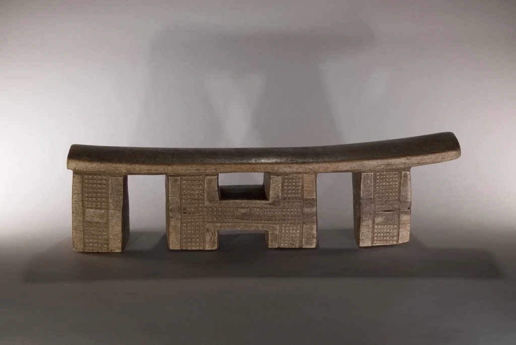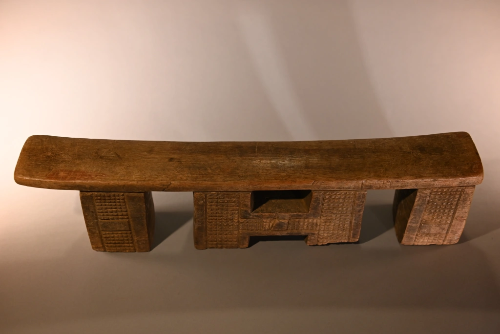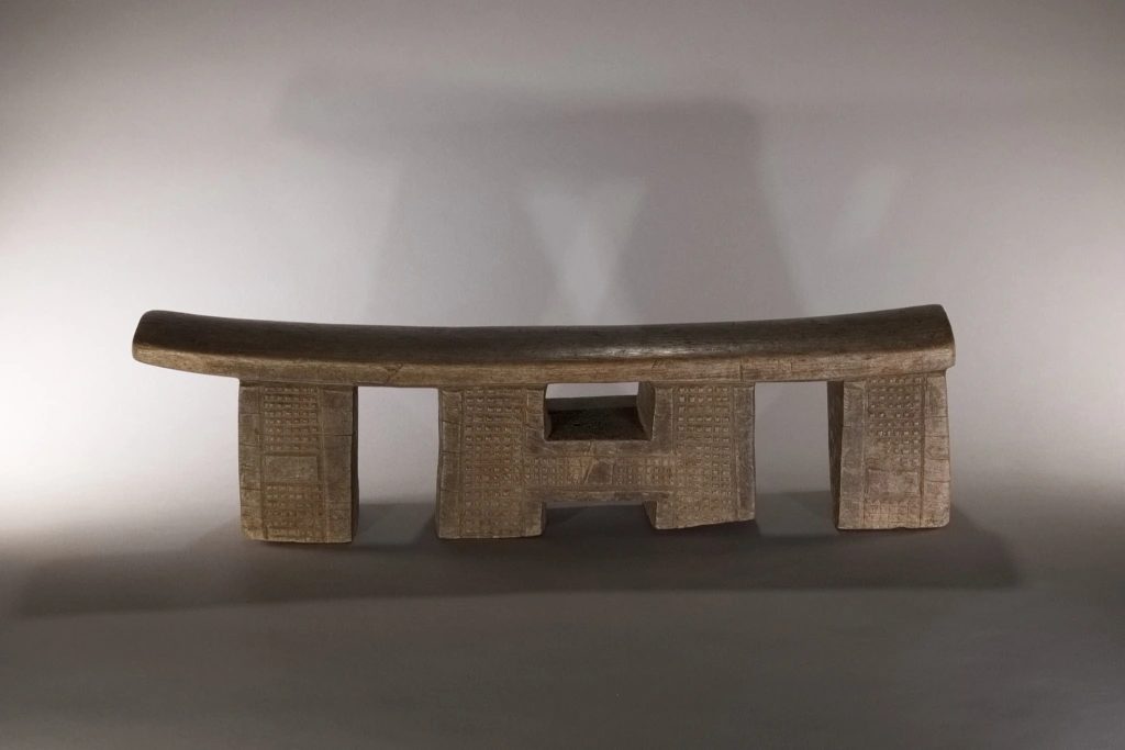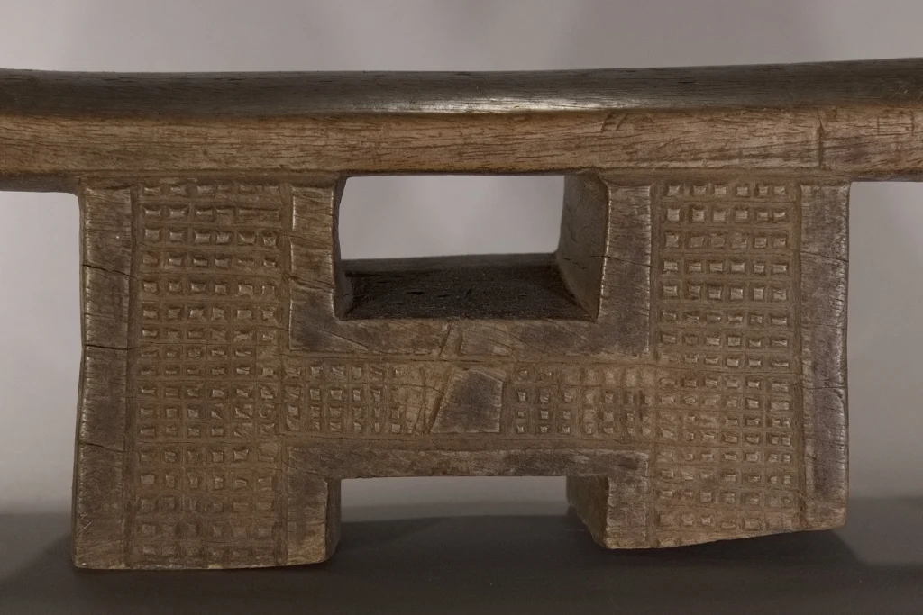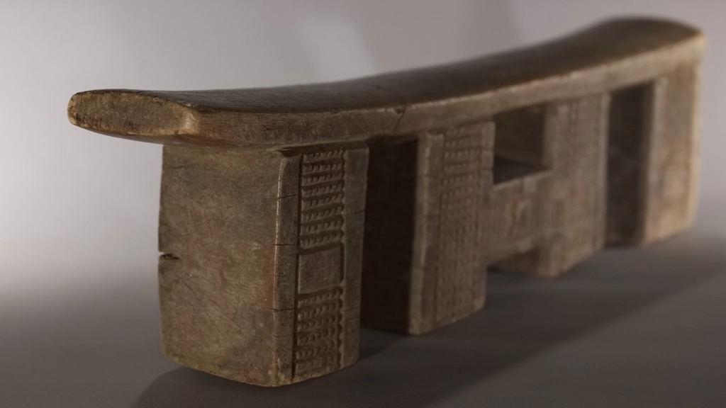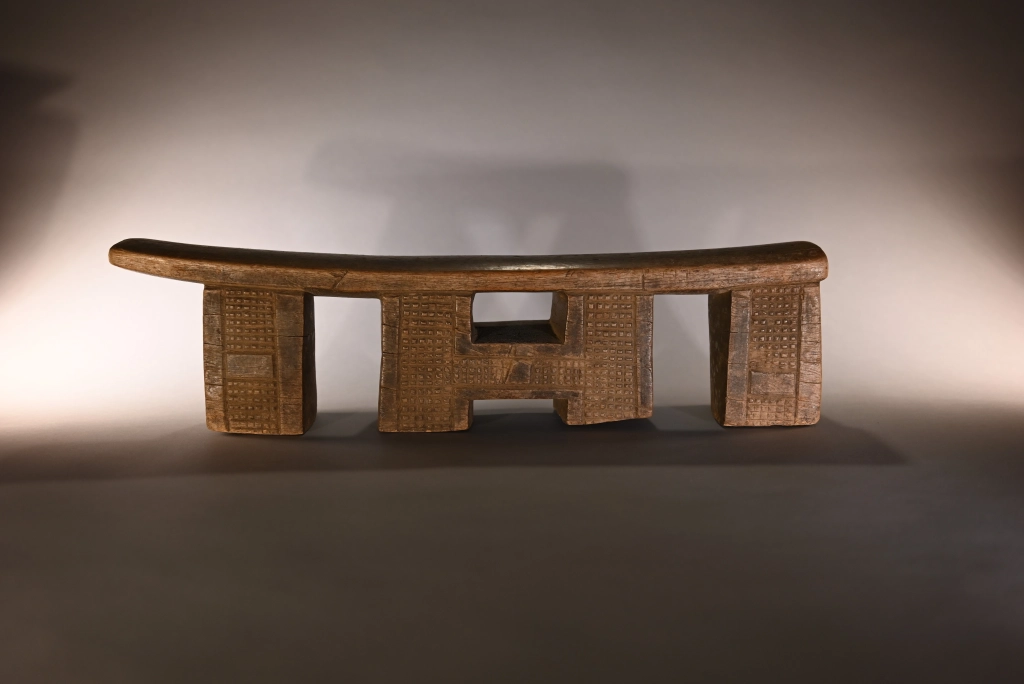 La grande caractéristique de cet appui-tête se trouve dans l’originalité de la réparation locale qui a été effectuée sur cette pièce : une aile a dû se briser, son propriétaire coupa alors celle-ci au ras du pied, puis lima l’extrémité afin de prolonger son utilisation. Cette dysmétrie donne une forte personnalité à l’objet qui est, par ailleurs, finement décoré par des bandes d’amasumpa au centre des quatre pieds et de la barre transversale qui relie les deux pieds centraux. Sa couleur miel et sa patine apportent chaleur et vécu à cet appui-tête attachant.