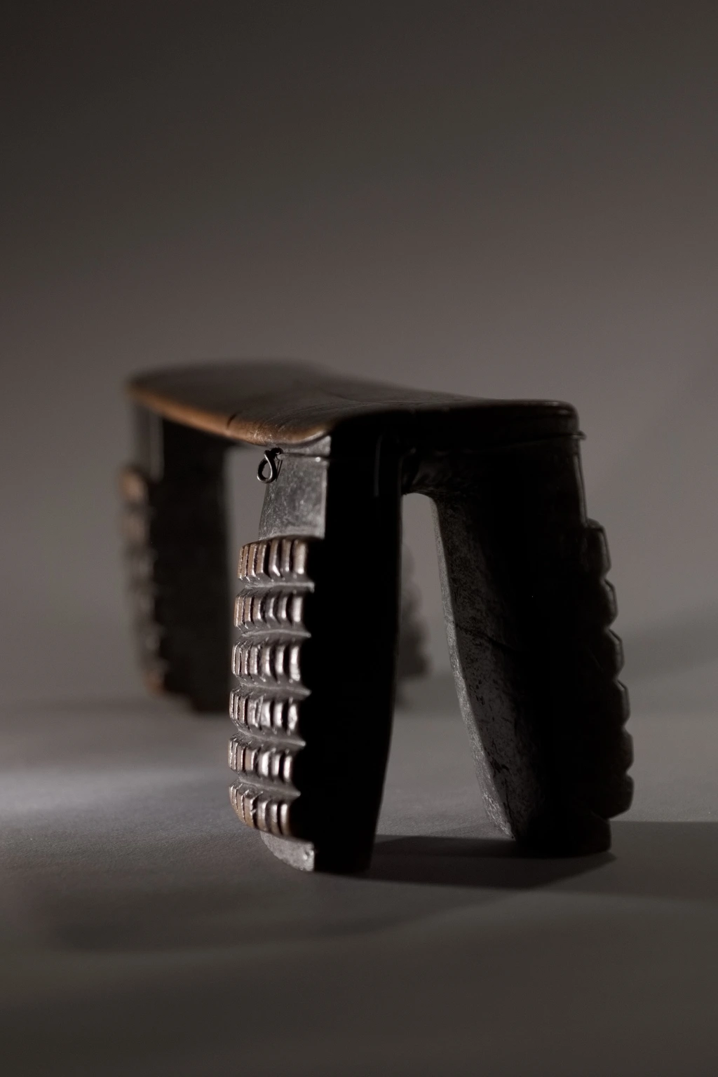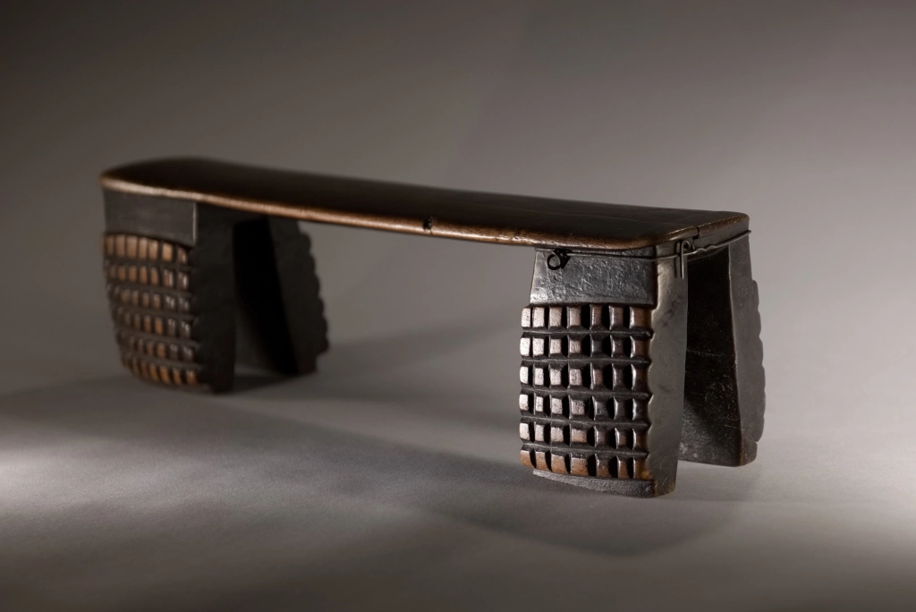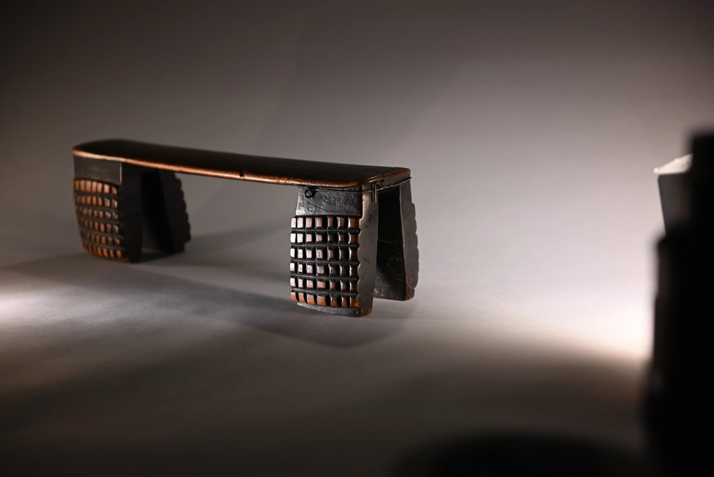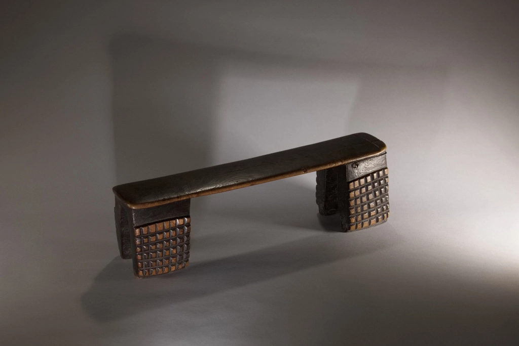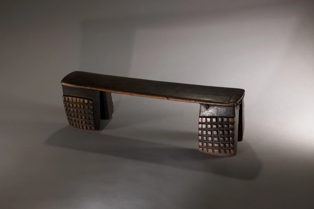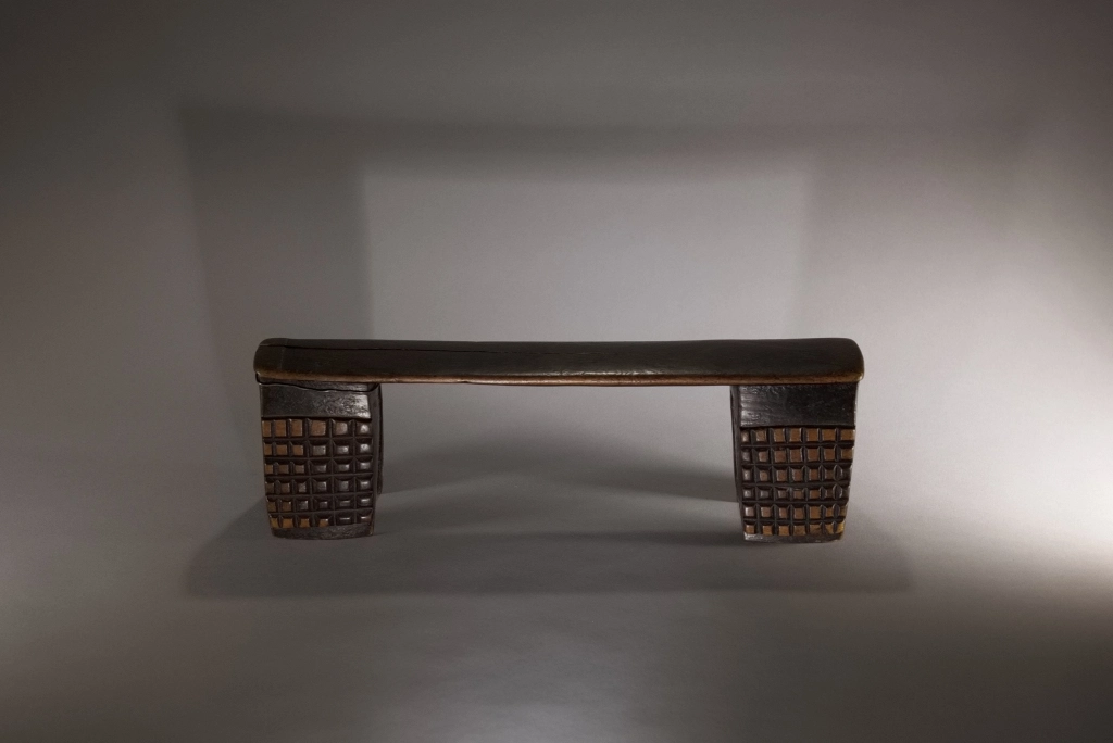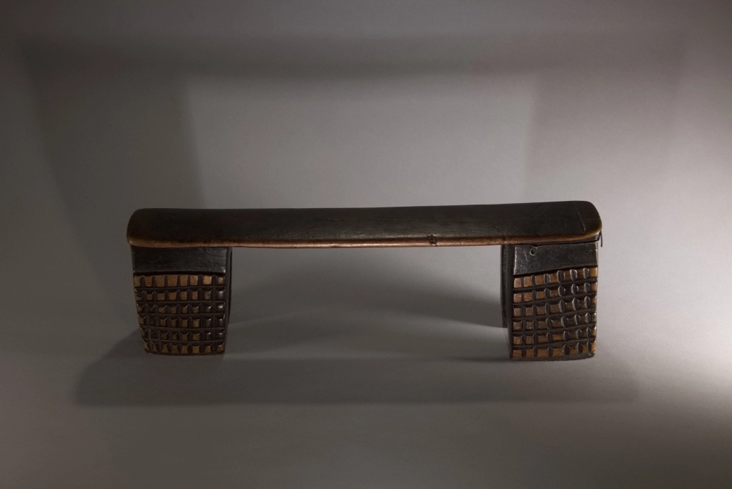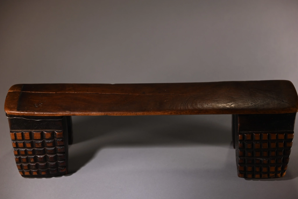 Une nouvelle pièce dont l’attractivité provient de sa réparation locale et artisanale. Un pied étant fendu, il a été maintenu par un cerclage ou fil de fer, aussi efficace que bien dissimulé. Cette originalité n’empêche pas l’appui-tête de mettre en évidence de beaux damiers 6 × 6 d’amasumpa, sur chacun, des 2 × 2 pieds patinés d’un brun chaleureux.