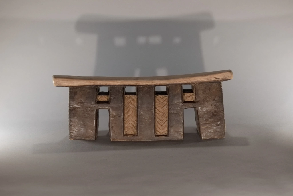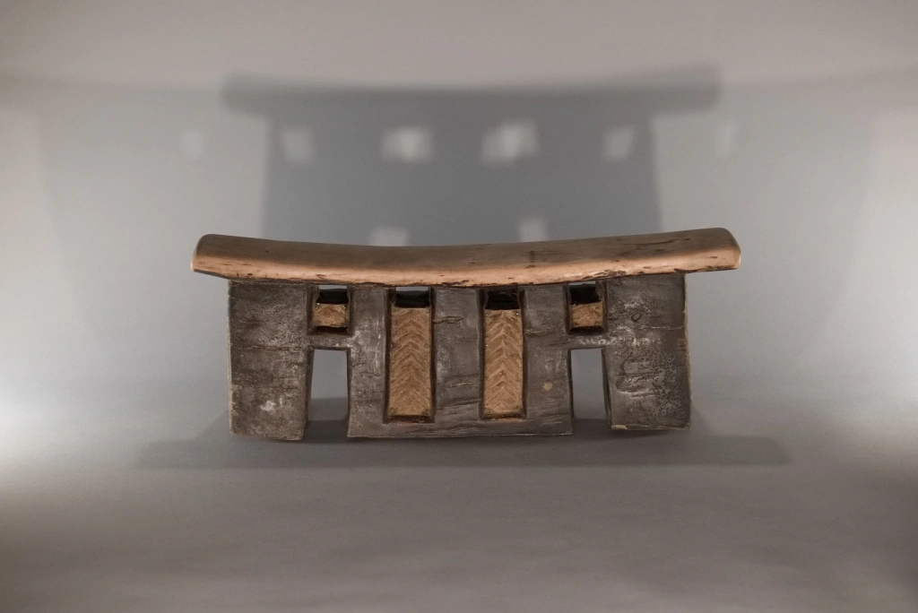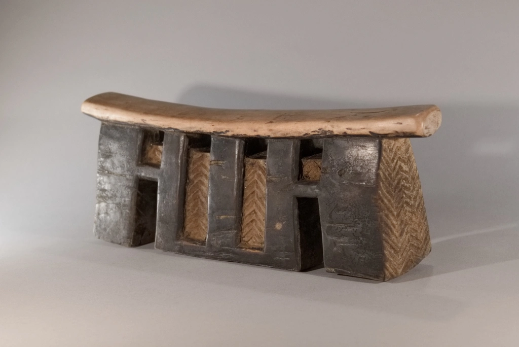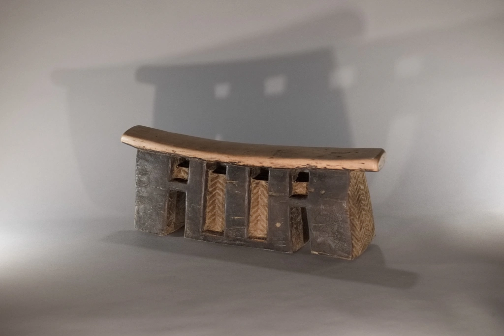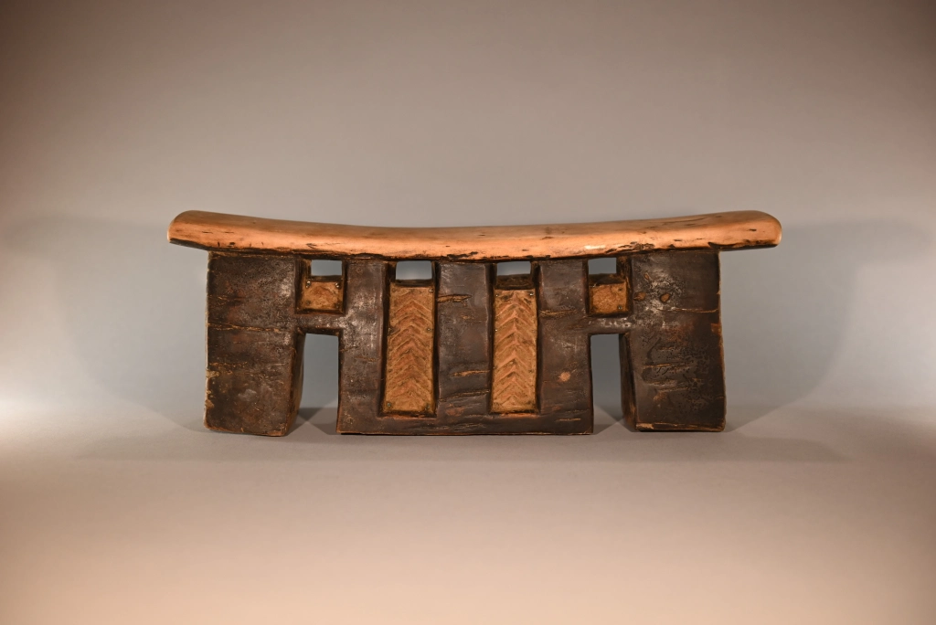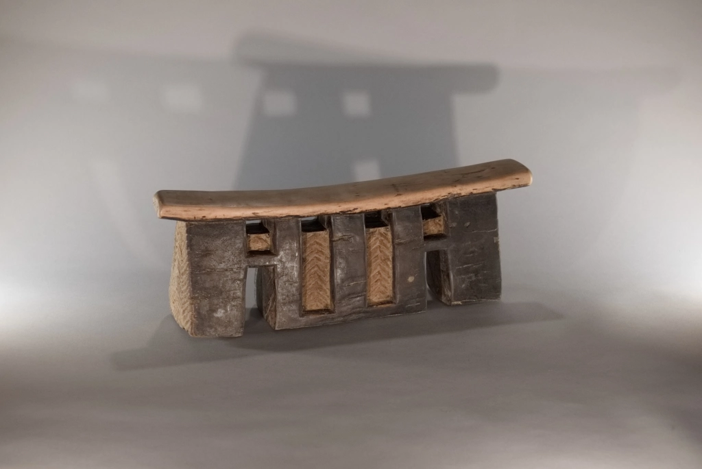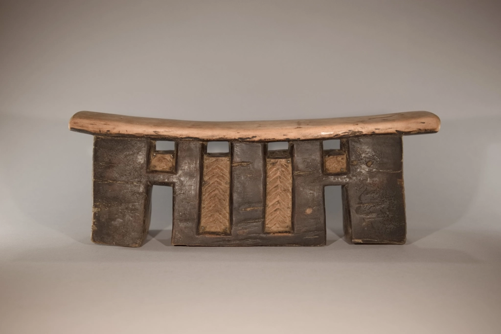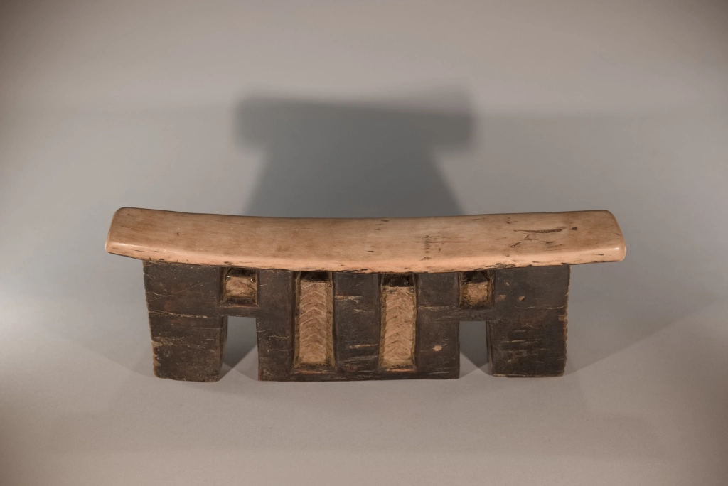 Un appui-tête, initialement propriété du clan Nyambawa donné par le chef du clan à son fils Mangoba dans les années 1930. Comme Z210, cette pièce est passée ensuite entre les mains d’un marchand de Durban et le conservateur du musée de Soweto. D’un point de vue esthétique, elle est également très originale grâce aux différents plans de sa façade : quasiment noir sur la surface extérieure et en bois clair sur le plan en retrait. Cet effet bicolore, renforcé par la plateforme claire, lui donne un cachet indéniable.