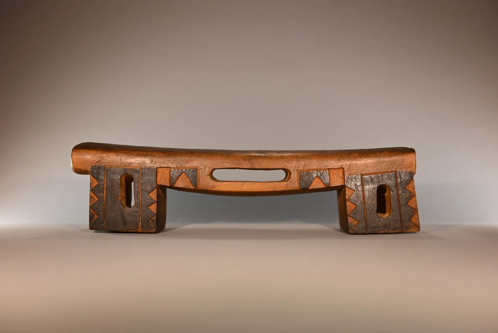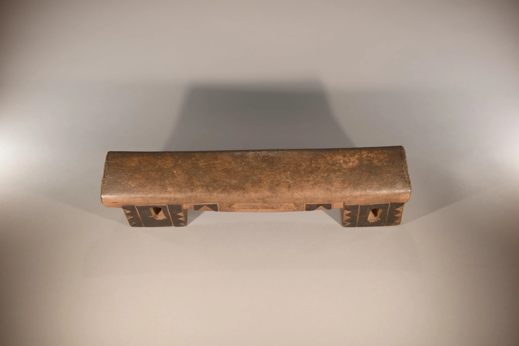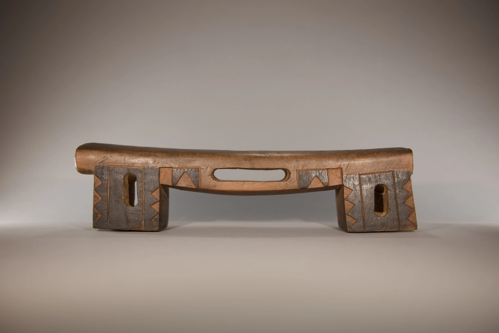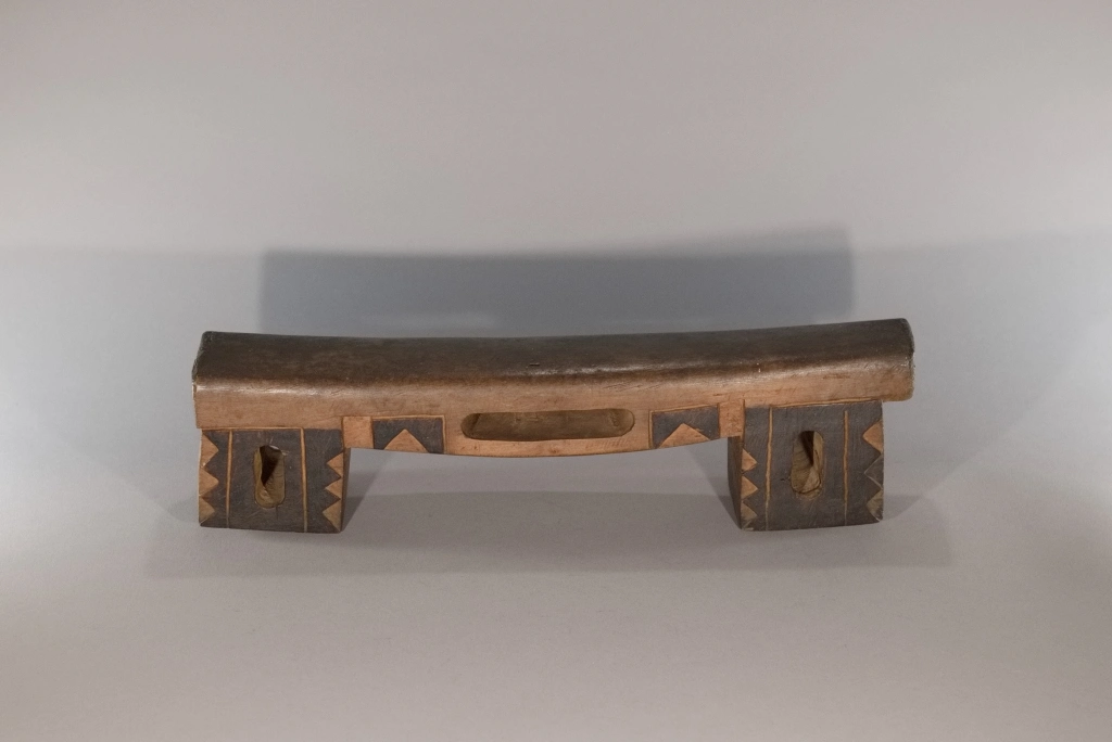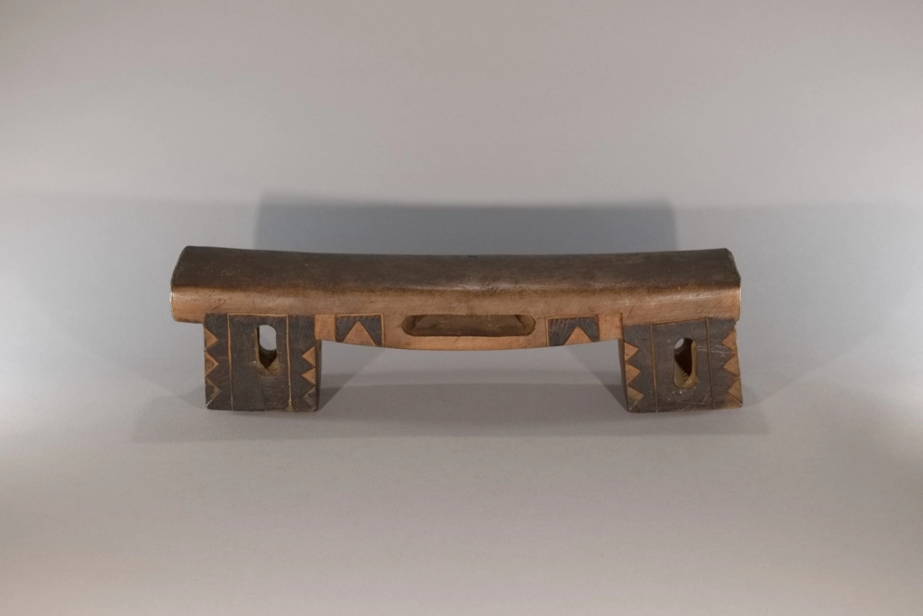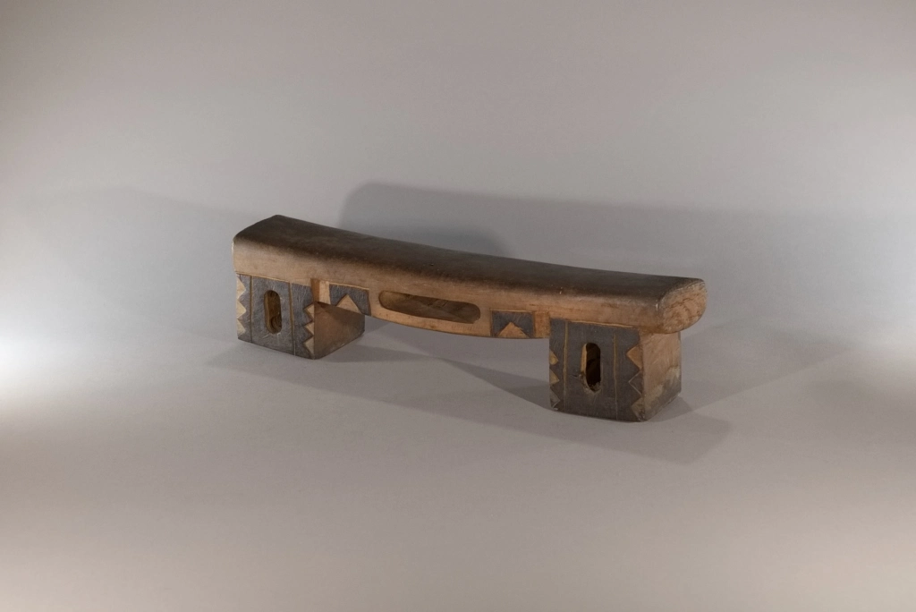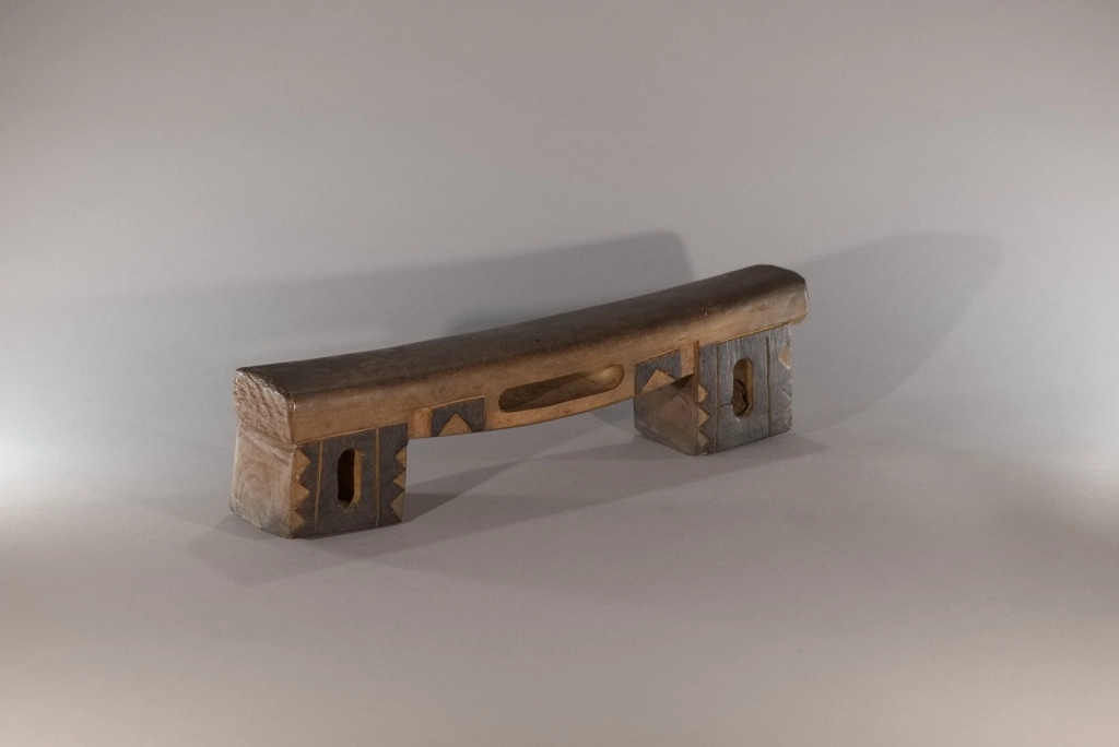 Un appui-tête à deux pieds avec des pyrogravures à chevrons et des découpes ovales inhabituelles.Cet appui-tête a été collecté par Clive Newman en 1999 et a été sculpté par Mosaliya Mahlaba d’Embacane près de Muden à Msinga. Il appartenait à KaMajola Shezi d’Emhlumba et lui avait été offert par le témoin de son mariage en 1982. Cet appui-tête n’a pas non plus été beaucoup utilisé, mais c’est un excellent exemple qui montre que, même s’ils étaient peu utilisés dans les années 1980, les appuis-tête avaient encore une grande importance culturelle. En le lui offrant lors de son mariage, l’umkhongi (témoin/garçon d’honneur) rendait hommage aux coutumes de ses ancêtres. Lors d’un mariage, la mariée devait avoir ou recevoir un appui-tête. Aujourd’hui, cette pratique a presque complètement disparu.