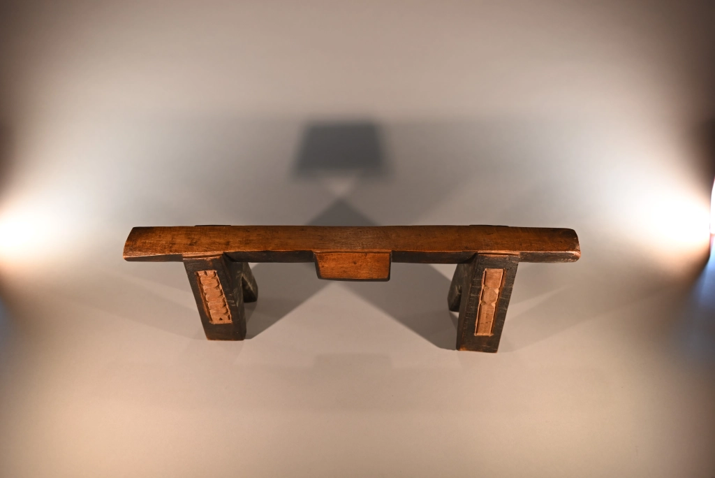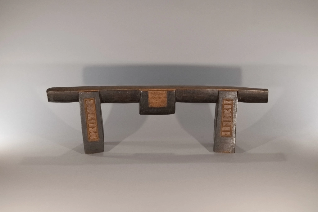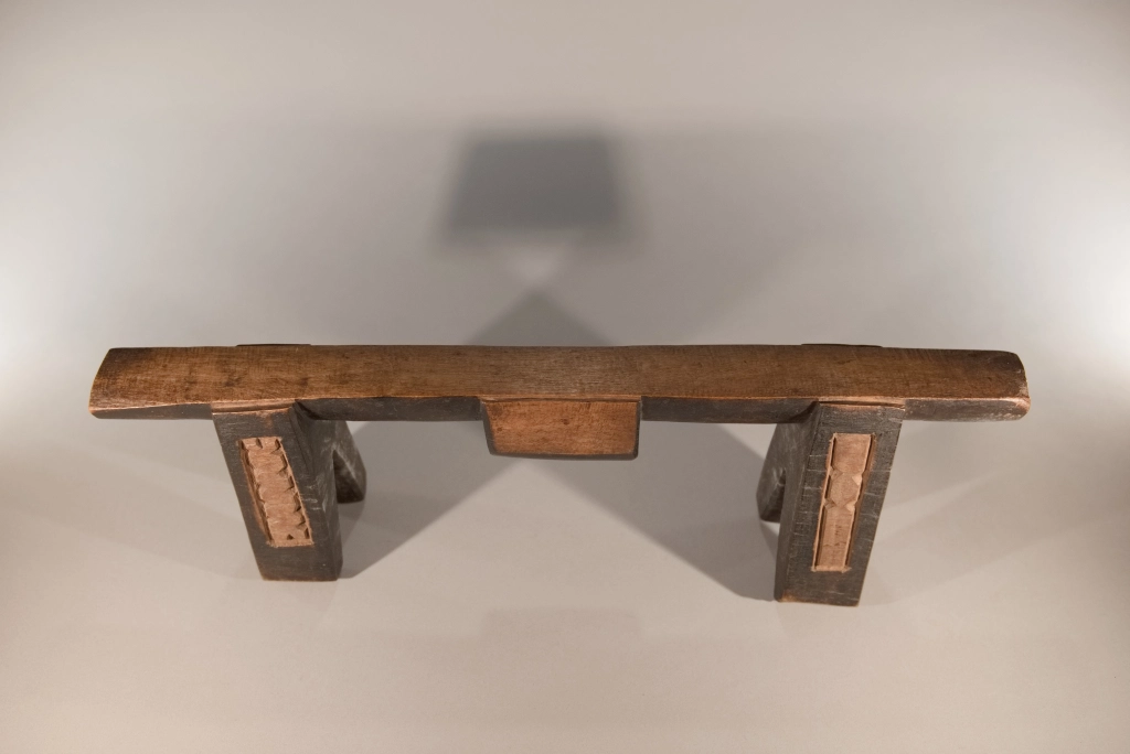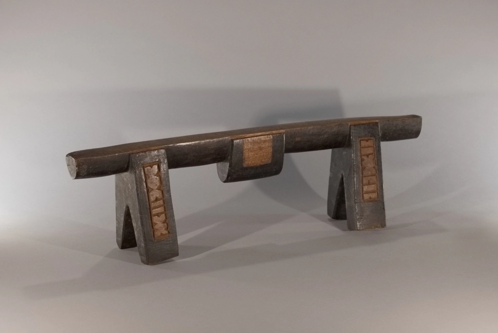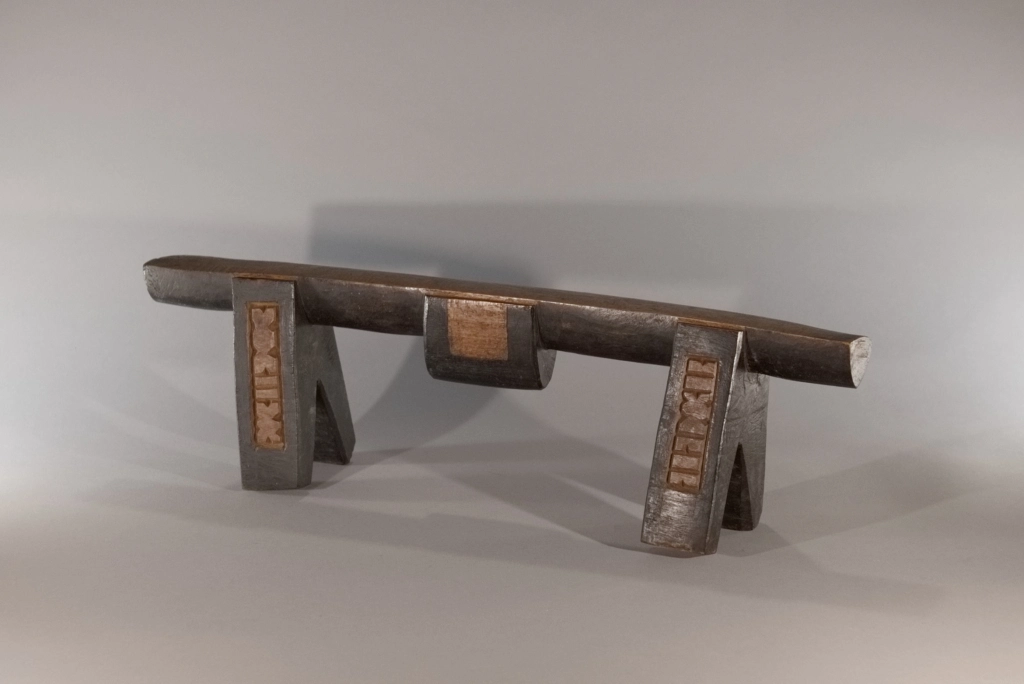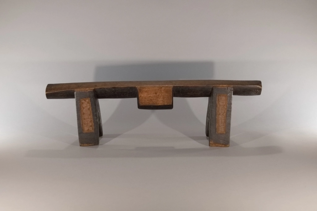 Cet appui-tête à quatre pieds présente des couleurs et des formes intéressantes. Les décorations graphiques sur ses pieds mettent en valeur son plateau couleur miel et le bloc décoratif sur son ergot arrondi.Cet appui-tête à quatre pieds. Il a été collecté par Clive Newman en 2002, il appartenait à MaMbatha Ntshaba d’Emziyonke à Msinga, qui l’avait acquis lors de son mariage à la fin des années 1970. Elle ne l’a utilisé que pendant quelques années, car lorsqu’elle a eu un lit, elle l’a remplacé par un oreiller.