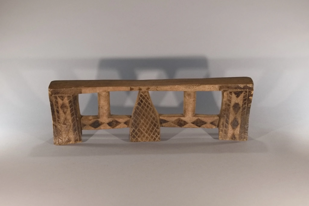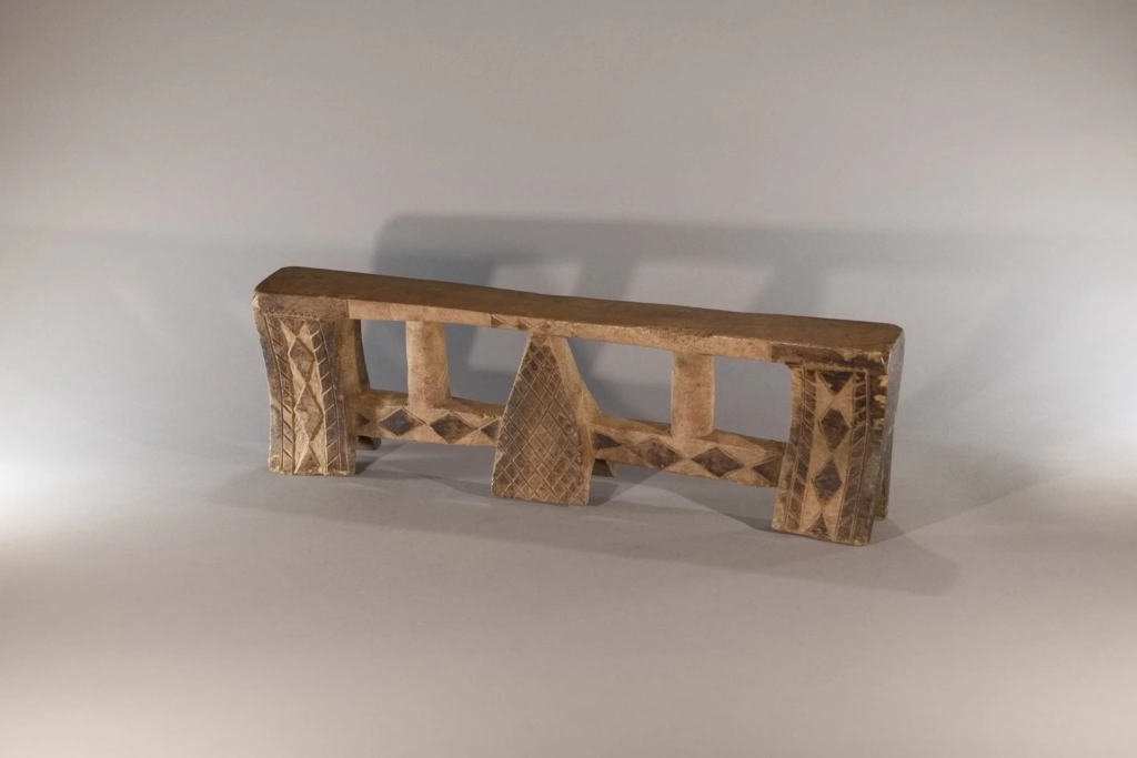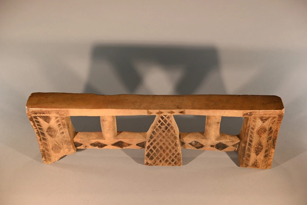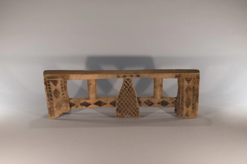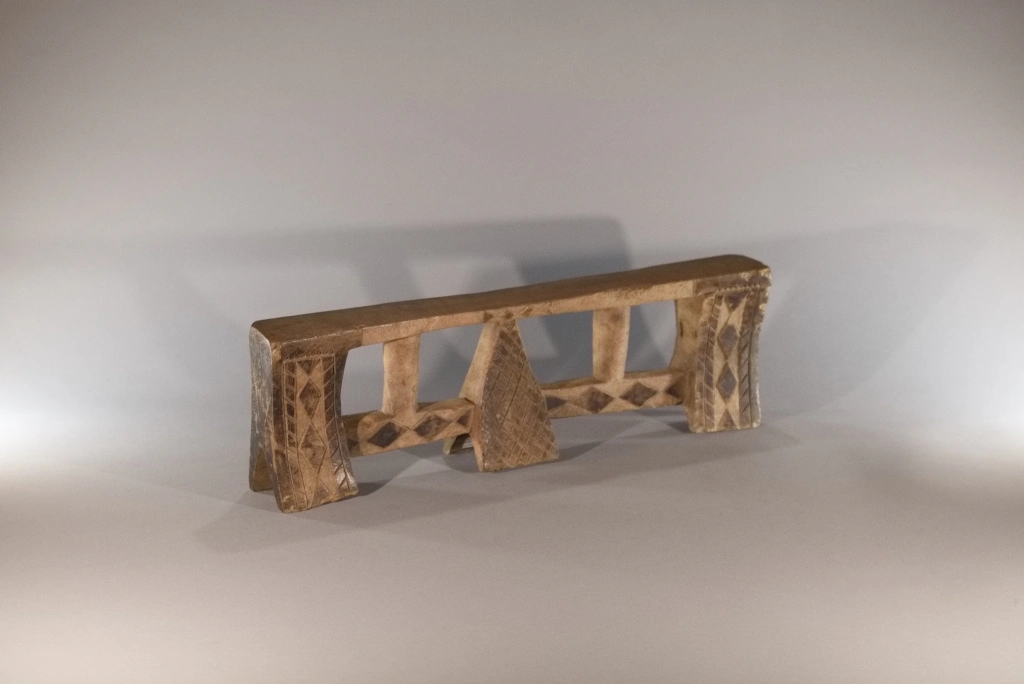 Cet appui-tête a été collecté par Clive Newman dans la région de Bergville en 2005. Il a été sculpté par Mandla Hlongwane d’Embizeni, dans cette même région, au pied des montagnes du Drakensberg. Il est typique du style d’appui-tête de cette région où le pied central est de forme pyramidale et relié aux pieds extérieurs par des contreforts. Dans ce cas, les contreforts sont également reliés à la plate-forme par de fines colonnes arrondies.Il appartenait à MaBhengu Shabalala d’Emafemfetheni. Elle est née en 1948 et s’est mariée en 1966, mais n’a pas beaucoup utilisé l’appui-tête après qu’elle soit devenue catholique. Elle ne l’utilisait que lorsqu’elle était une nouvelle mariée et qu’elle portait un isicholo. Par conséquent, même s’il n’est pas très usé, il a près de 60 ans et reste une pièce magnifiquement sculptée et décorée en très bon état, à l’exception de quelques dégâts causés par des rongeurs sur le côté de la plate-forme. On notera une inscription sous le pied: « A1357 c 1966 Mandla Hlongwane Embizeni, Emaswezini maBhenga Shabalalala, Emefefehi