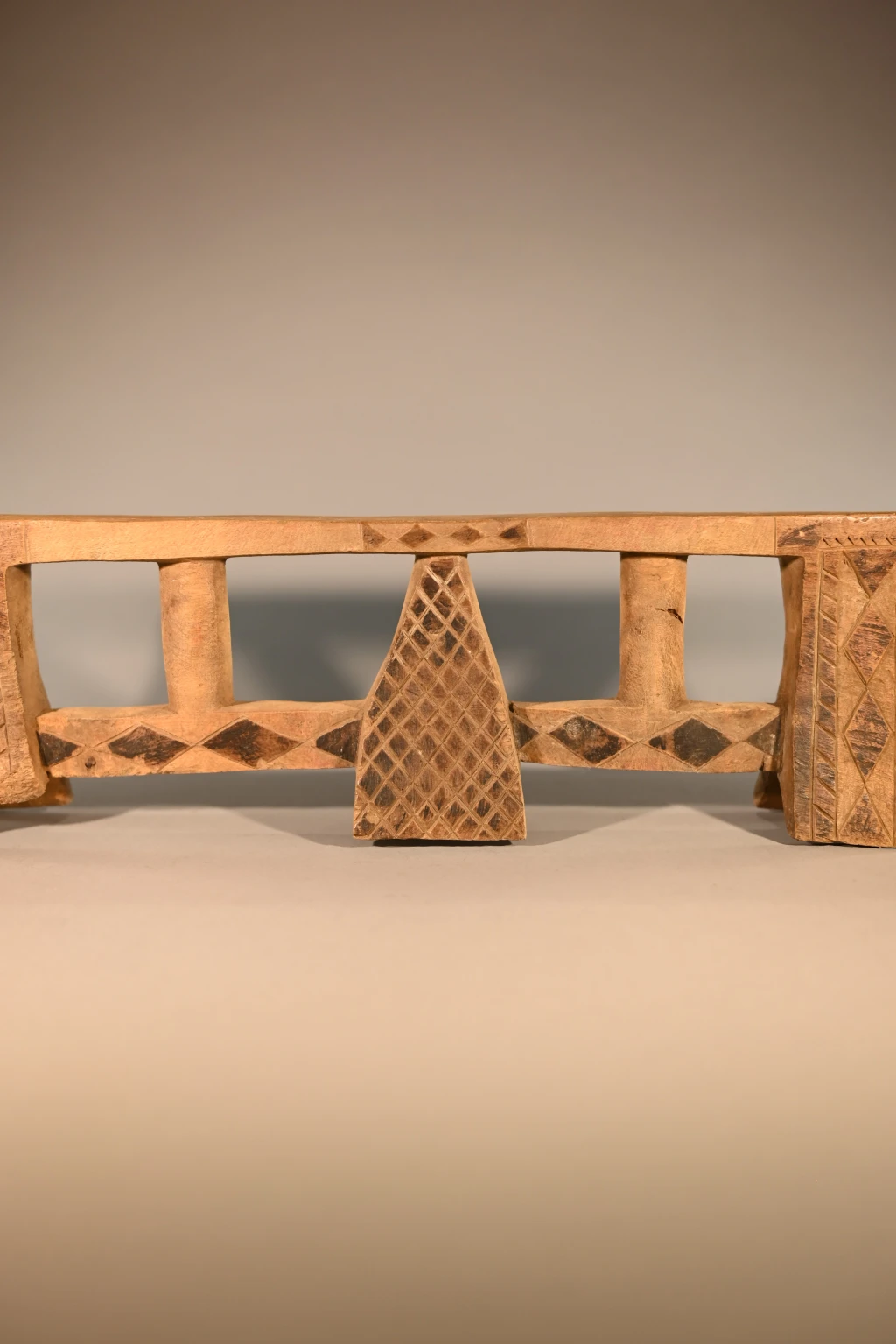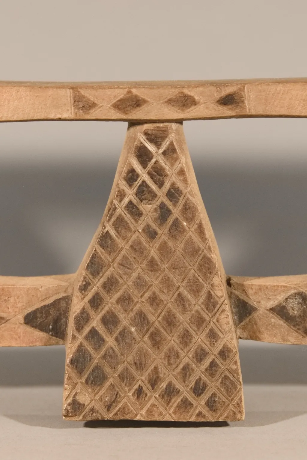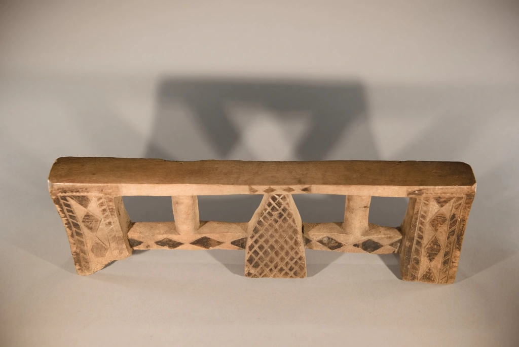 Cet appui-tête a été collecté par Clive Newman dans la région de Bergville en 2005. Il a été sculpté par Mandla Hlongwane d’Embizeni, dans cette même région, au pied des montagnes du Drakensberg. Il est typique du style d’appui-tête de cette région où le pied central est de forme pyramidale et relié aux pieds extérieurs par des contreforts. Dans ce cas, les contreforts sont également reliés à la plate-forme par de fines colonnes arrondies.Il appartenait à MaBhengu Shabalala d’Emafemfetheni. Elle est née en 1948 et s’est mariée en 1966, mais n’a pas beaucoup utilisé l’appui-tête après qu’elle soit devenue catholique. Elle ne l’utilisait que lorsqu’elle était une nouvelle mariée et qu’elle portait un isicholo. Par conséquent, même s’il n’est pas très usé, il a près de 60 ans et reste une pièce magnifiquement sculptée et décorée en très bon état, à l’exception de quelques dégâts causés par des rongeurs sur le côté de la plate-forme. On notera une inscription sous le pied: « A1357 c 1966 Mandla Hlongwane Embizeni, Emaswezini maBhenga Shabalalala, Emefefehi