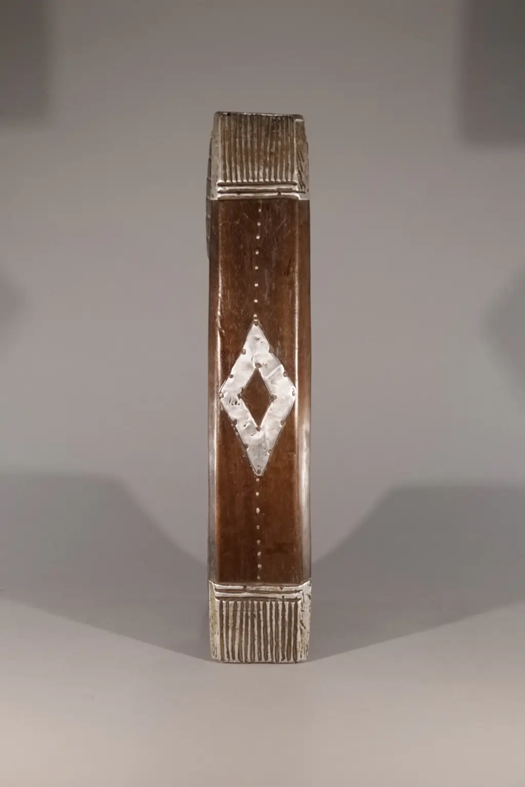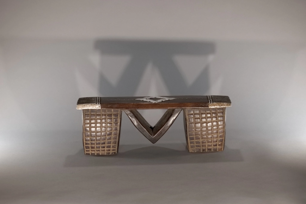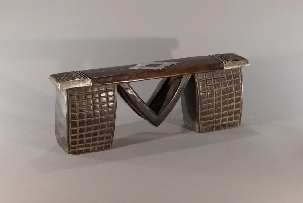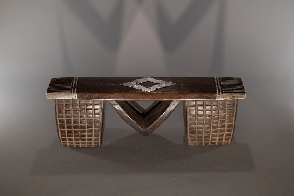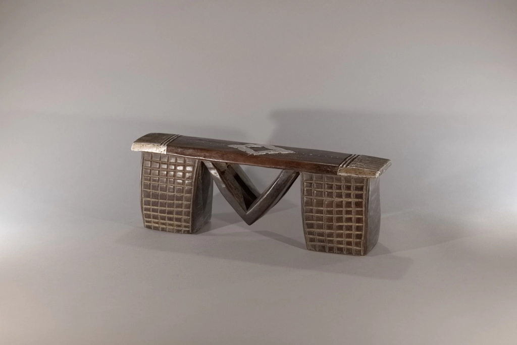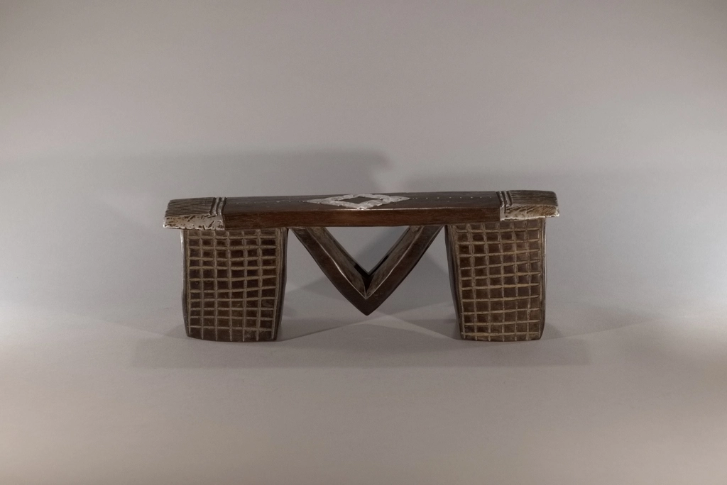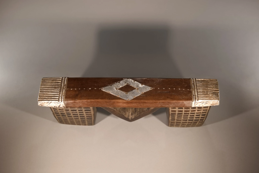 Un appui-tête, massif aux pieds robustes décorés par un amasumpa extrêmement régulier et supportant un triangle pointé en bas à la mode swazi. On peut noter les extrémités de la plateforme recouverte de feuilles d’aluminium afin de protéger l’appui-tête des coups et marques et ainsi, maintenir l’esthétique de la pièce. Un losange décoratif en aluminium a été engravé au milieu de la plate-forme.