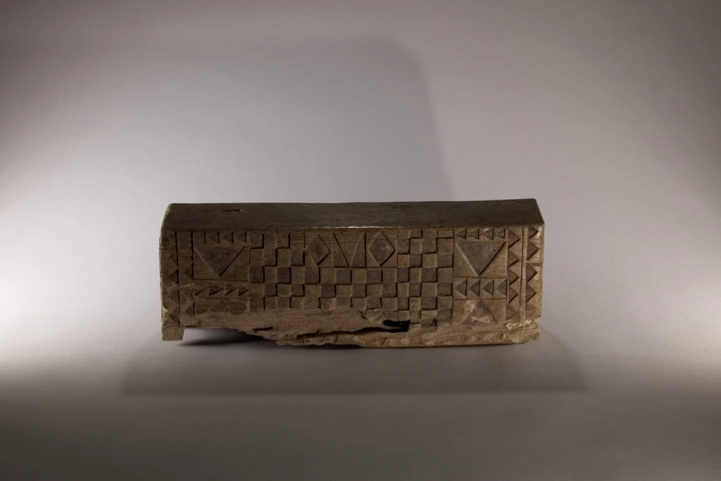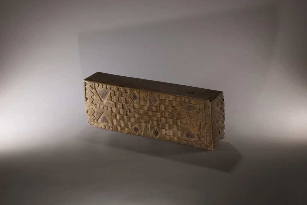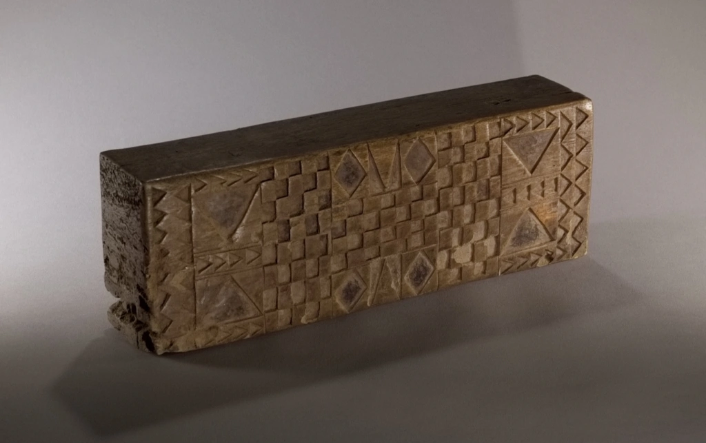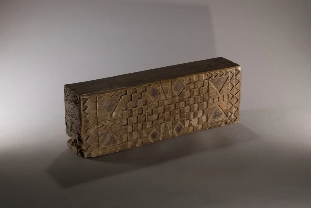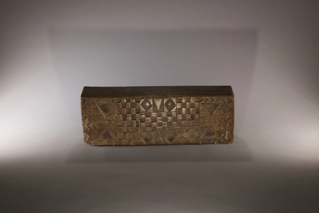 Un bloc en bois léger et superbement décoré d’engravures en damier et en triangles petits et grands, créant deux faces superbes, sculptées par un artiste techniquement compétent. L’une des deux faces est largement érodée en sa base, probablement rongée par l’humidité du sol, suite aux longues pluies d’hiver.