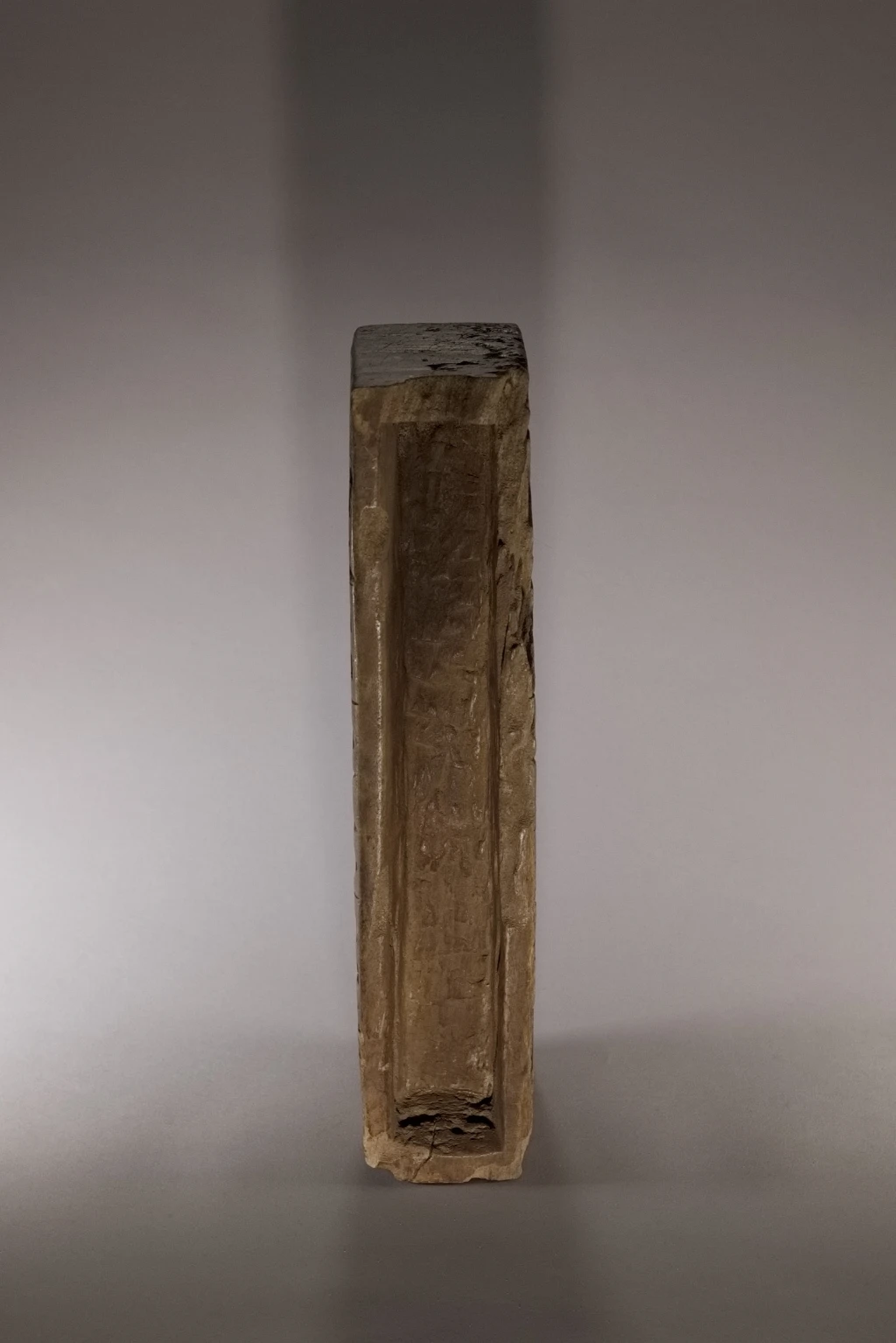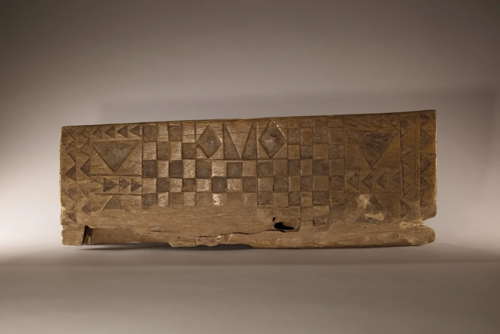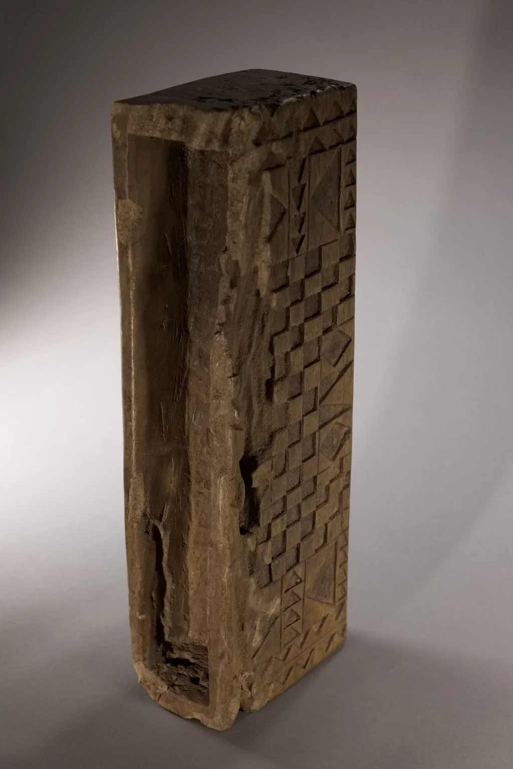 Un bloc en bois léger et superbement décoré d’engravures en damier et en triangles petits et grands, créant deux faces superbes, sculptées par un artiste techniquement compétent. L’une des deux faces est largement érodée en sa base, probablement rongée par l’humidité du sol, suite aux longues pluies d’hiver.
