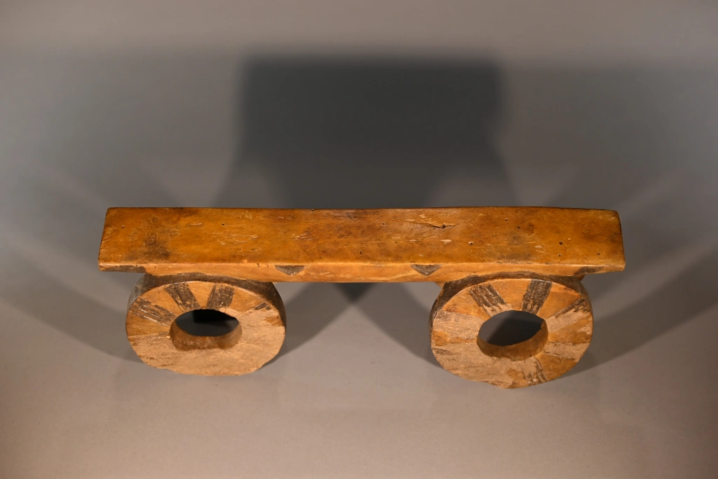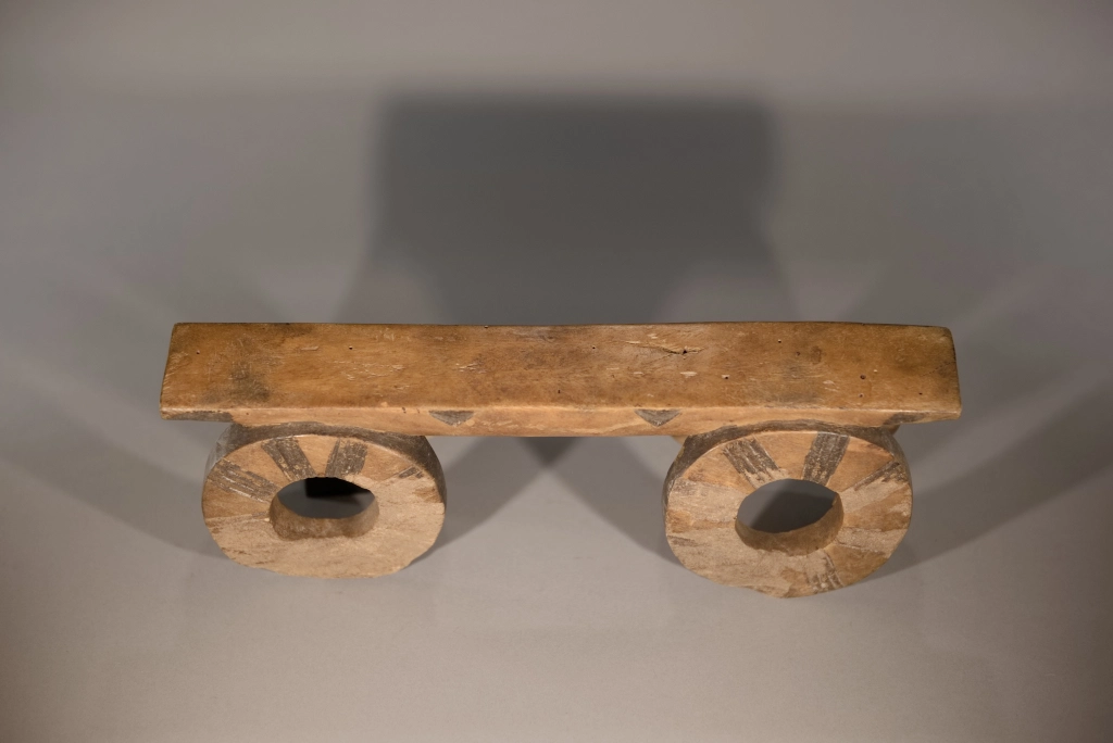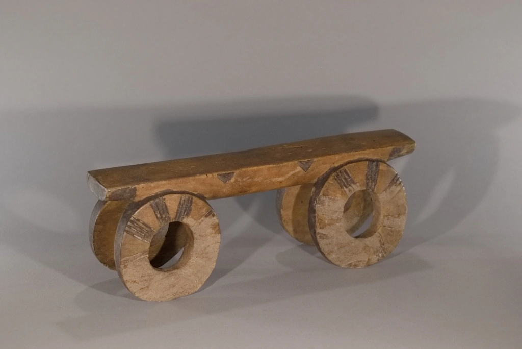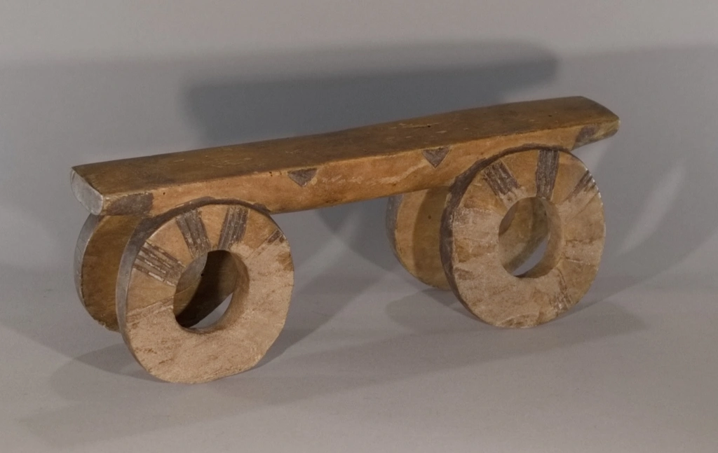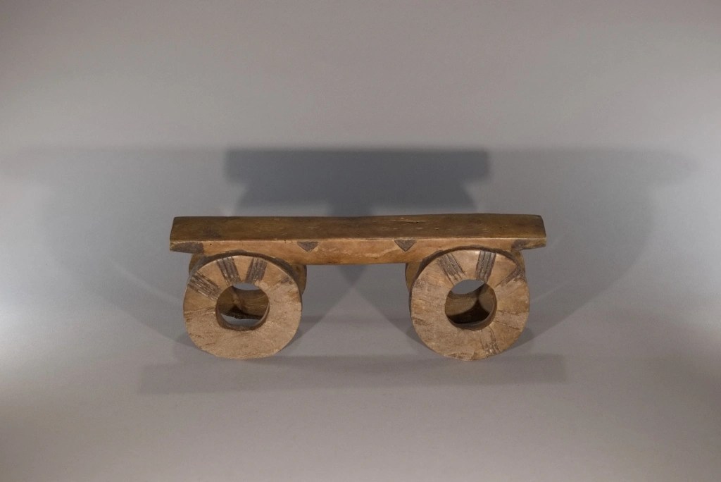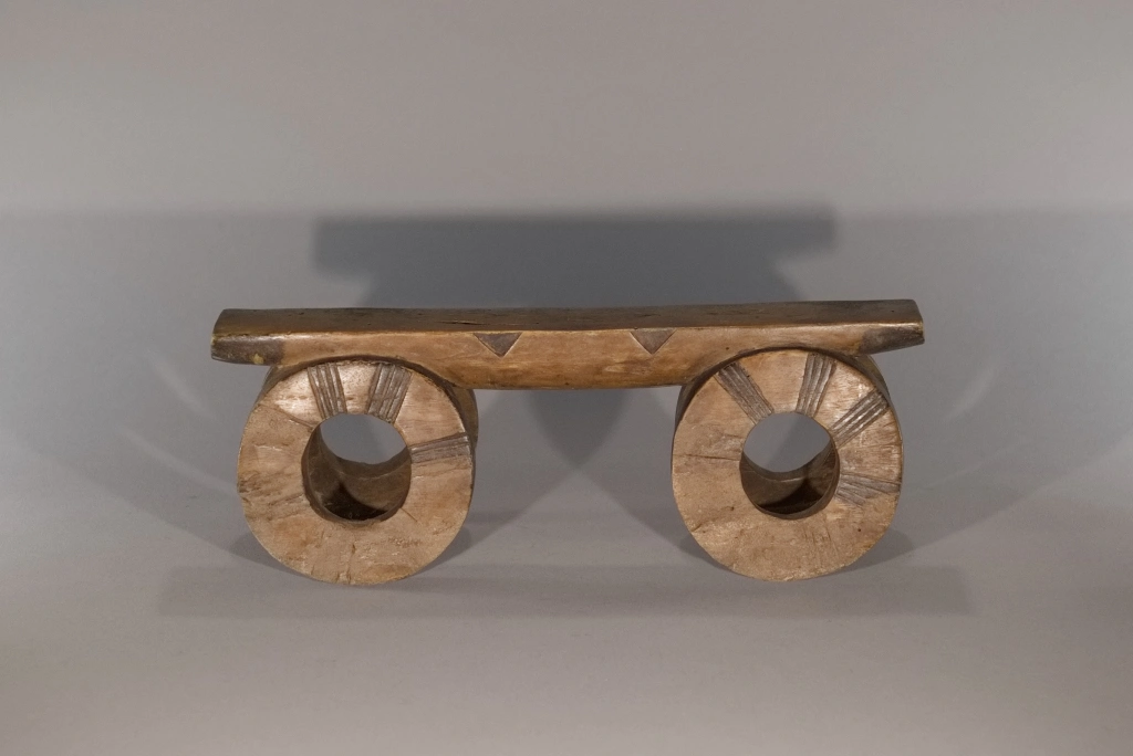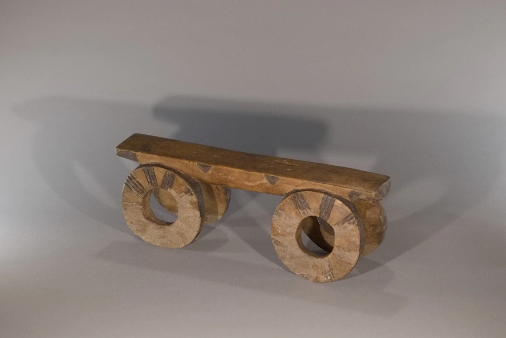 Les appuis-tête avec des motifs de « roues » sont assez fréquents, mais sont sculptés dans une variété de styles qui ne semblent pas toujours être liés les unes aux autres. Les premiers exemples du nord de la région Nguni de la collection de la Johannesburg Art Gallery présentent des formes circulaires dans des compositions abstraites qui ne ressemblent en rien aux moyens de transport à roues usuels.Cette pièce est indéniablement de la même main que le sculpteur de l’appui-tête de l’American Museum of Natural History (pièce 17/104) de New York. Les presque deux siècles et demi ont laissé des traces sur la partie basse des quatre roues qui ont dû rester sur des terrains trop humides plusieurs années. Mais ces marques du temps et du vécu de la pièce, la rendent particulièrement attachante et en font son charme.