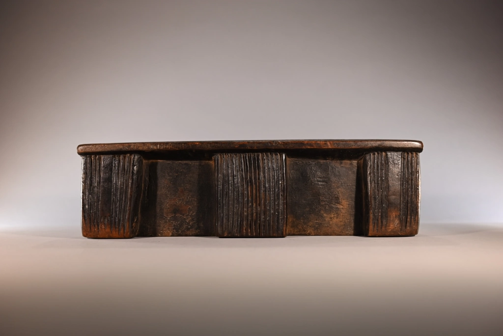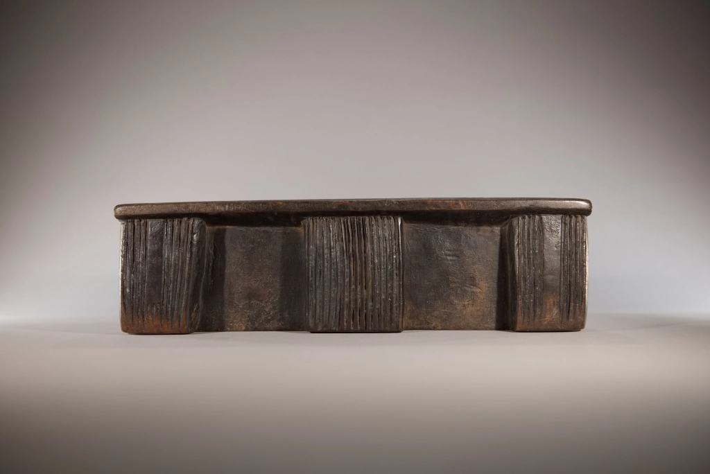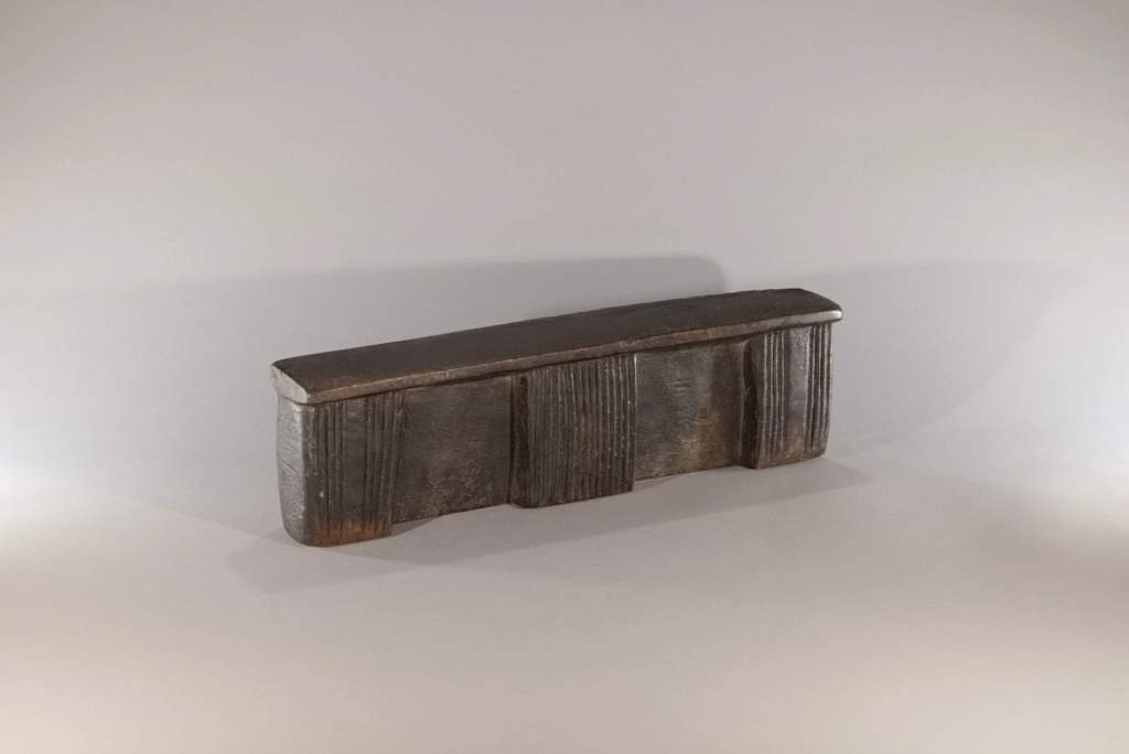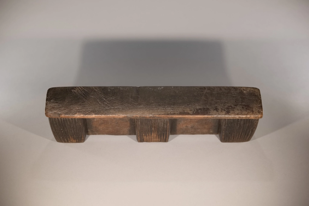 Un bloc Msinga, massif en bois dur et à la patine extrêmement foncée. Son caractère massif est contrebalancé par 3 pieds saillants décorés de 11 à 14 très fines cannelures donnant force et légèreté à ce bel appui-tête.