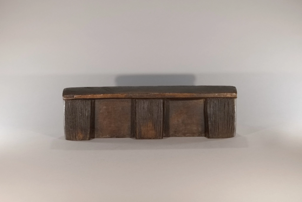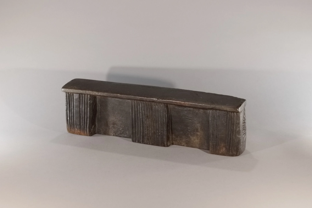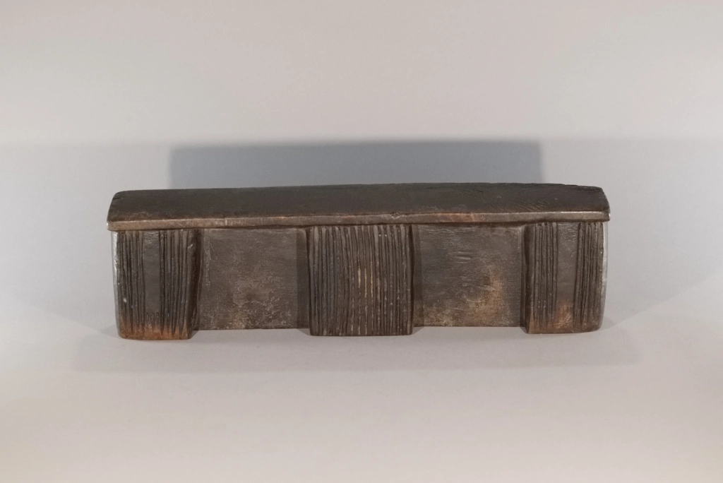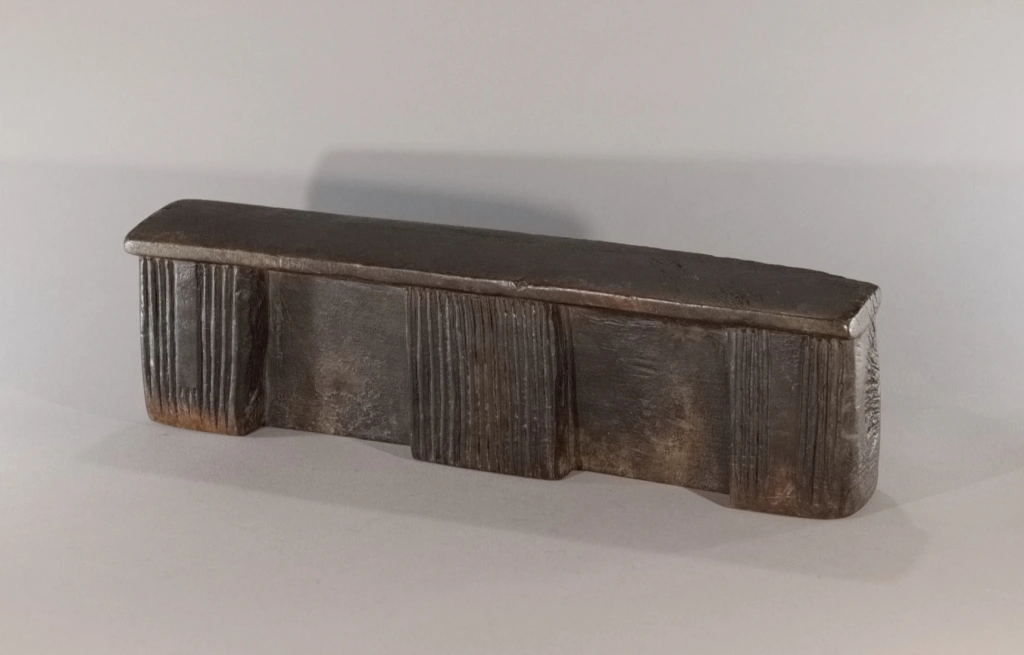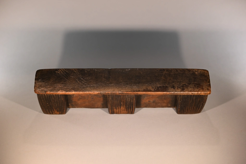 Un bloc Msinga, massif en bois dur et à la patine extrêmement foncée. Son caractère massif est contrebalancé par 3 pieds saillants décorés de 11 à 14 très fines cannelures donnant force et légèreté à ce bel appui-tête.