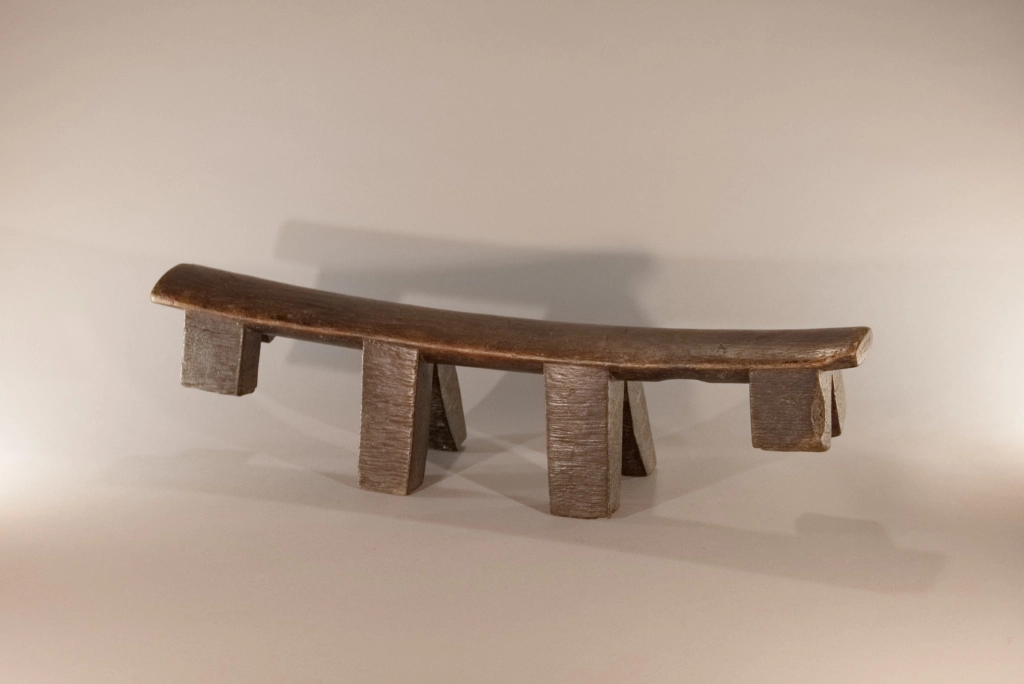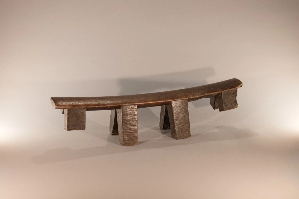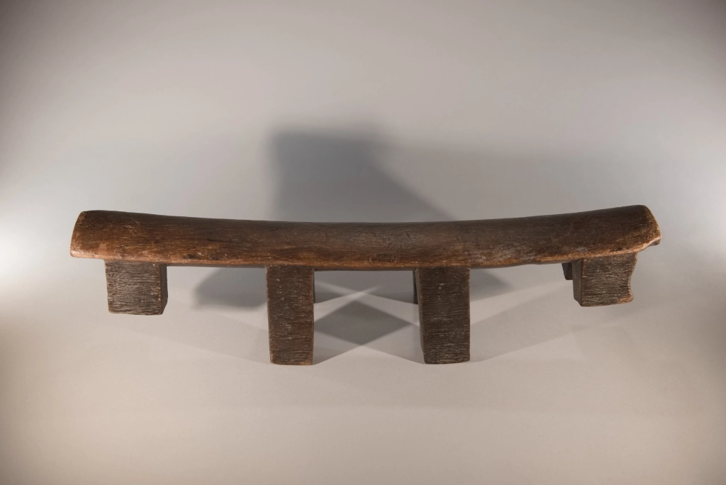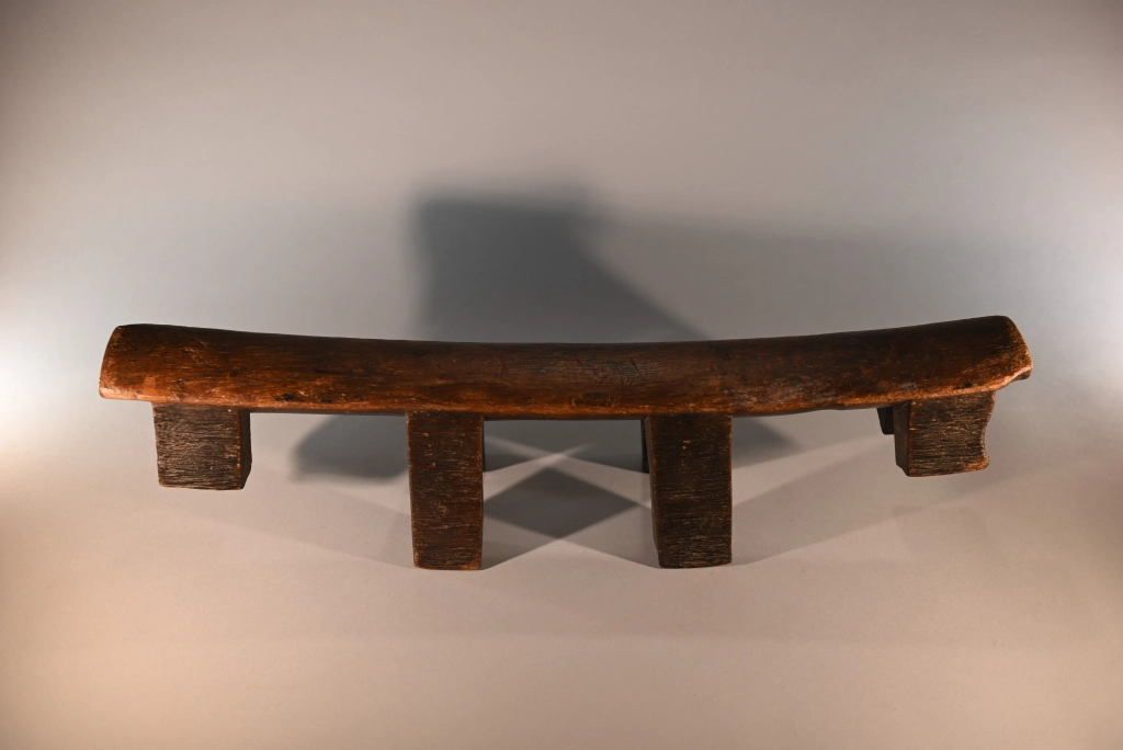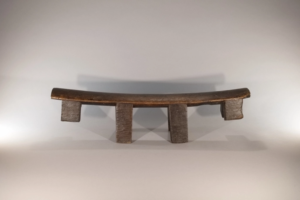 Une pièce imposante de près de 60 cm de long, sa plateforme longue et courbée est supportée par quatre paires de pieds classiques et non décorés, mais seulement marqués par de multiples entailles, montrant presque 1 siècle d’utilisation. Depuis, les deux paires de pieds extérieurs ont été cassées, sans néanmoins que l’utilisation de l’appui-tête n’en soit réduite. Il faut cependant maintenir sa tête au centre de la plateforme au risque de se réveiller en sursaut.