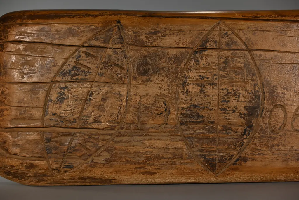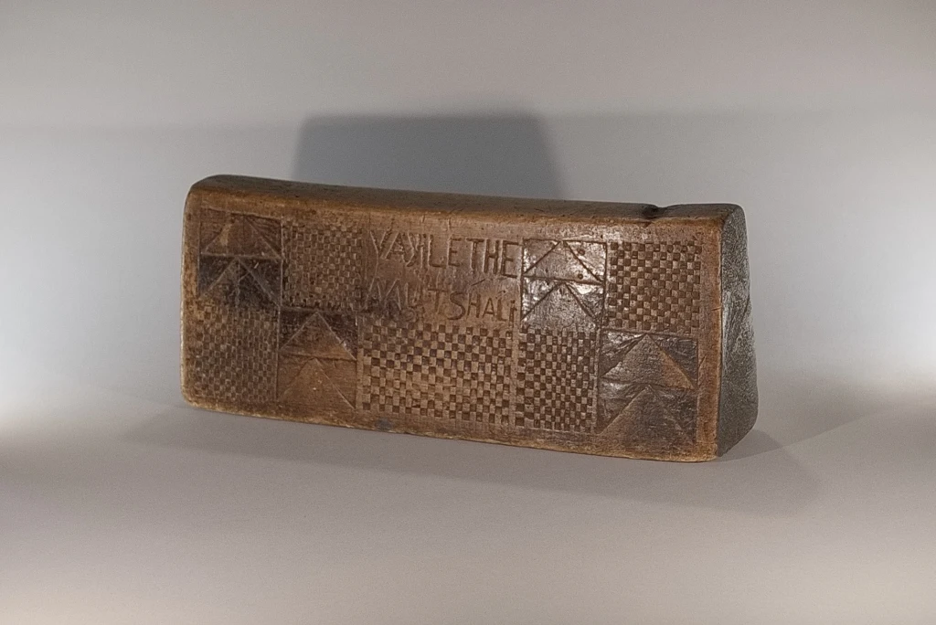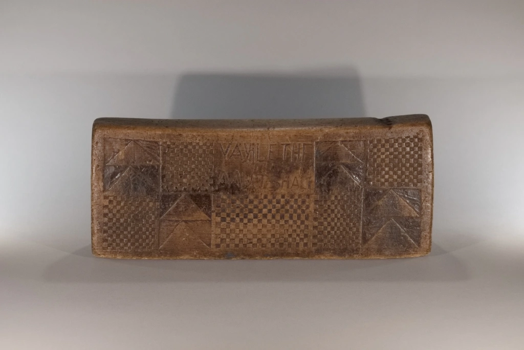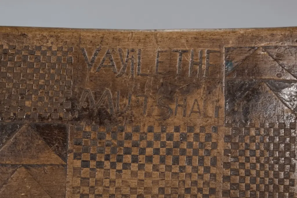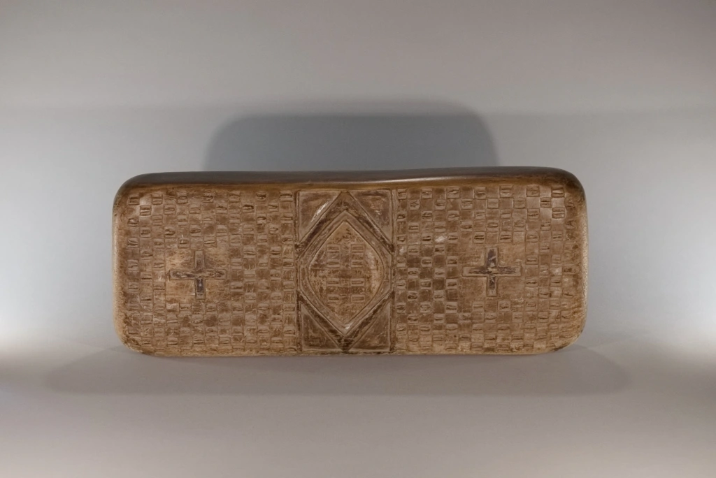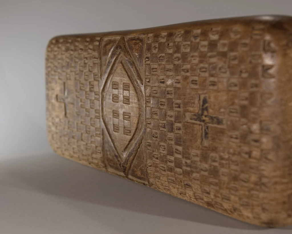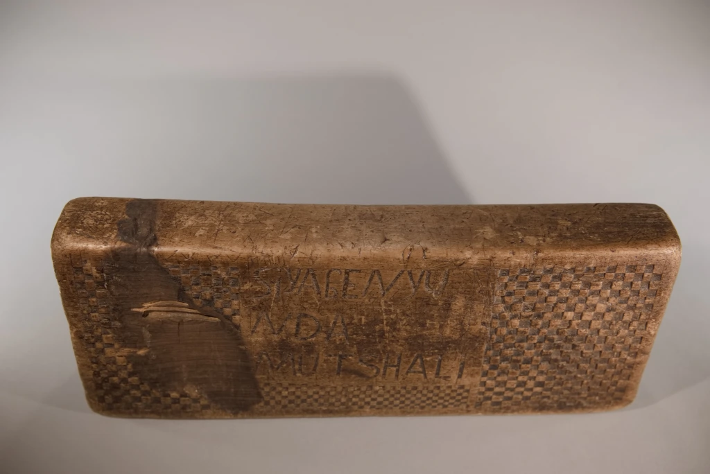 Un bloc en bois léger provenant de figuiers, bois avec lequel on fabrique le balsa. Il est décoré classiquement avec des damiers et des triangles de tailles différentes et est gravé au nom de sa première propriétaire, au début du XXe siècle : Siyabe Nyunda Mutshali. L’une des faces est restée trop longtemps contre terre ce qui l’a détérioré ajoutant aux marques laissées par l’utilisation quotidienne de cet appui-tête pendant plus d’un siècle.